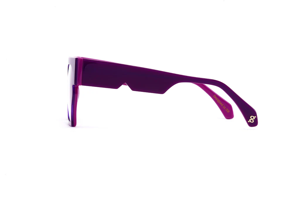 A translucent purple set on top of pink acetate, creates a distinctive and vibrant colour front on, where pink can be seen on the inside. This colour combination is one of a kind. Grey monochrome lens