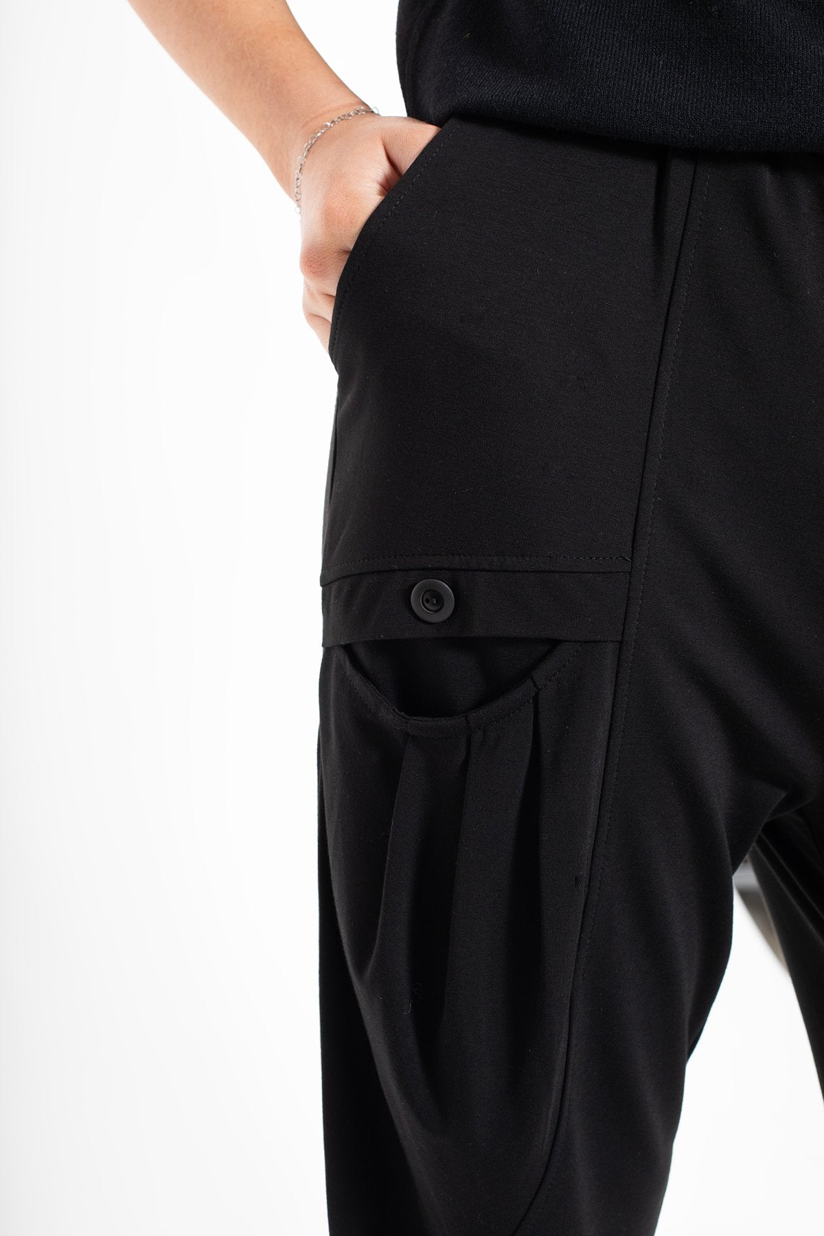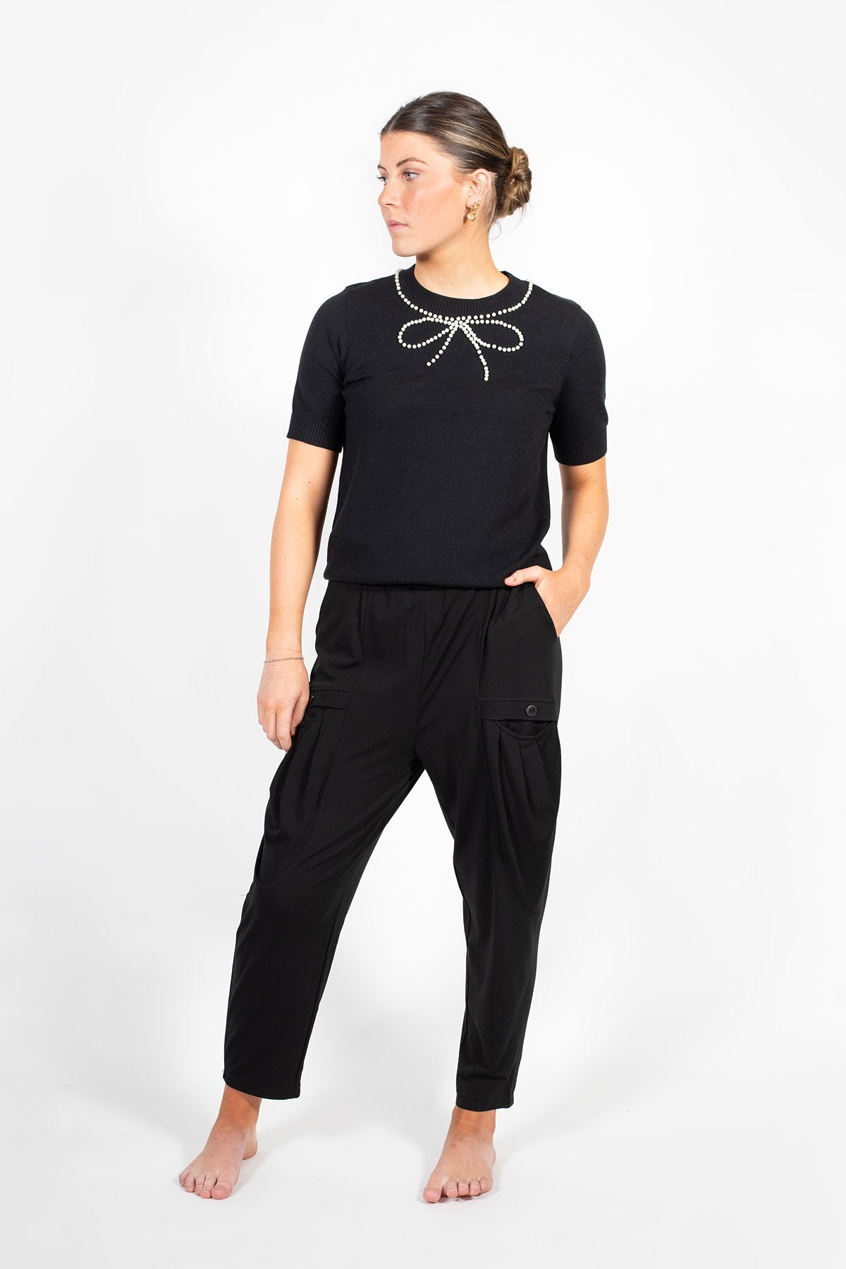 Easy throw-on black pants with elasticated waist and pleated front patch pockets. So good!