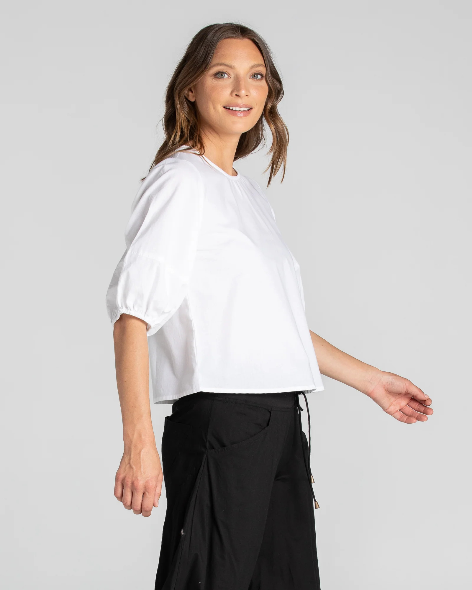 The Boom Shankar Ava Top is your new essential! This cropped length top in 100% cotton is comfortable and easy-to-wear throughout the seasons. The puff sleeve detail adds a touch of fun to this classic design.