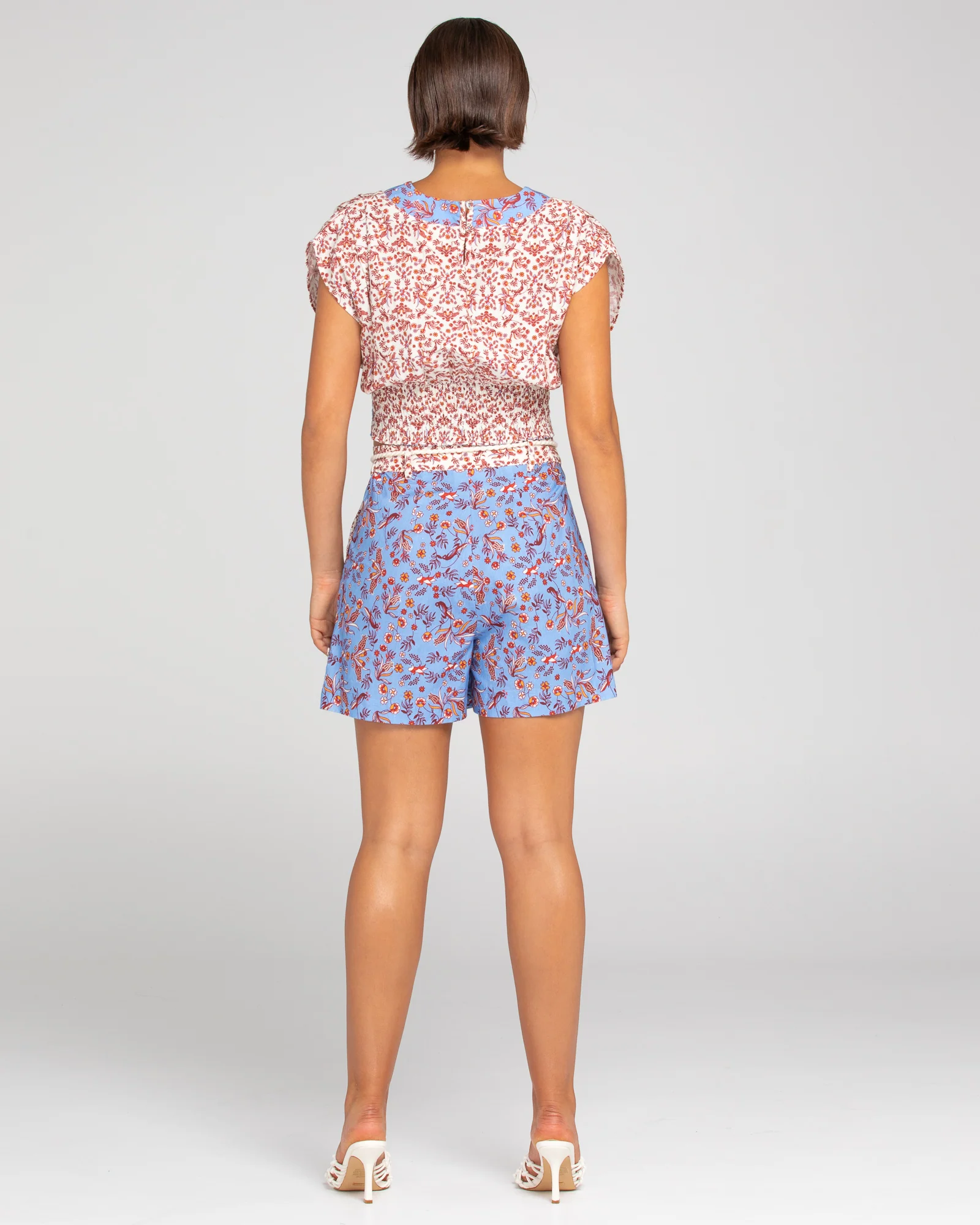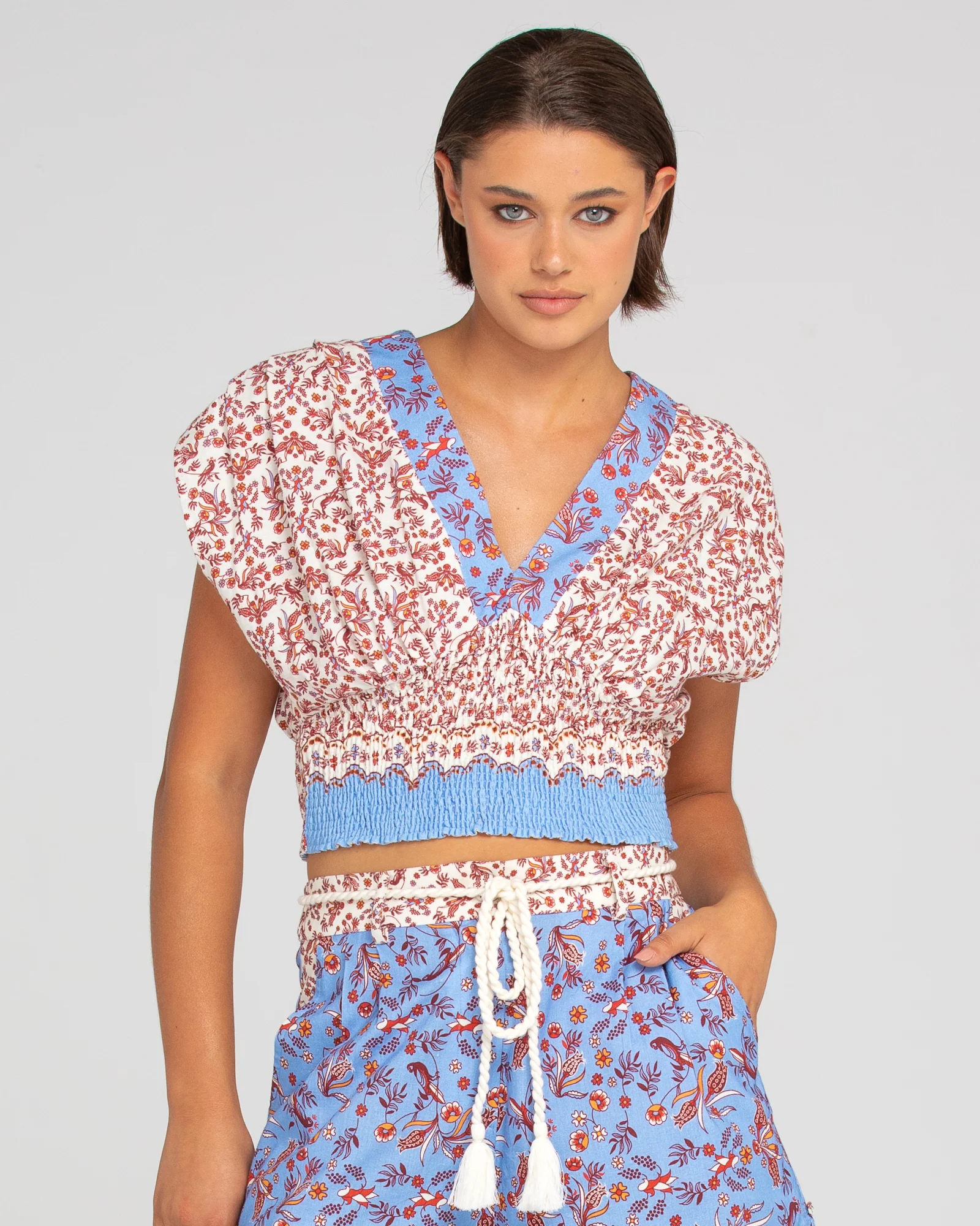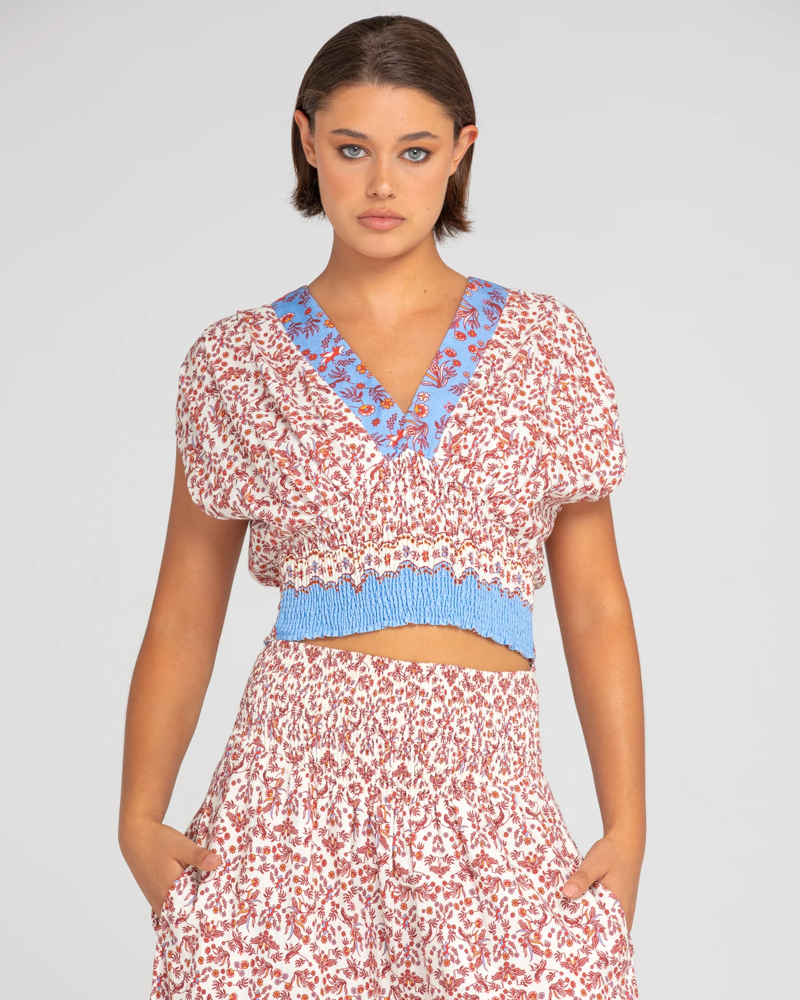 100% cotton, deep V-neck, short loose cap sleeves with slight gathering on the shoulders, shirred elastic waistband that comes up into a peek just underneath the bust, cropped length with a contrast print hem.