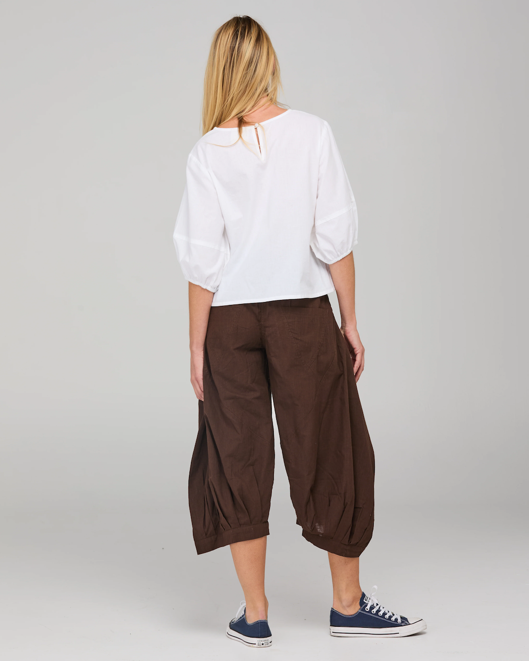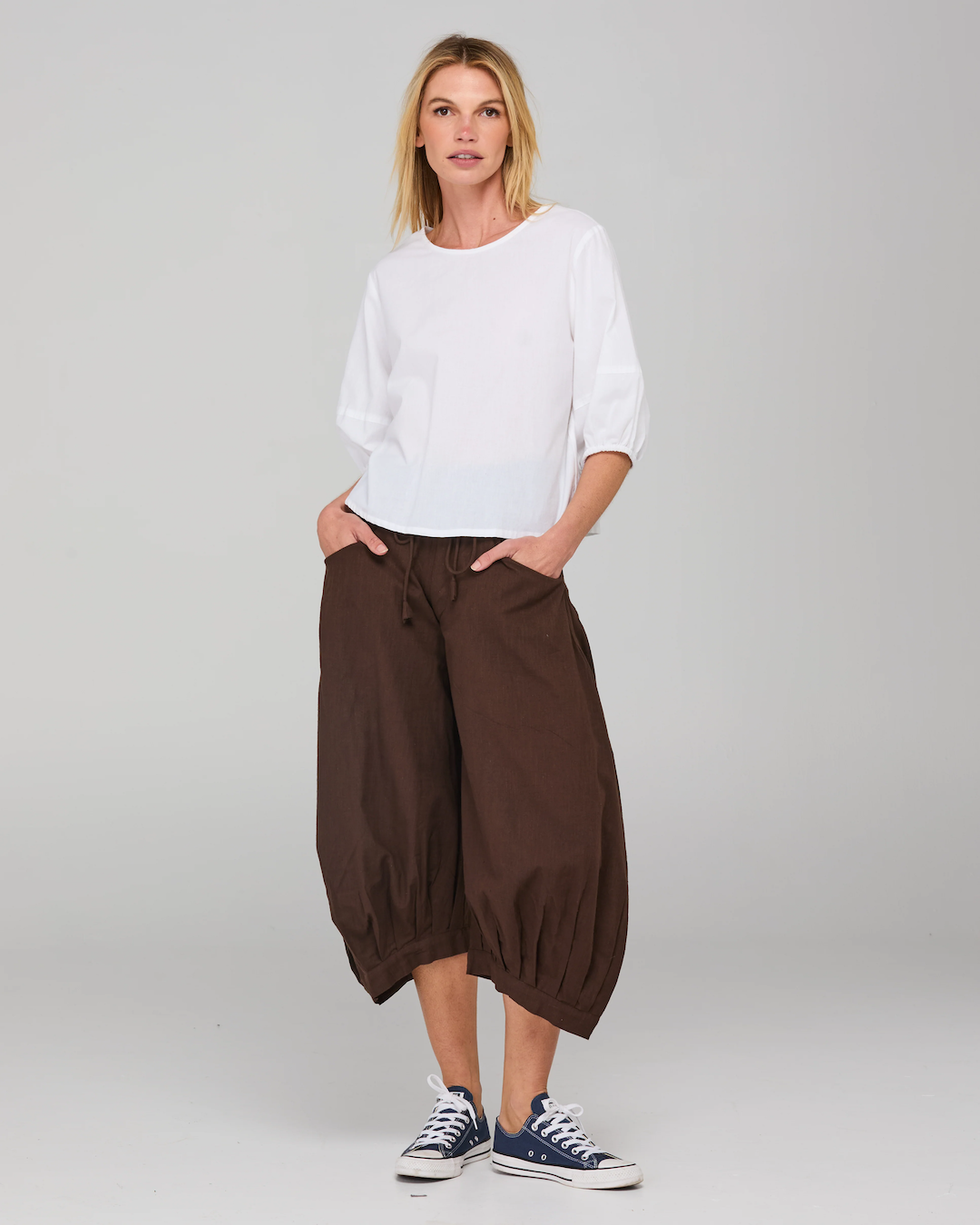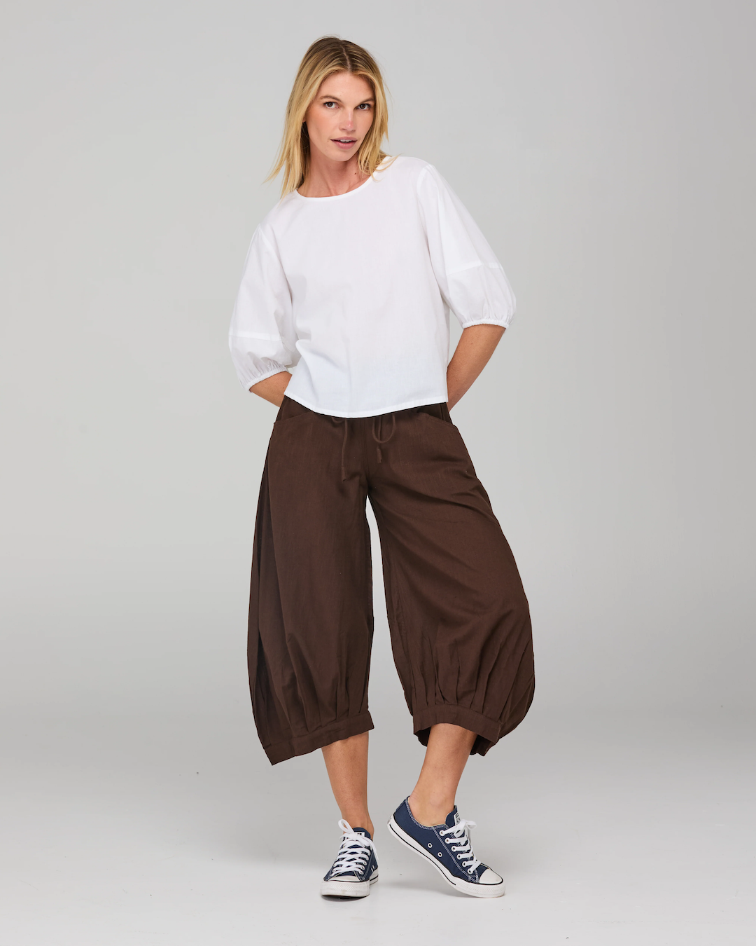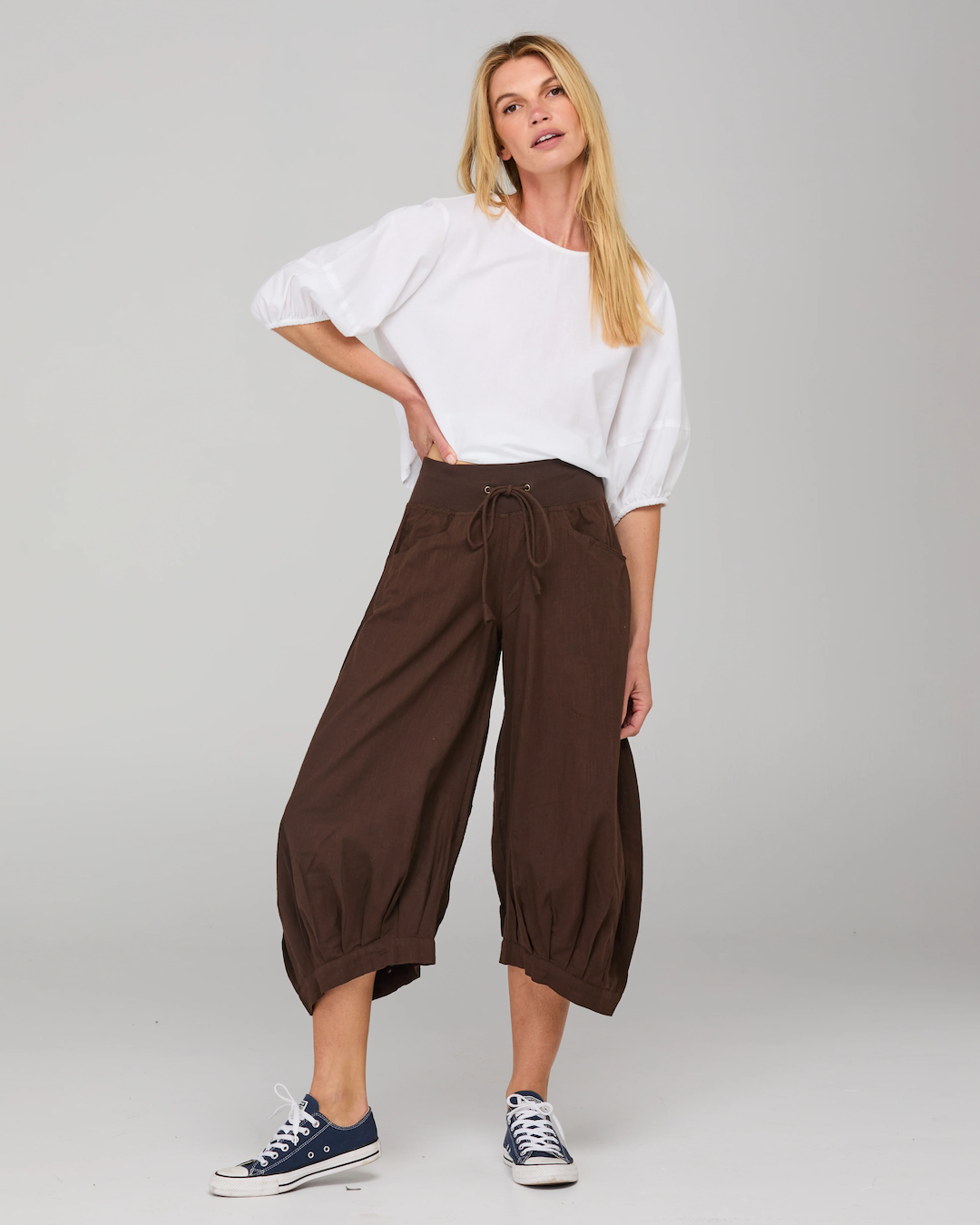 The Boom Shankar Guru Pant is our bestselling cotton essential with signature panel and seam detailing and balloon-style leg in 100% cotton. They are a 3/4 length pant fitted at the waist and with a relaxed comfy leg, perfect for everyday wear.