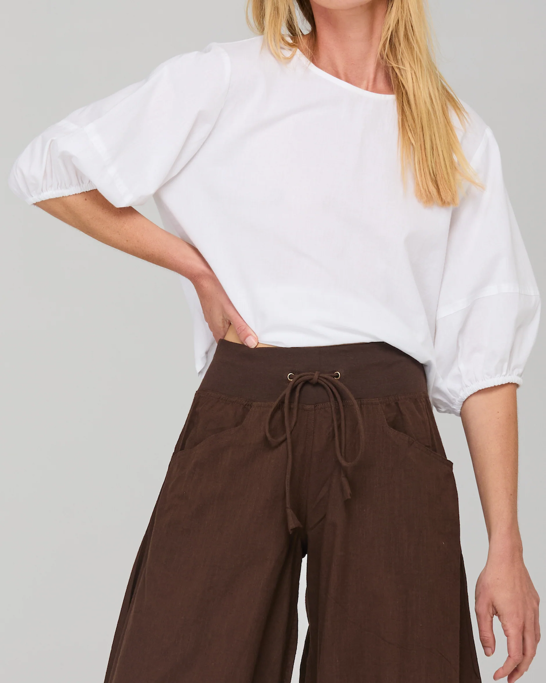 100% cotton, stretch cotton waistband with drawstring tie, two front and back pockets, seam and panel detail for signature Guru look, 3/4 length.