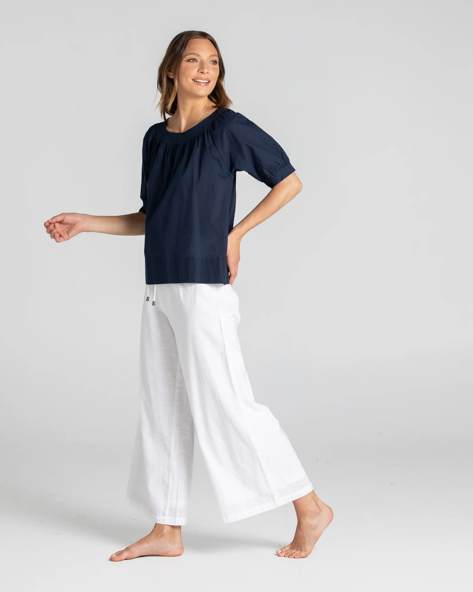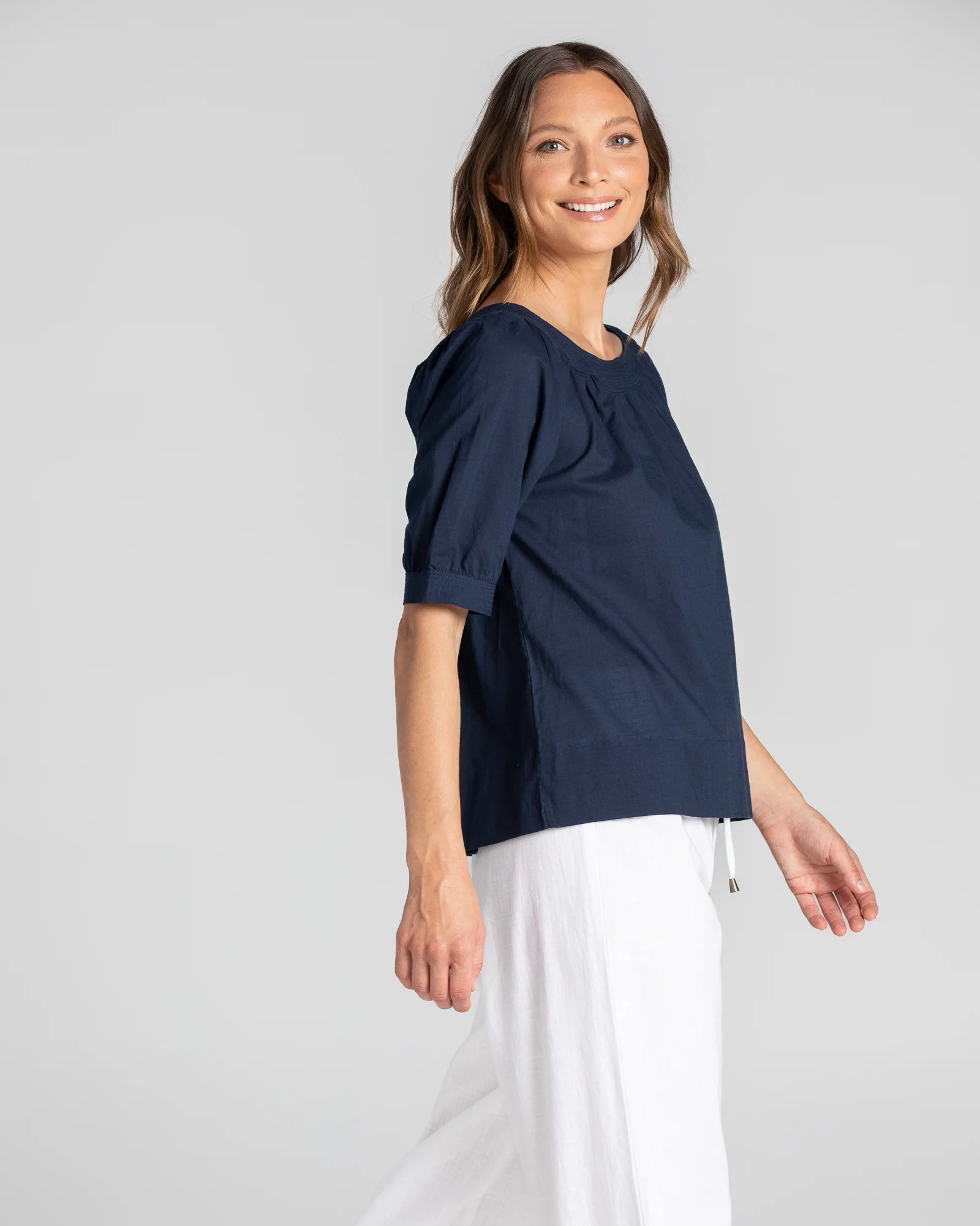 The Boom Shankar Bliss Top is a flowy and flattering summer top with a round neckline and elbow-length cuffed sleeves.