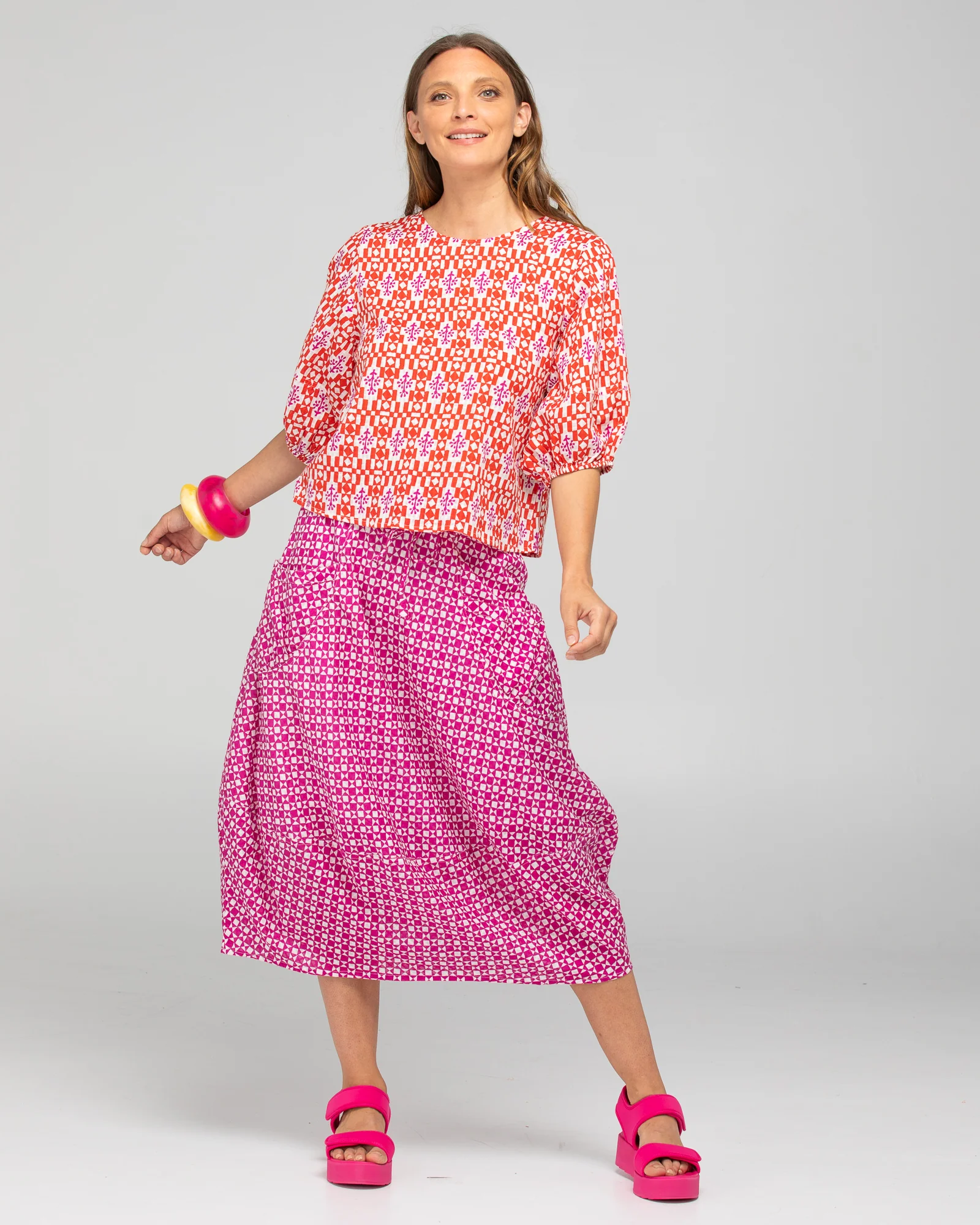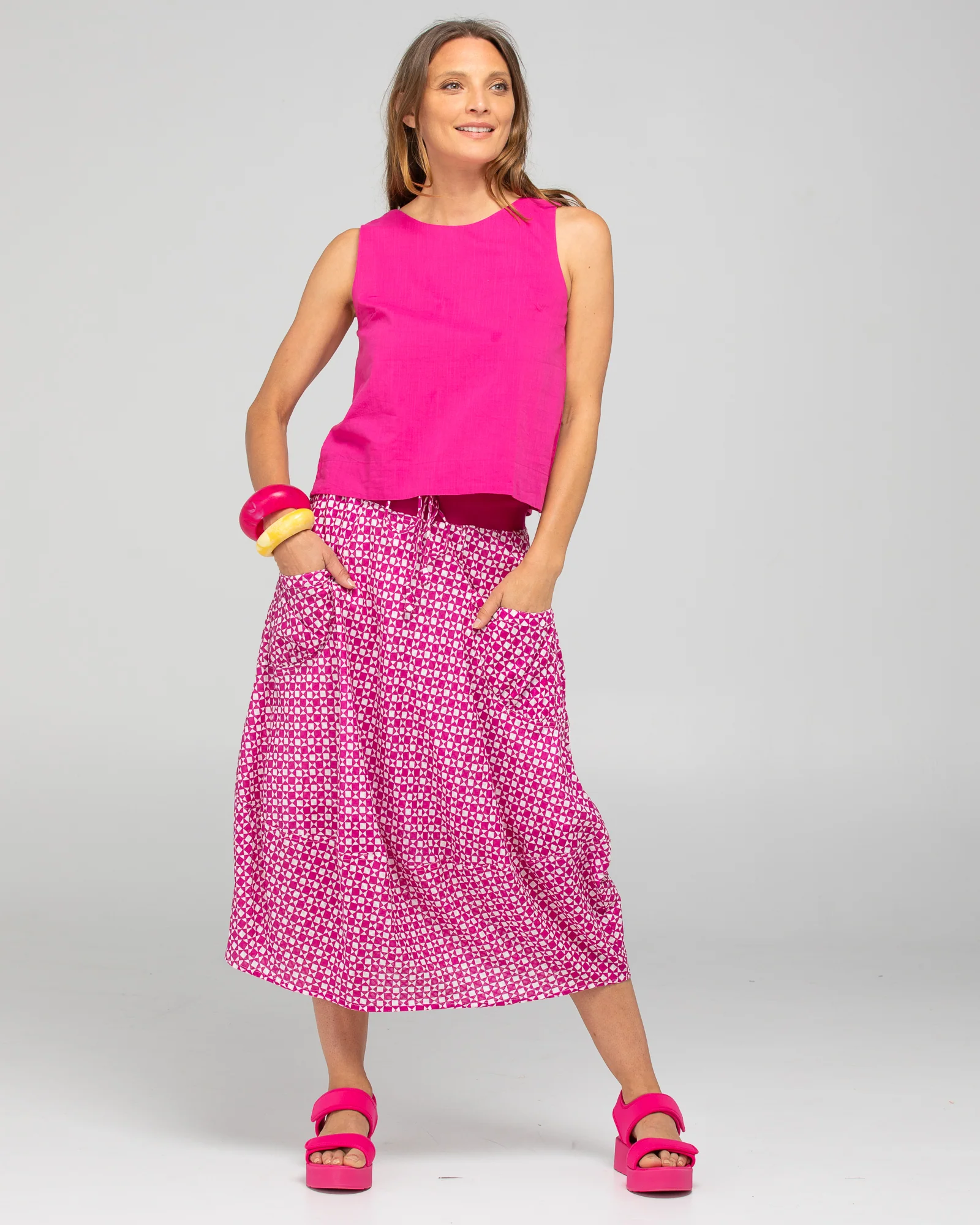 The Boom Shankar Guru Skirt is a 3/4 length cotton beauty with a super comfortable stretch cotton waistband. This style has two front and two back pockets, the Guru Skirt is a versatile and easy-to-wear option for all shapes and sizes.