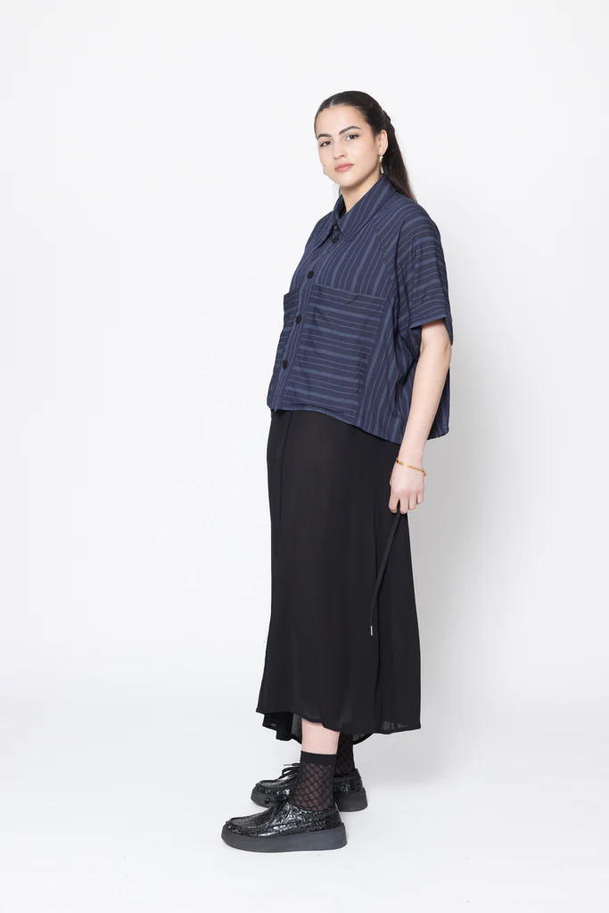 Short sleeve shirt in a viscose stripe shirting, designed for a relaxed to oversized fit. Raglan sleeve waist length shirt with generous fit collar, front patch pockets with pleat detail and front button up closure. Back has casing with tie to cinch in to adjust fit, this is a great crop style to wear as a shirt or jacket, worn with the Distort Dress.