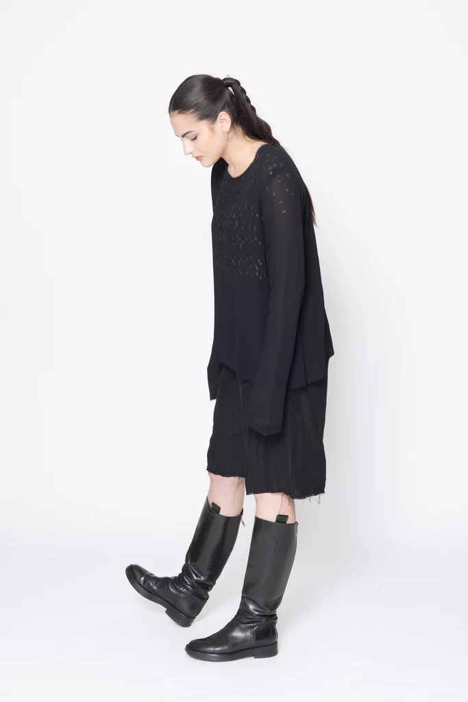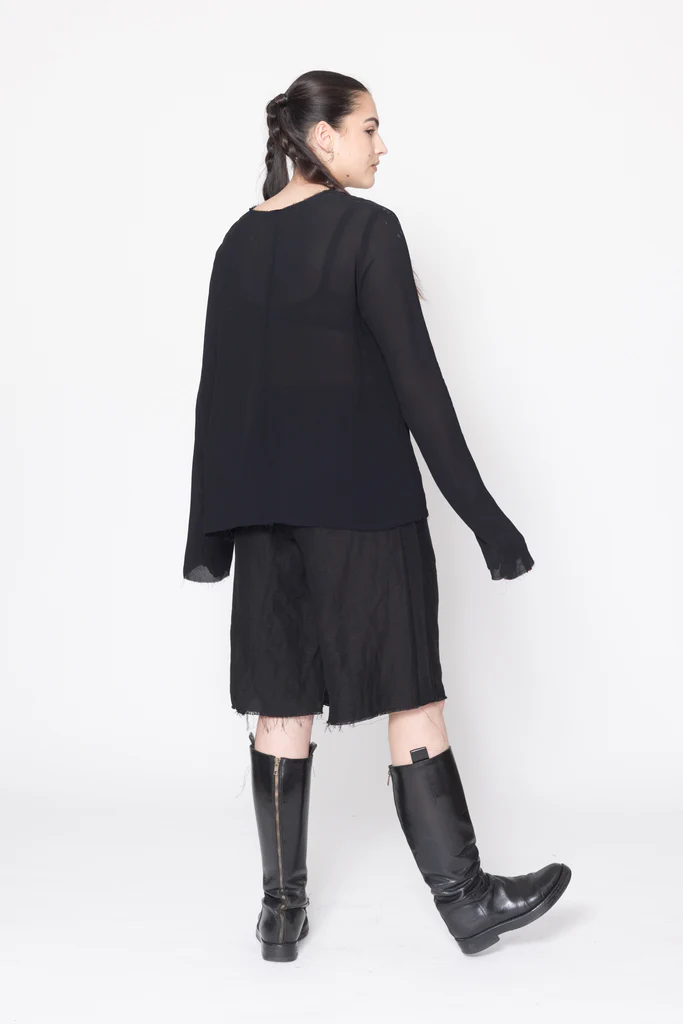 Long sleeve top in sheer viscose georgette, designed for a slim to relaxed fit. Individually hand printed with our signature Scatter print in metallic black. Our print is designed in house, the artwork is reflected song lyrics by Screamin' Jay intended to be revealed in a mirror. Featuring a round neck, raw hems and slightly flared sleeve hem. This is a great summer layer, worn as is or underneath dresses, worn with the Polar Shorts.