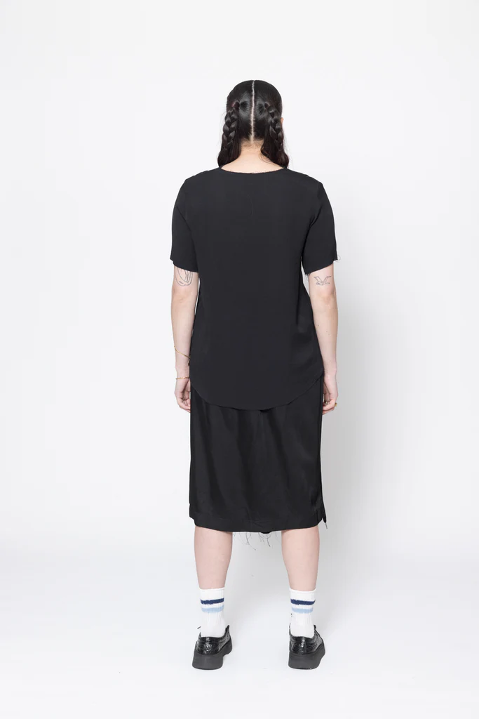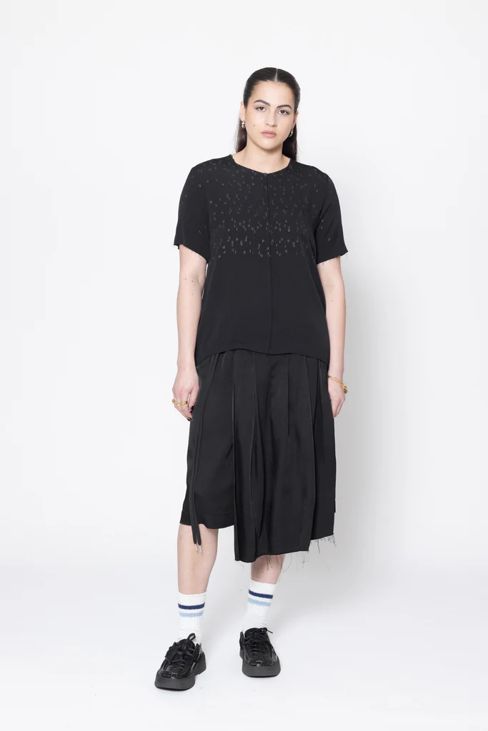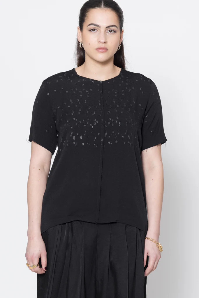 Short sleeve top in viscose twill, designed for a slim to relaxed fit. Individually hand printed with our signature Scatter print in metallic black. Our print is designed in house, the artwork is reflected song lyrics by Screamin' Jay intended to be revealed in a mirror. Featuring a round neck, raw hems and front french seam. This is a great summer top, worn with the Reality Skirt.