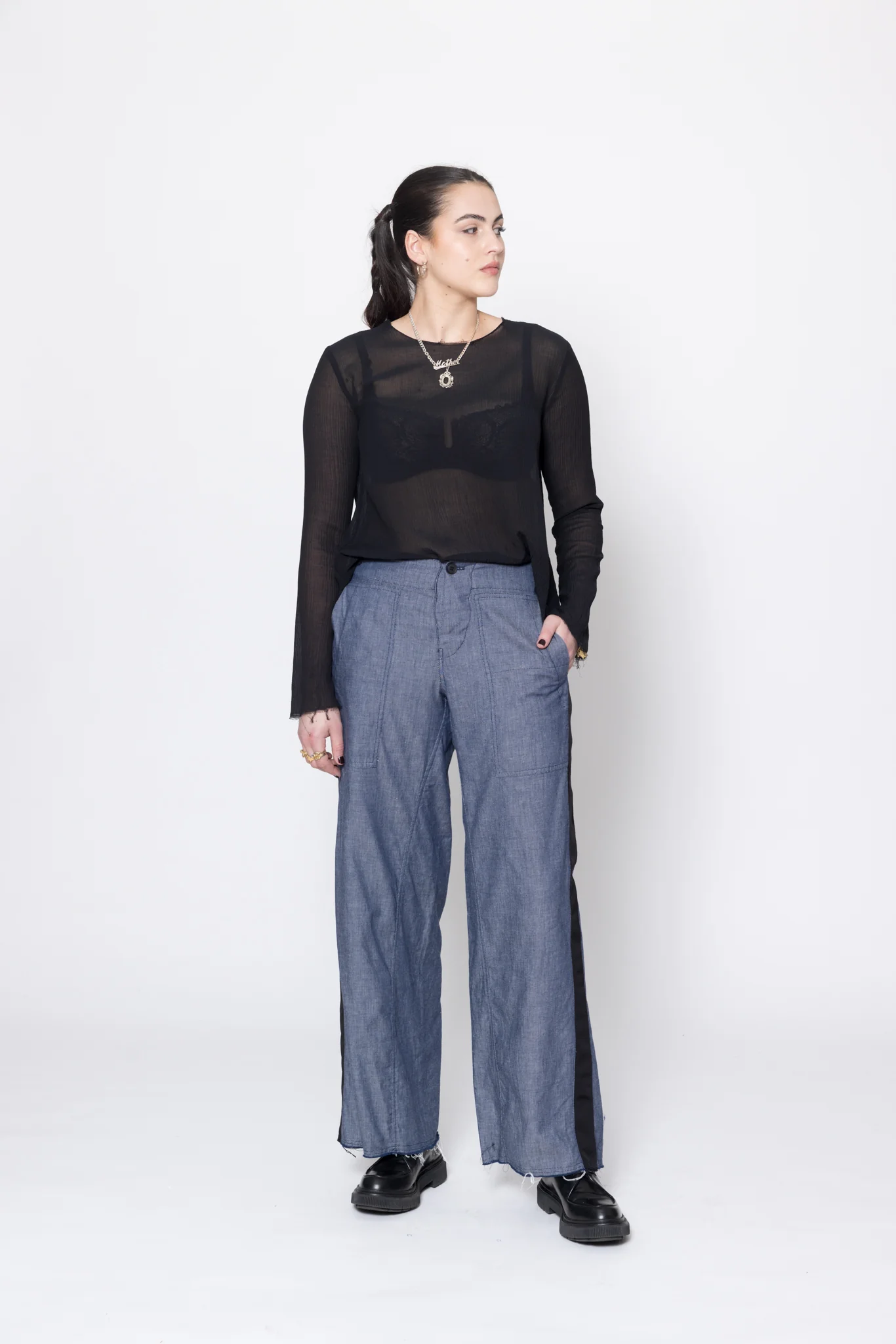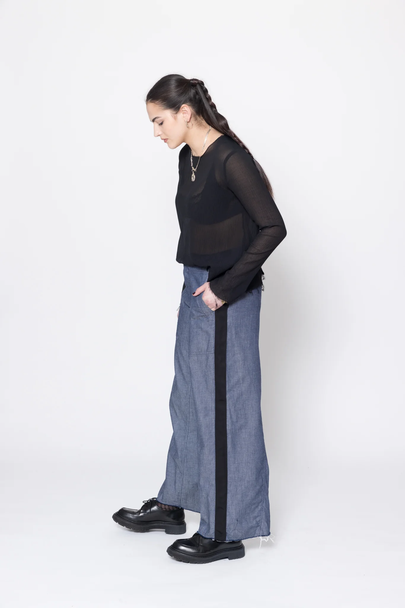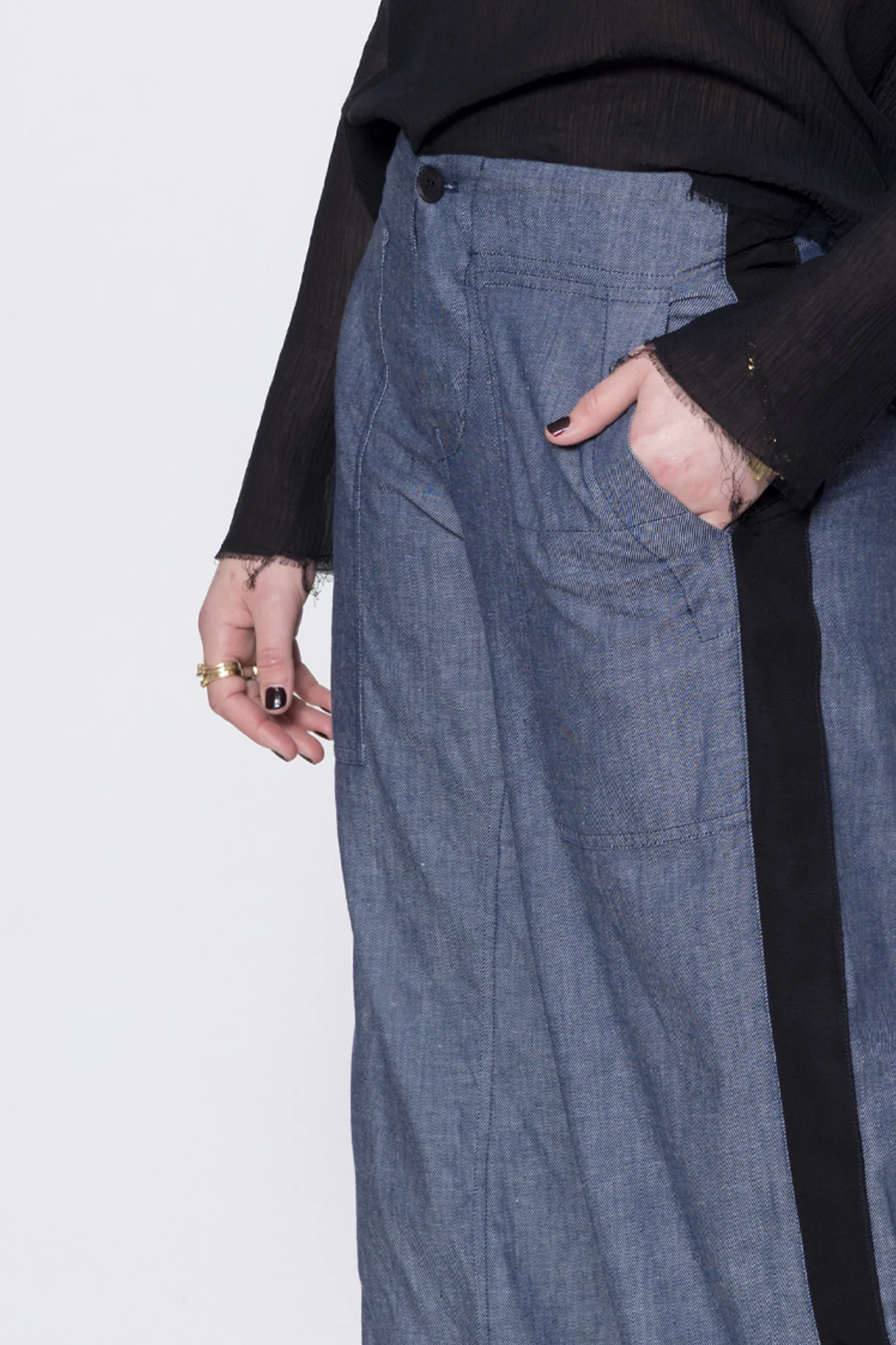 Wide leg, mid to low rise pants in a light cotton denim, designed for a relaxed fit. Fitted through the hip with button fly, featuring side patch pockets, wide grosgrain down side leg and raw hem. Great casual or dressy pants, worn with Antagonist Tee.