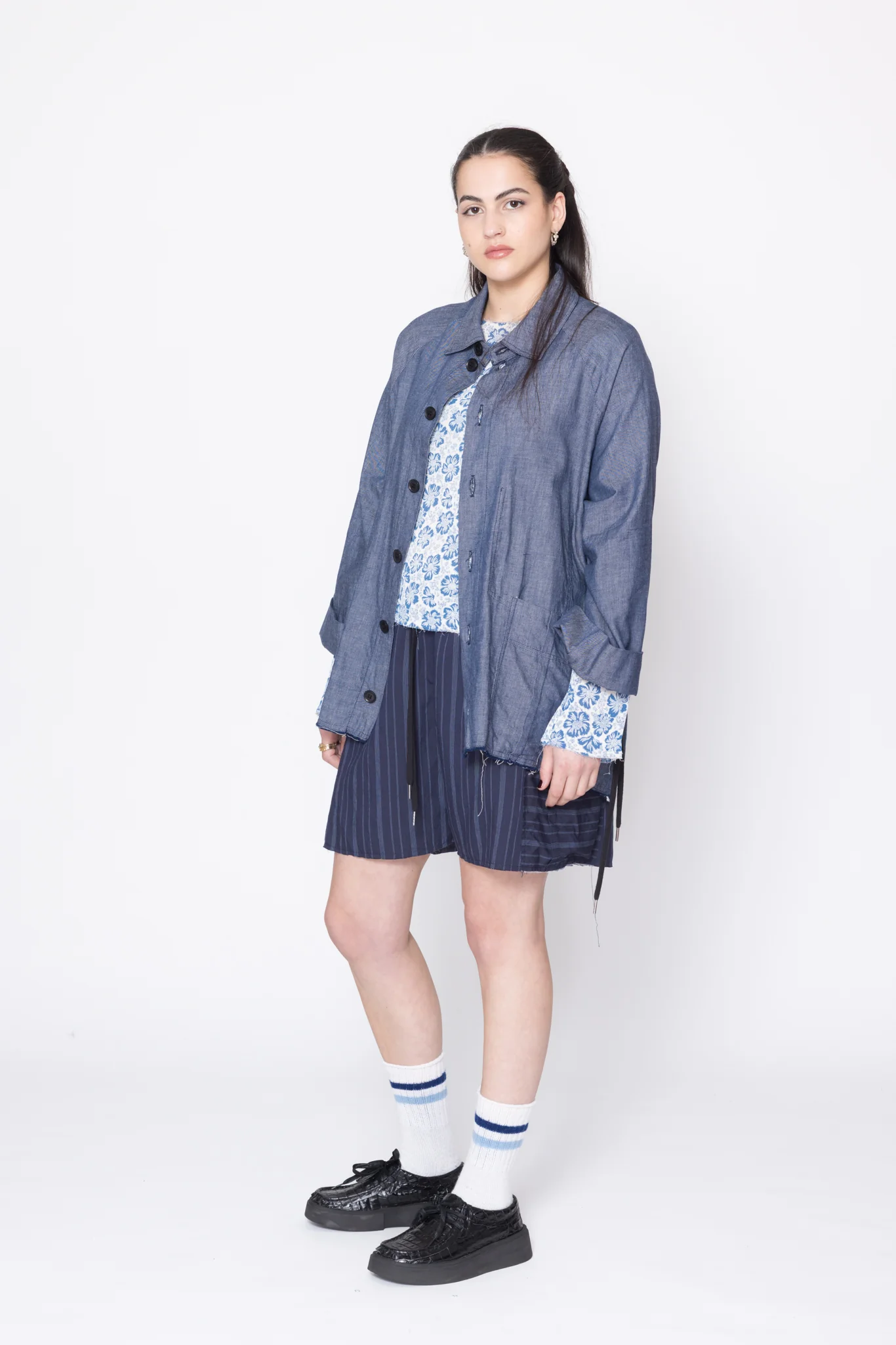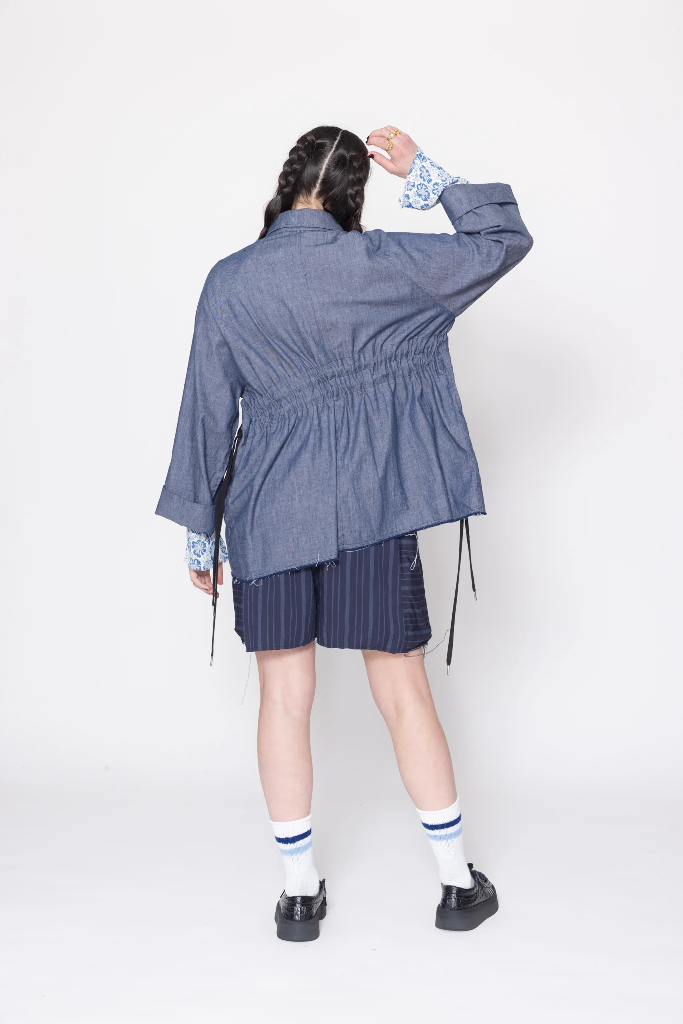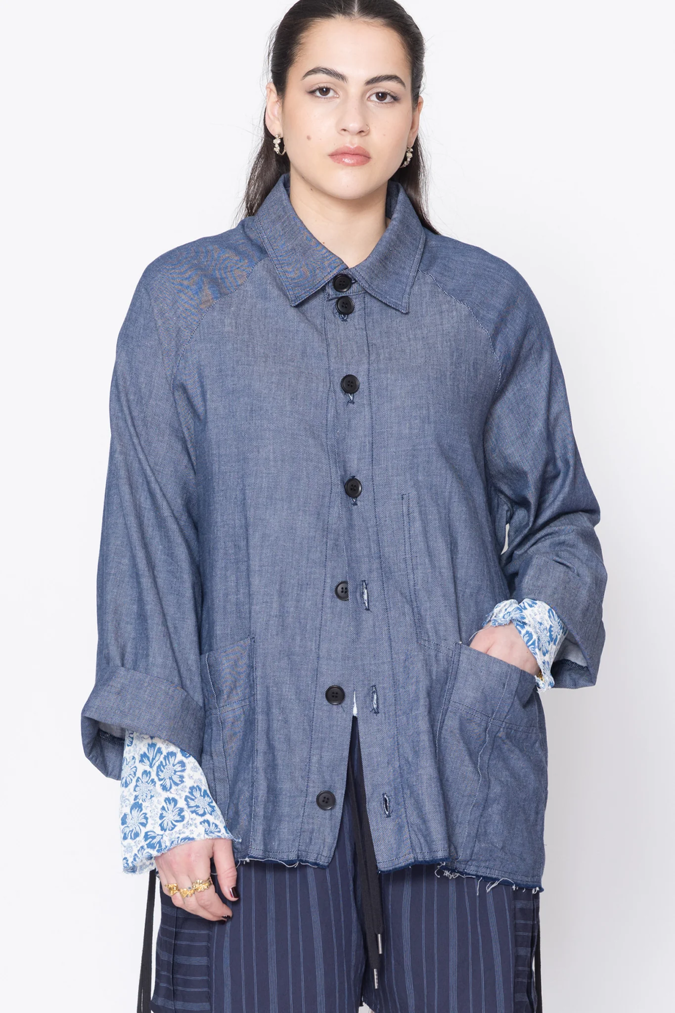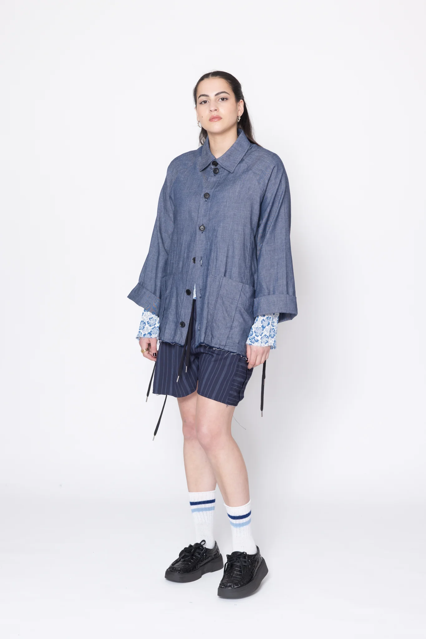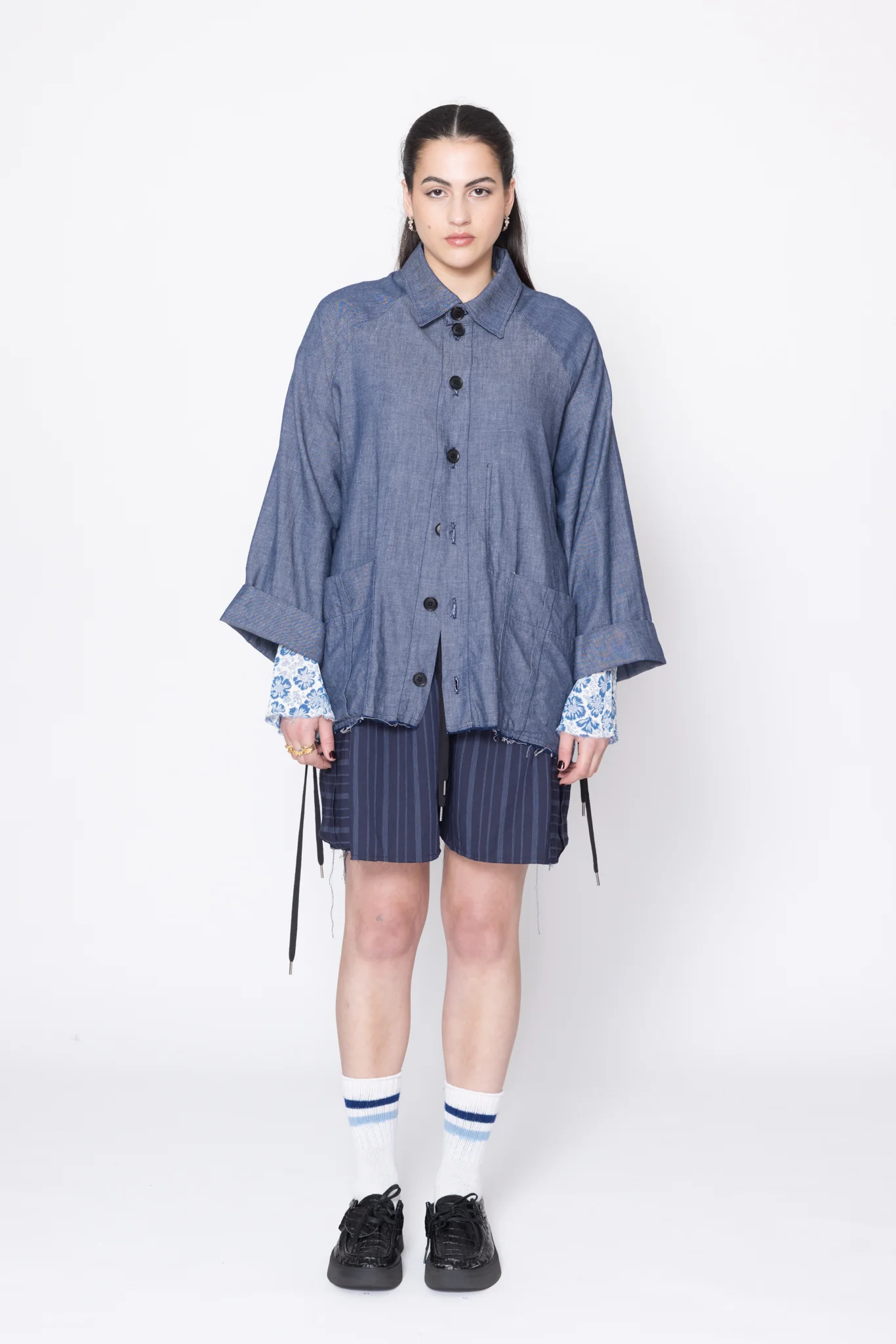 Long sleeve jacket in a light cotton denim, designed for a relaxed to oversized fit. A raglan sleeve hip length jacket with collar, button up placket, front patch pockets and an internal patch pocket. Back has double casing with shoelaces to cinch in and raw body hems. This is an easy throw on worker style jacket, great for layering over dresses and tops, worn with the Persona Shorts and Antagonist Tee.