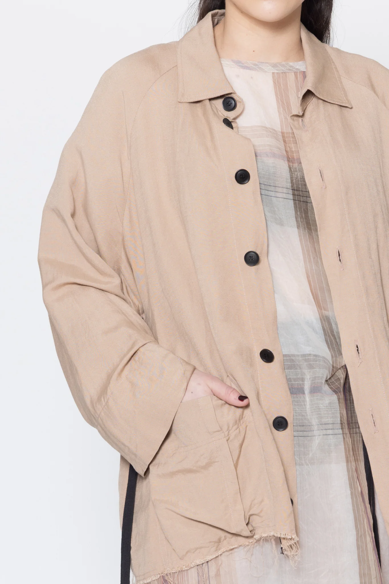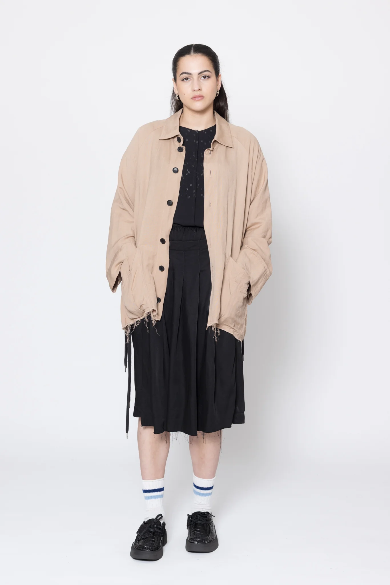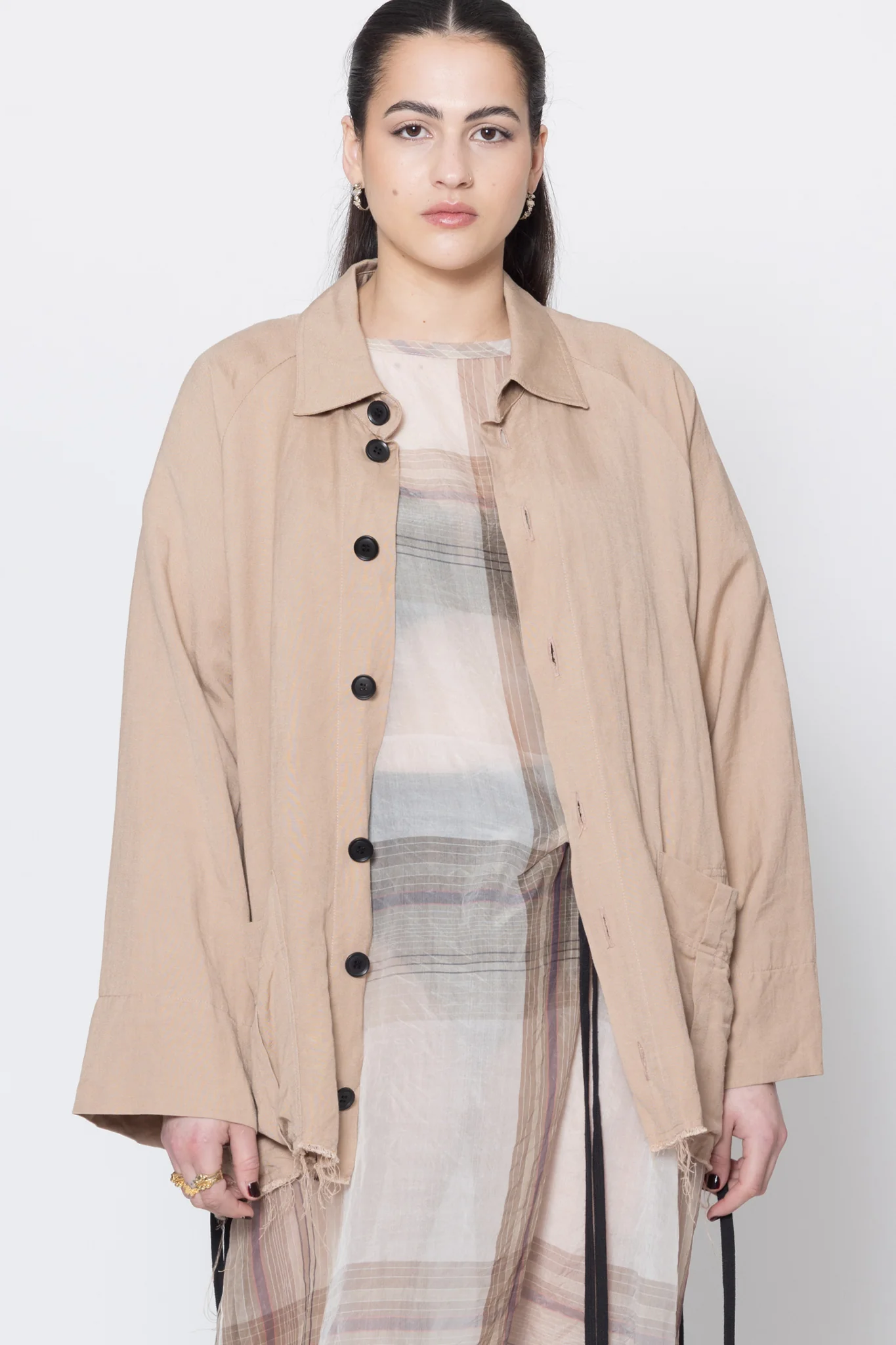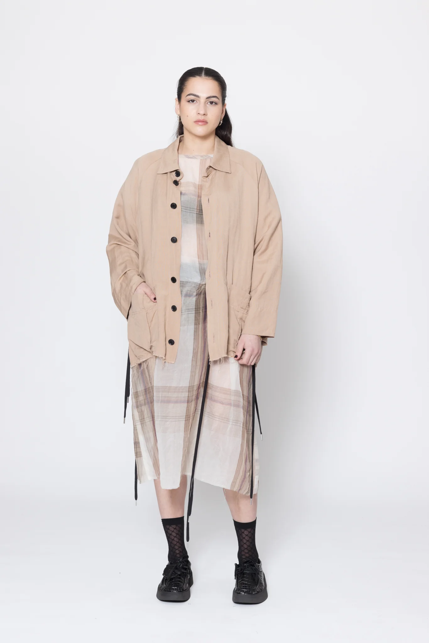 Long sleeve jacket in a linen viscose suiting, designed for a relaxed to oversized fit. A raglan sleeve hip length jacket with collar, button up placket, front patch pockets and an internal patch pocket. Back has double casing with shoelaces to cinch in and raw body hems. This is an easy throw on worker style jacket, great for layering over dresses and tops. Worn with the Borderline Dress and the Reality Skirt with Entitled Tee.
