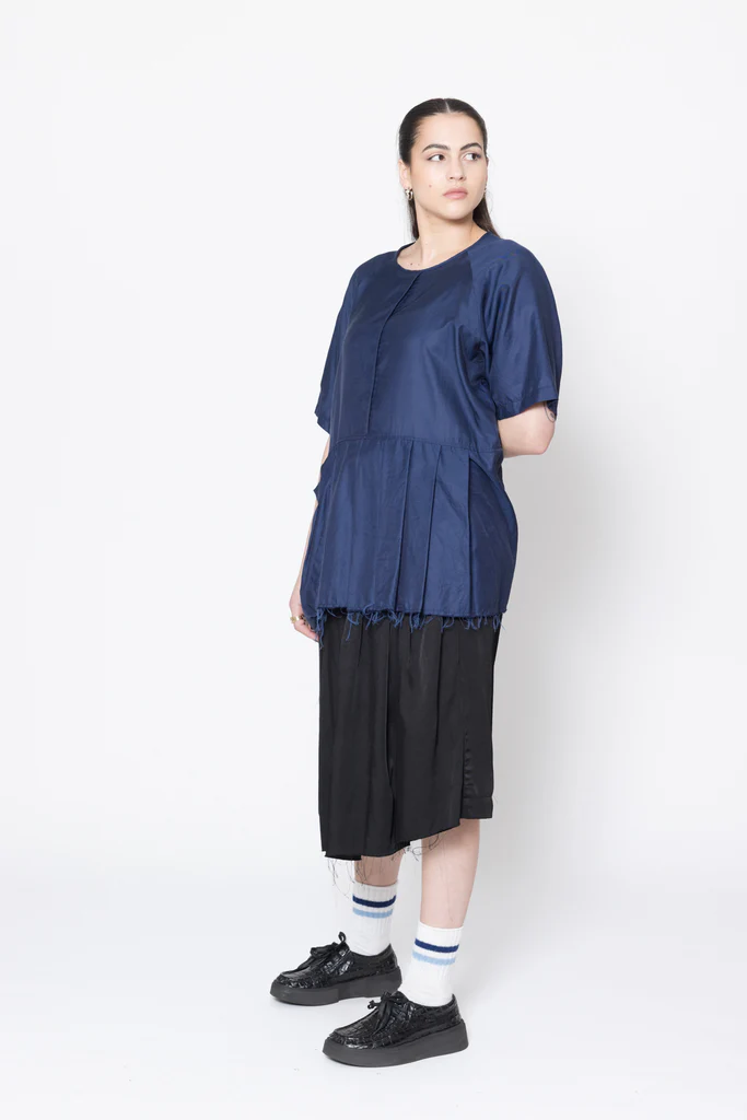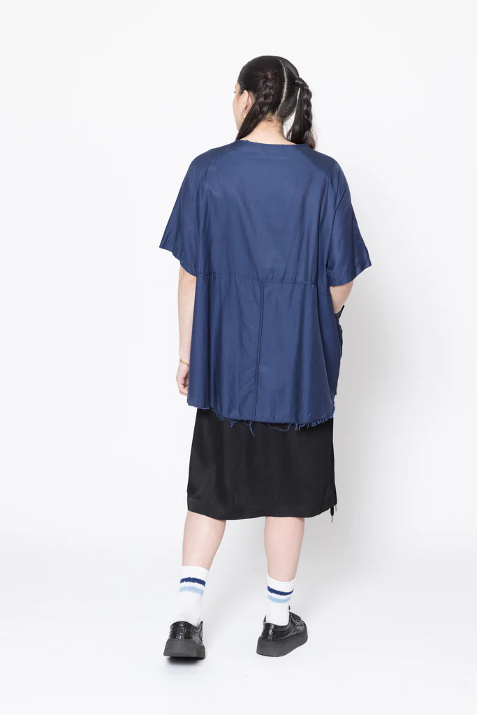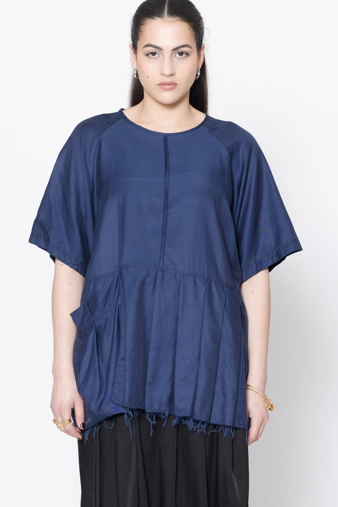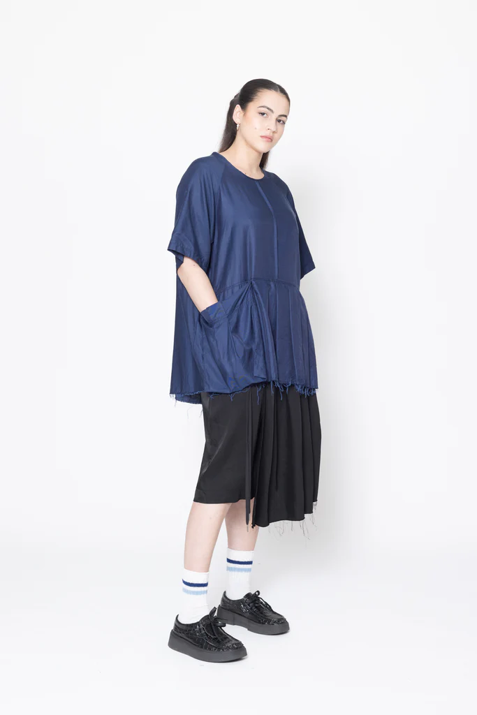 Short sleeve tee in a soft cupro cotton twill, designed for an oversized fit. Front features round bound neck, wide pleating on one side and a large pleat pocket on the other, roomy raglan sleeves and french seam details. This tee is pre-styled ready to go, worn with the Reality Skirt.