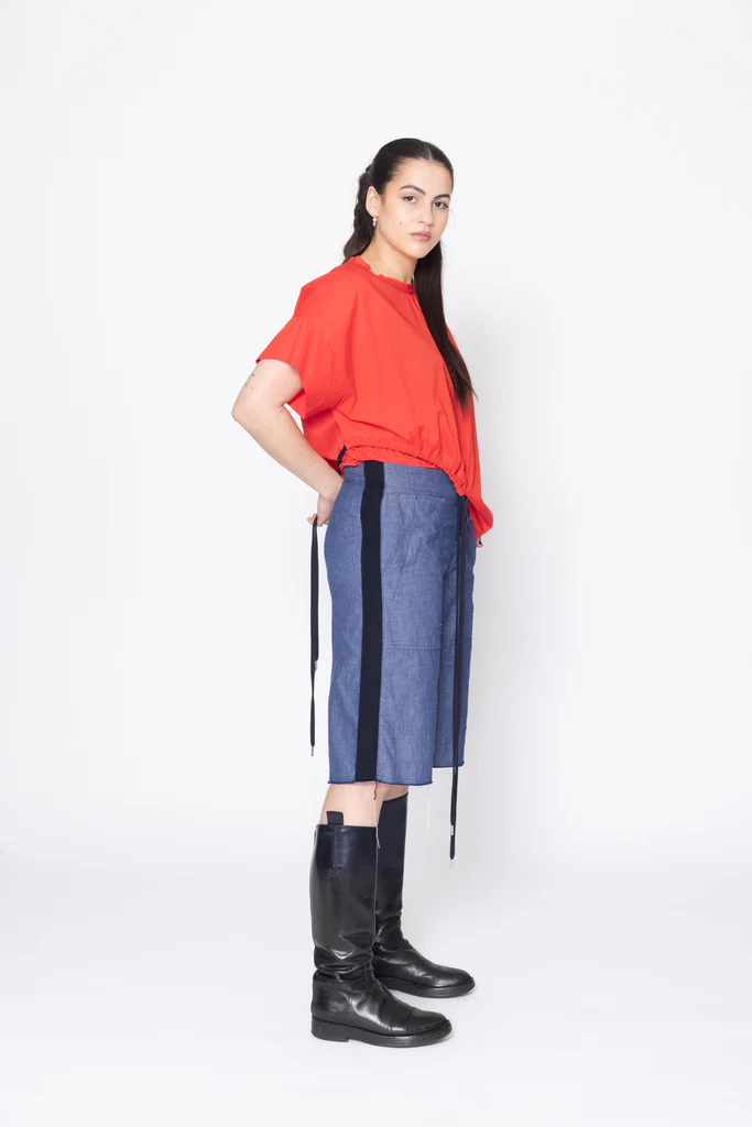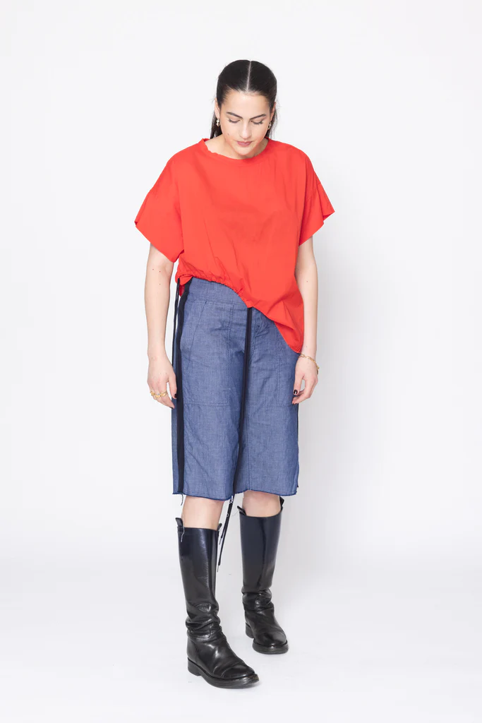 Wide leg, mid to low rise shorts in a light cotton denim, designed for a relaxed fit. Fitted through the hip with button fly, featuring side patch pockets, wide grosgrain down side leg and raw hem. Great casual or dressy shorts, worn with the Neurotic Tee.
