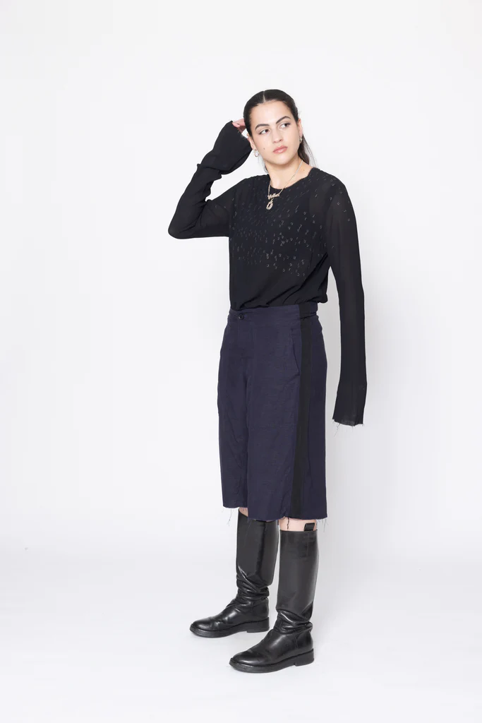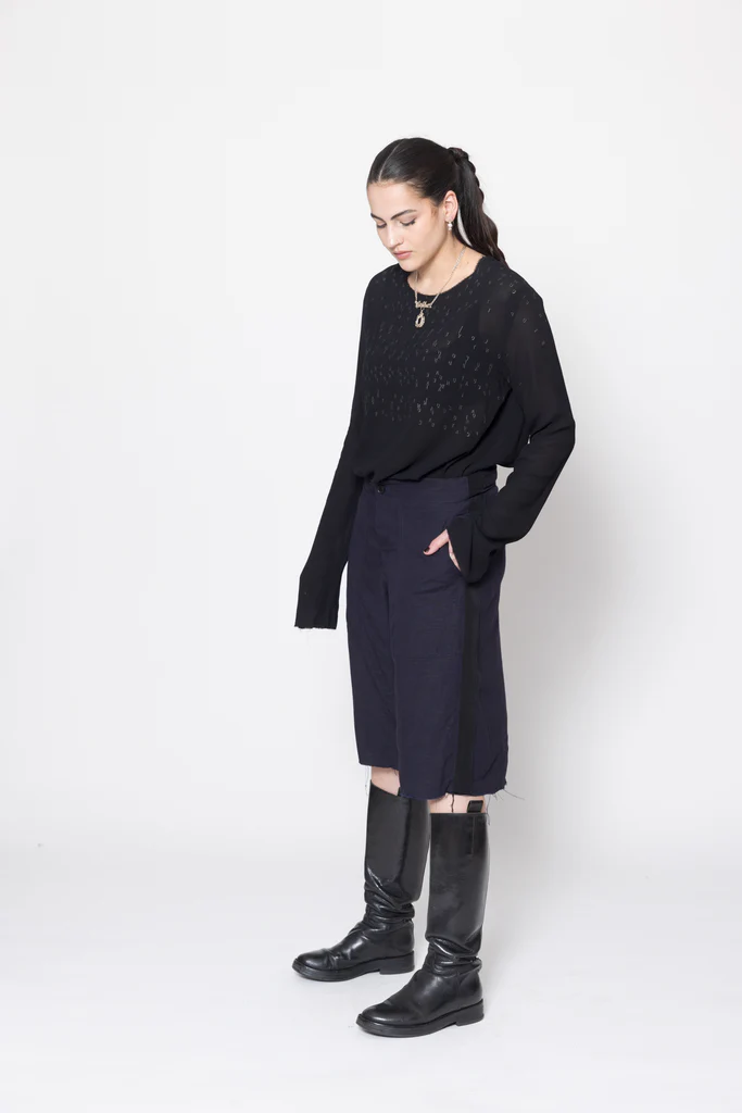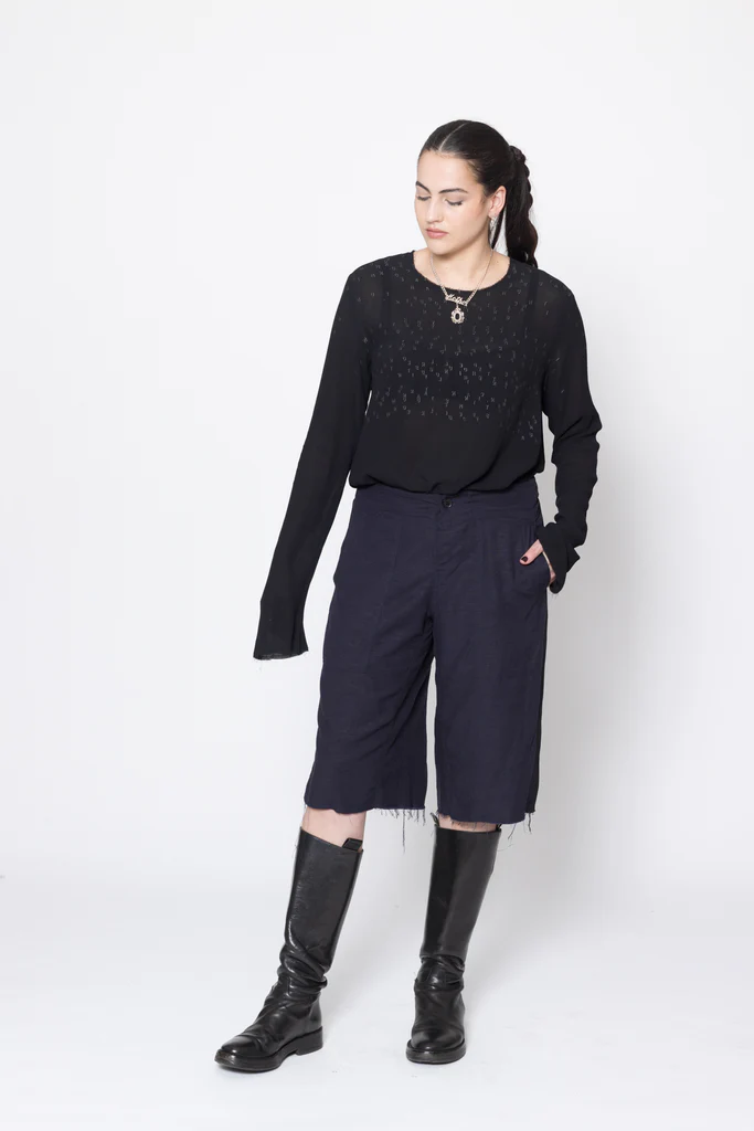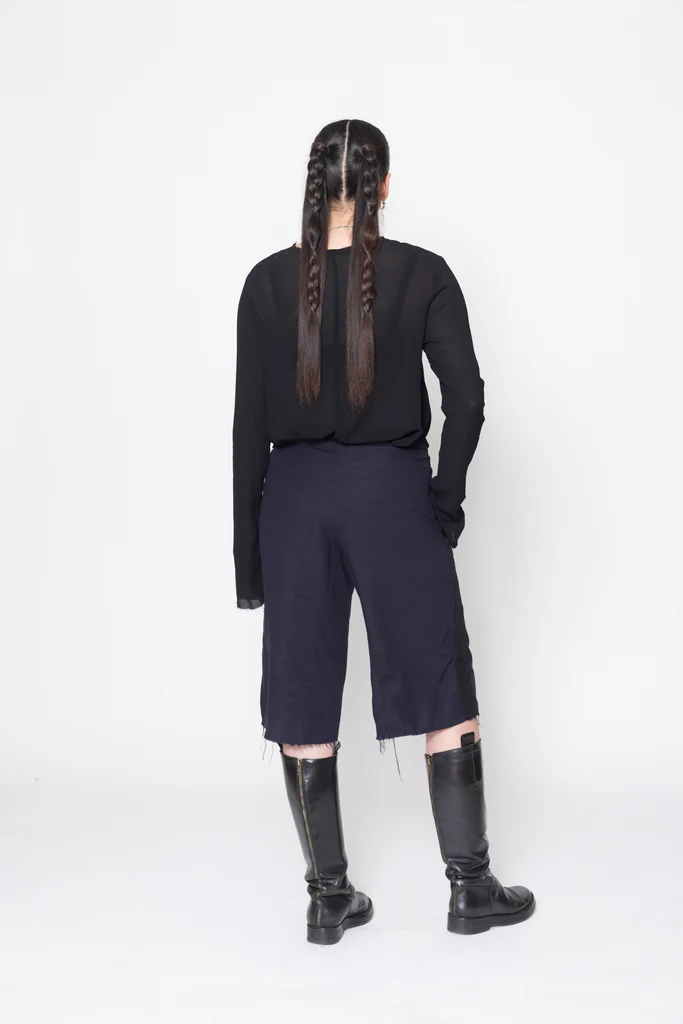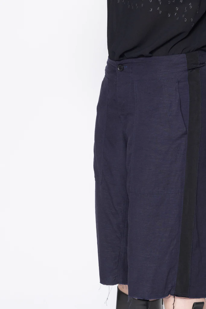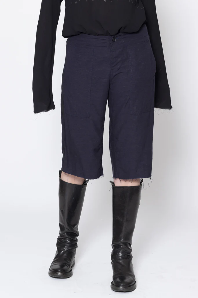 Wide leg, mid to low rise shorts in a linen viscose suiting, designed for a relaxed fit. Fitted through the hip with button fly, featuring side patch pockets, wide grosgrain down side leg and raw hem. Great casual or dressy shorts, worn with the Antagonist Tee.