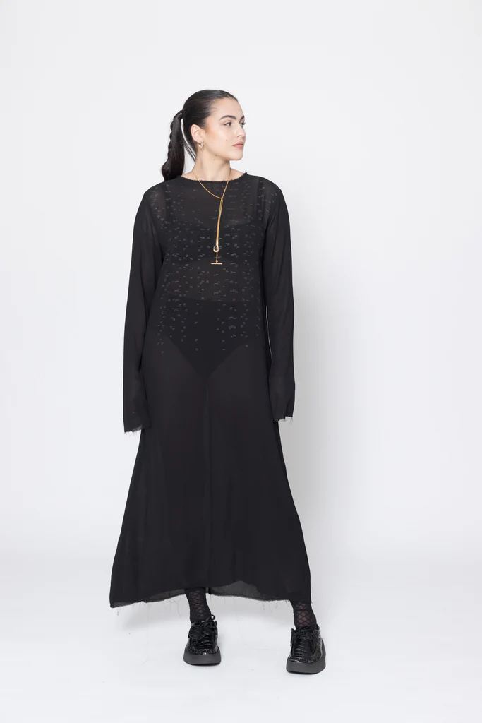 Long sleeve dress in sheer viscose georgette, designed for a slim to relaxed fit. Individually hand printed with our signature Scatter print in metallic black. Our print is designed in house, the artwork is reflected song lyrics by Screamin' Jay intended to be revealed in a mirror. Featuring a high round neck, raw hems and slightly flared sleeve hem.