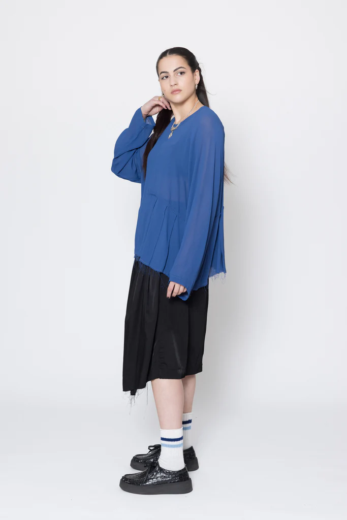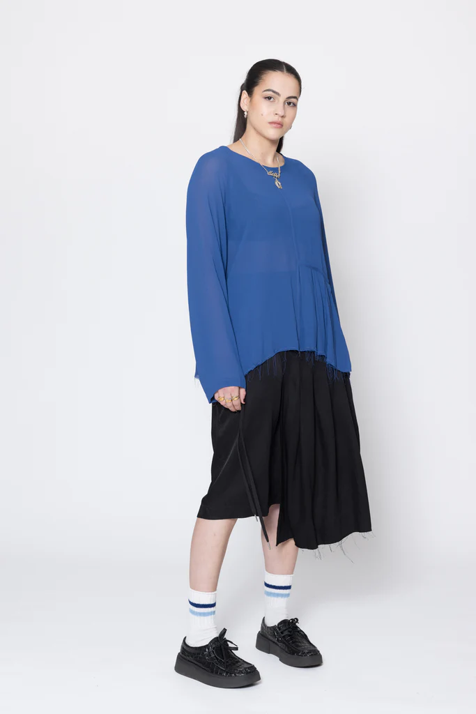 Long sleeve sweater in sheer viscose georgette, designed for an oversized fit. Featuring a round neck with classic neckband, raglan sleeves and wide pleating at one side both front and back. This is an easy go-to sweater, worn with the Reality Skirt.