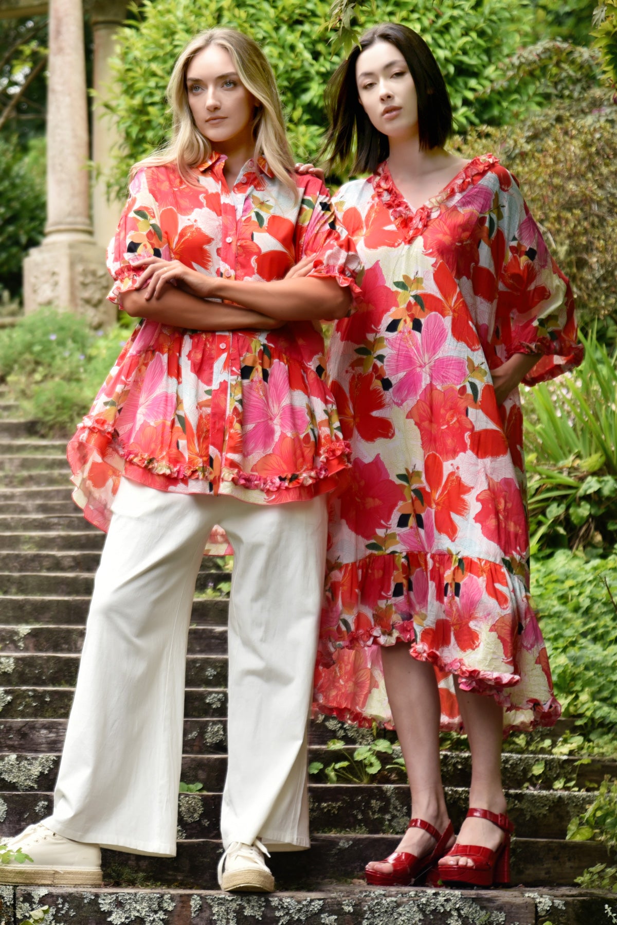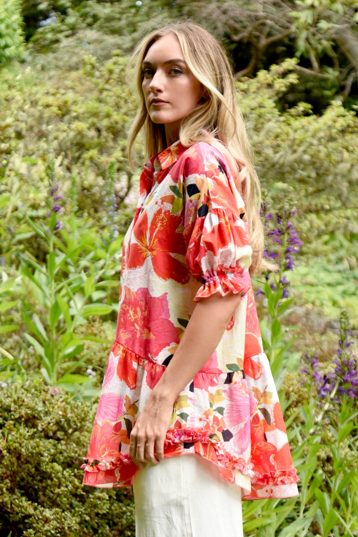 Radiating spring perfection, the ‘Make the Cut’ top is a seasonal staple. Featuring a classic button through front and collar, this top is set apart by its puff sleeve and gathered waist trimmed with a romantic ruffle. Crafted in the hibiscus print ‘Life in Colour’ cotton this lightweight gem is a must for warmer weather ahead!