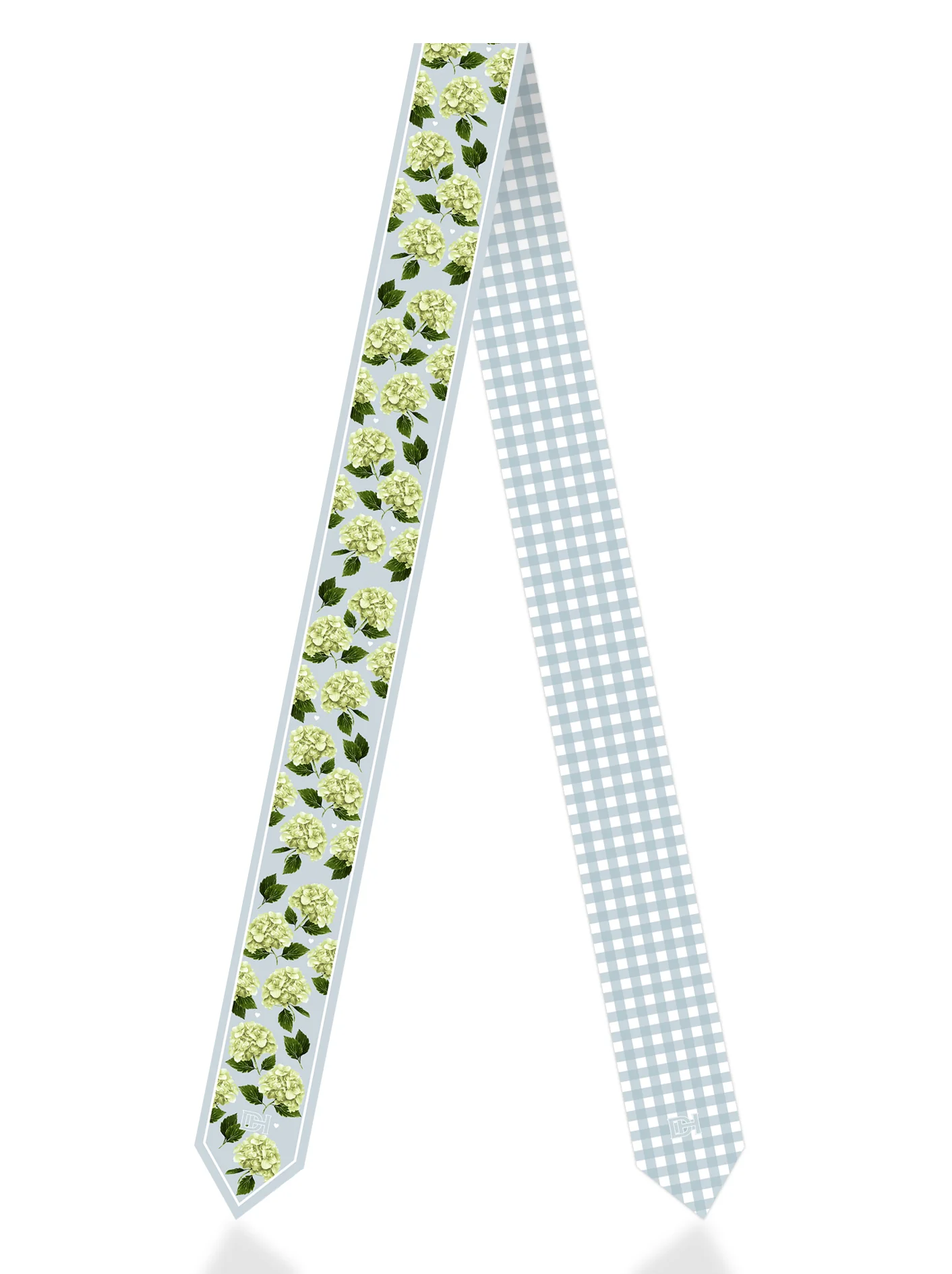The Cousins Twilly is fresh and full of charm. Blue with white and green hydrangeas, and a blue gingham reverse, a perfect balance of classic florals and playful pattern.