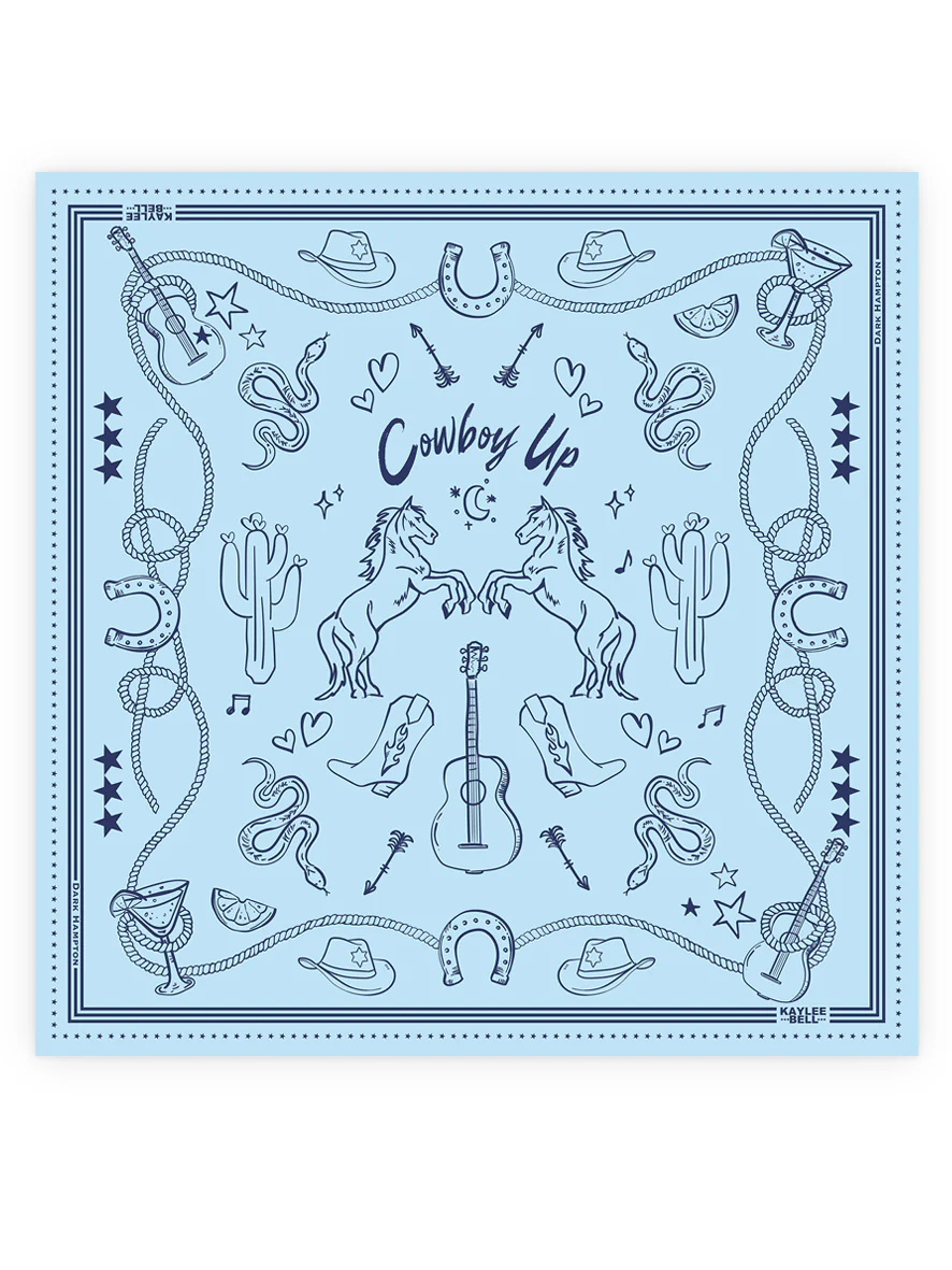 A special collaboration with country music star Kaylee Bell, this limited edition silk petite scarf is a bold yet feminine take on our signature style. In pale blue with deep navy, western inspired detailing and "Cowboy Up" woven into the design, it's the perfect statement piece. Whether tied at the neck, worn in the hair or wrapped on your bag!
