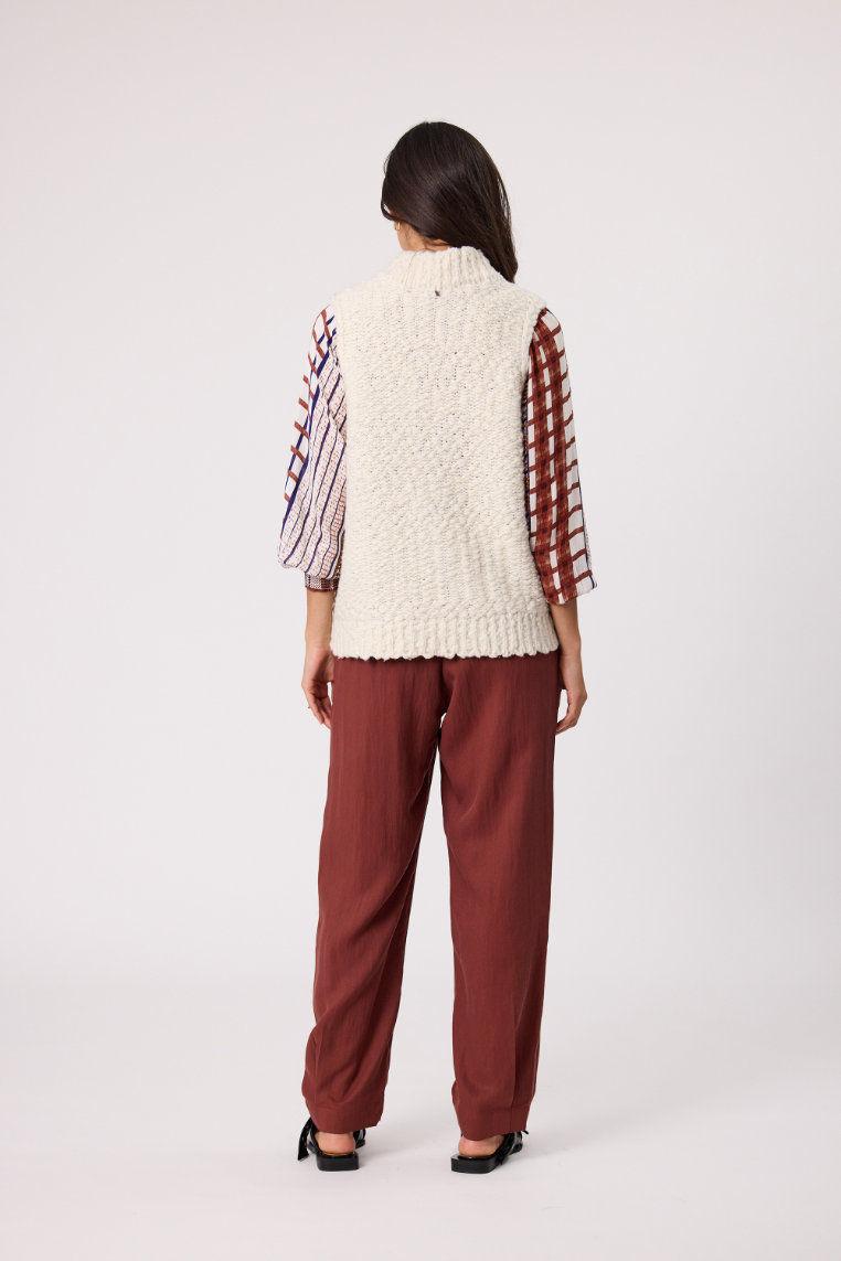 This stylish vest is crafted from a soft merino wool blend yarn, ensuring both comfort and warmth. Featuring a unique knitted design that adds a playful touch to your wardrobe.