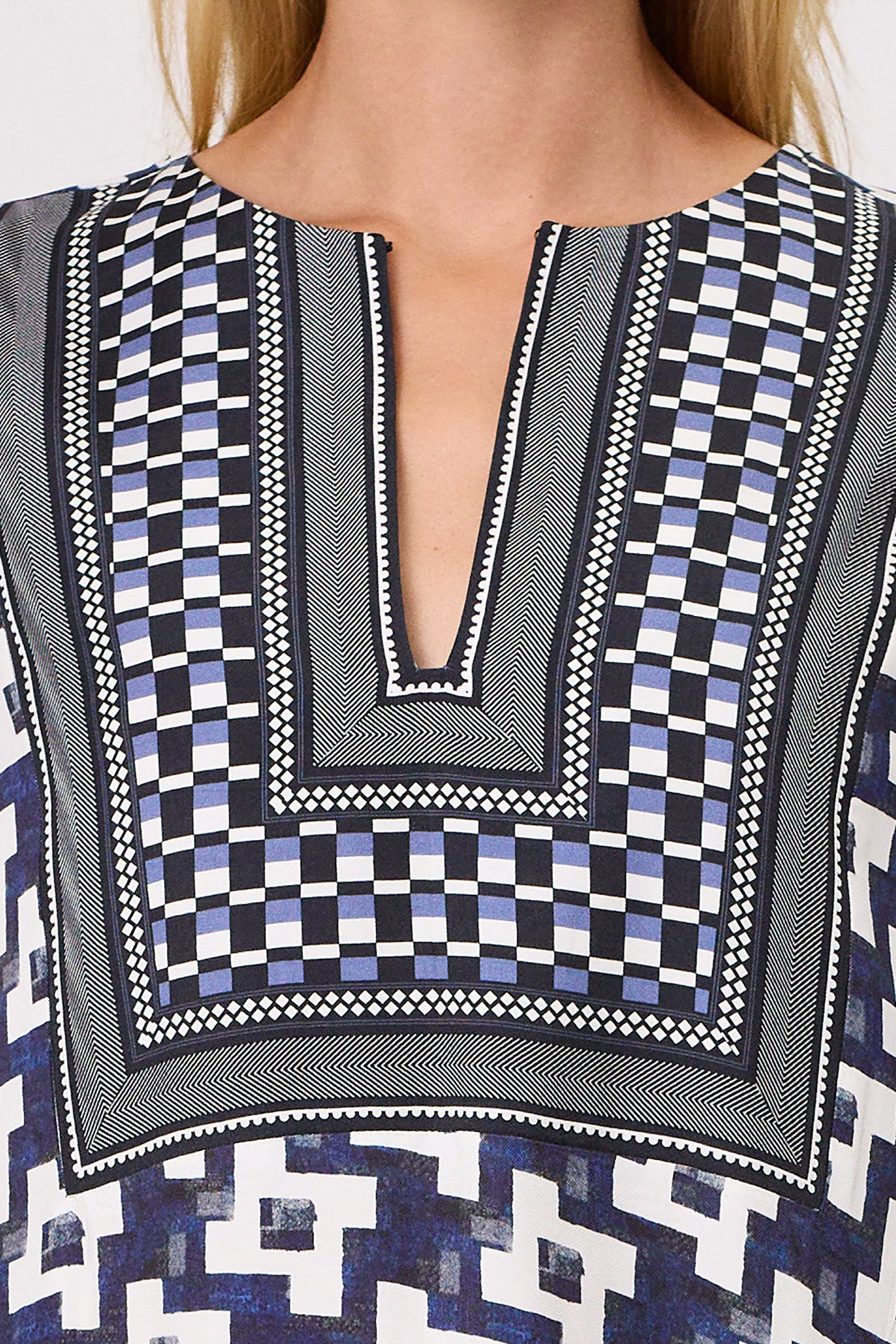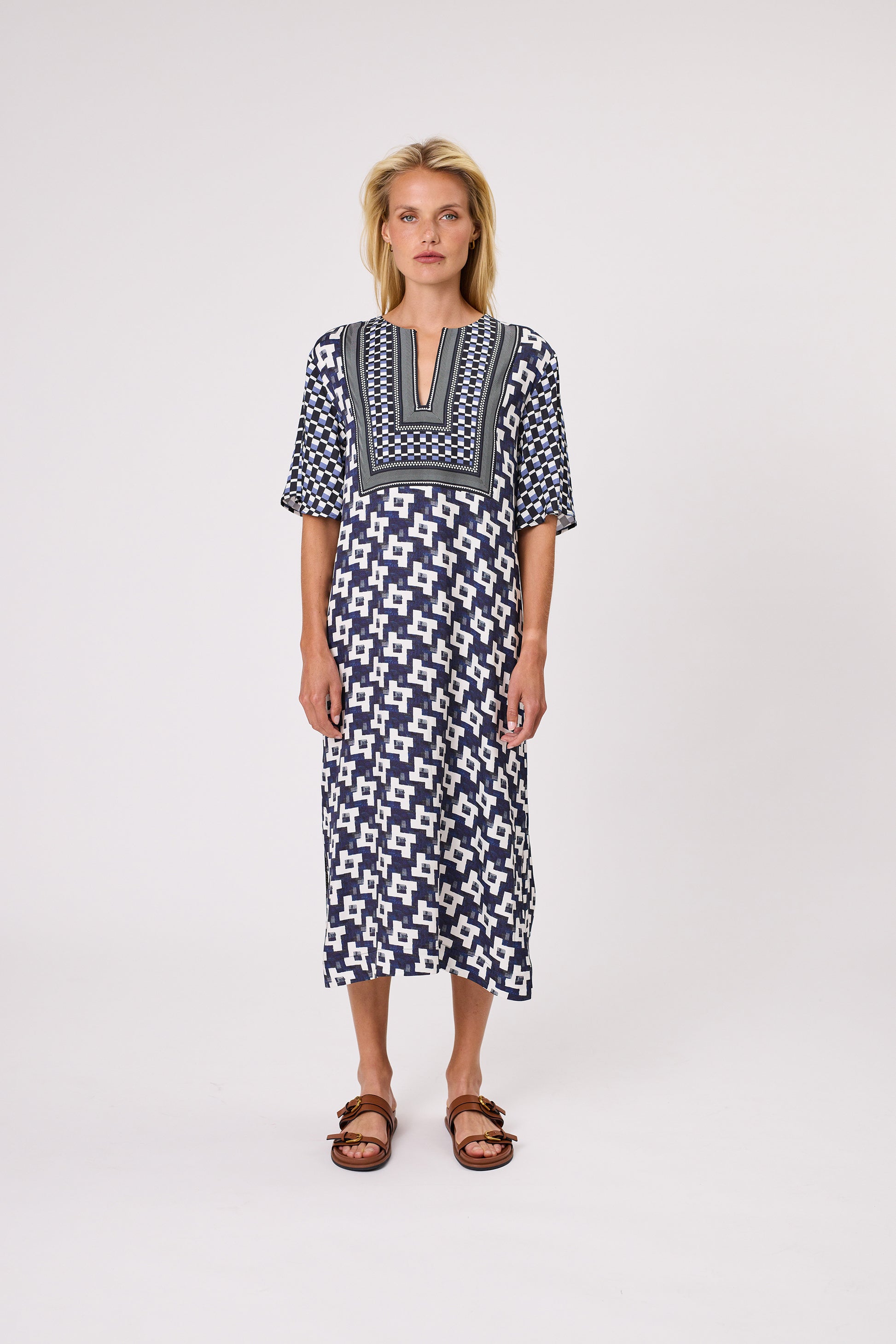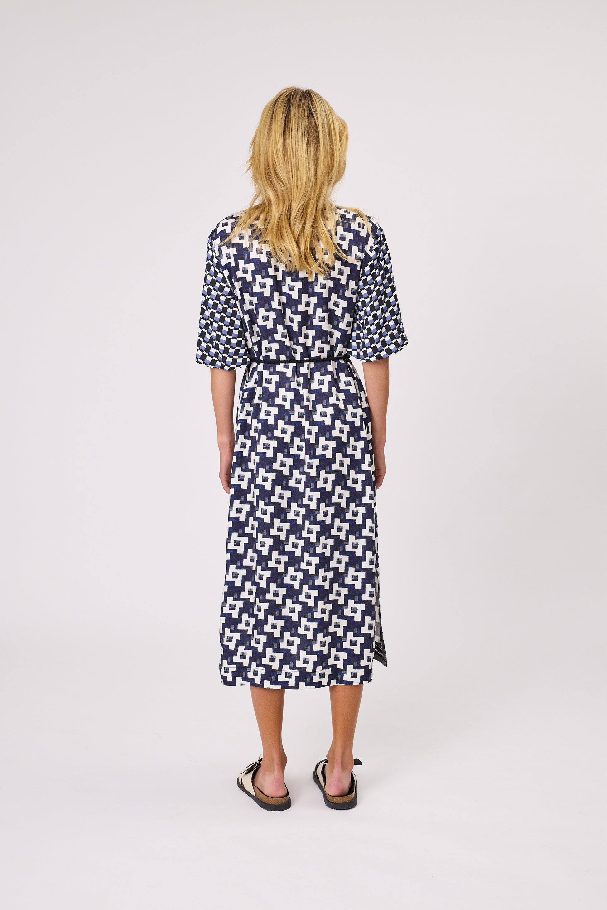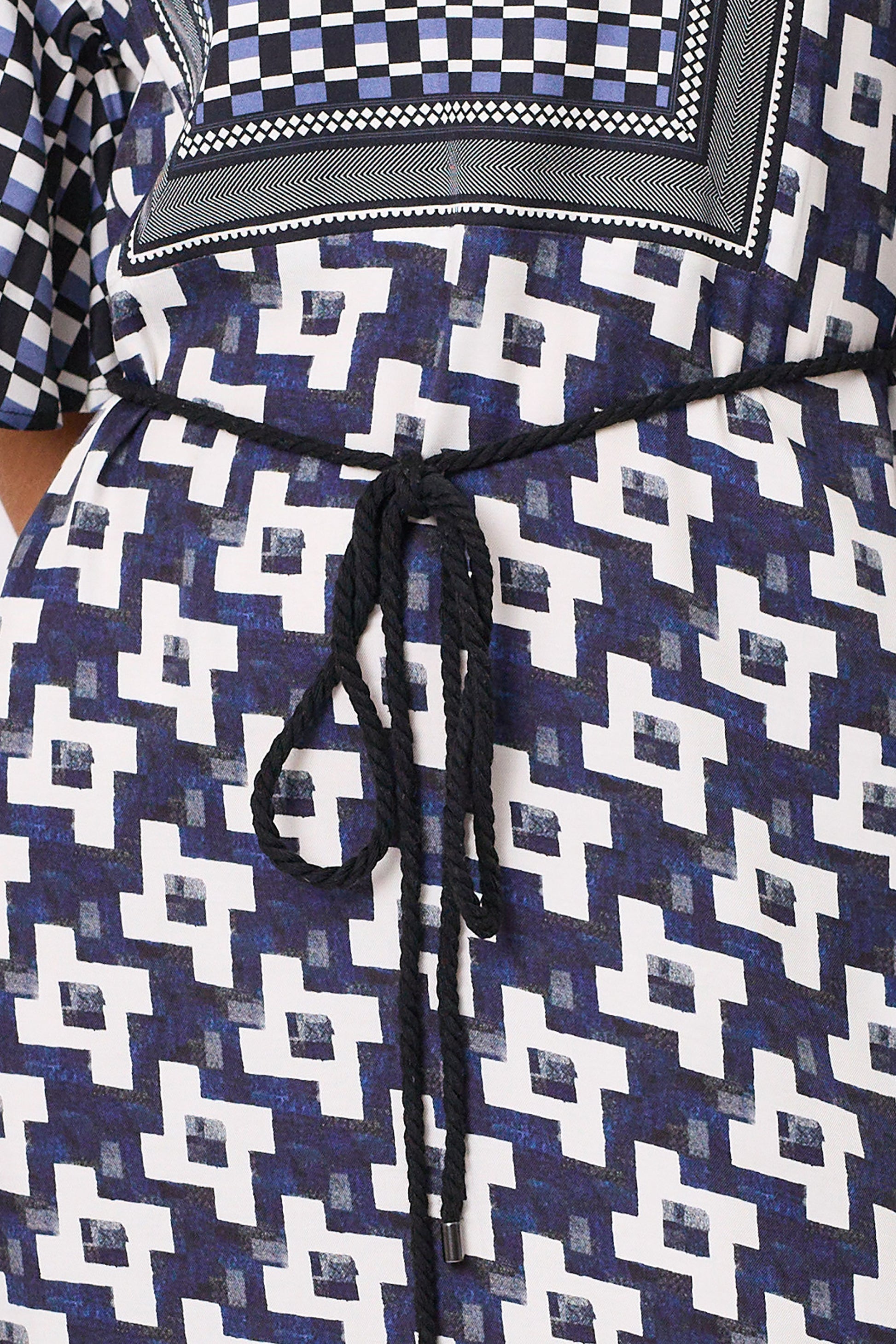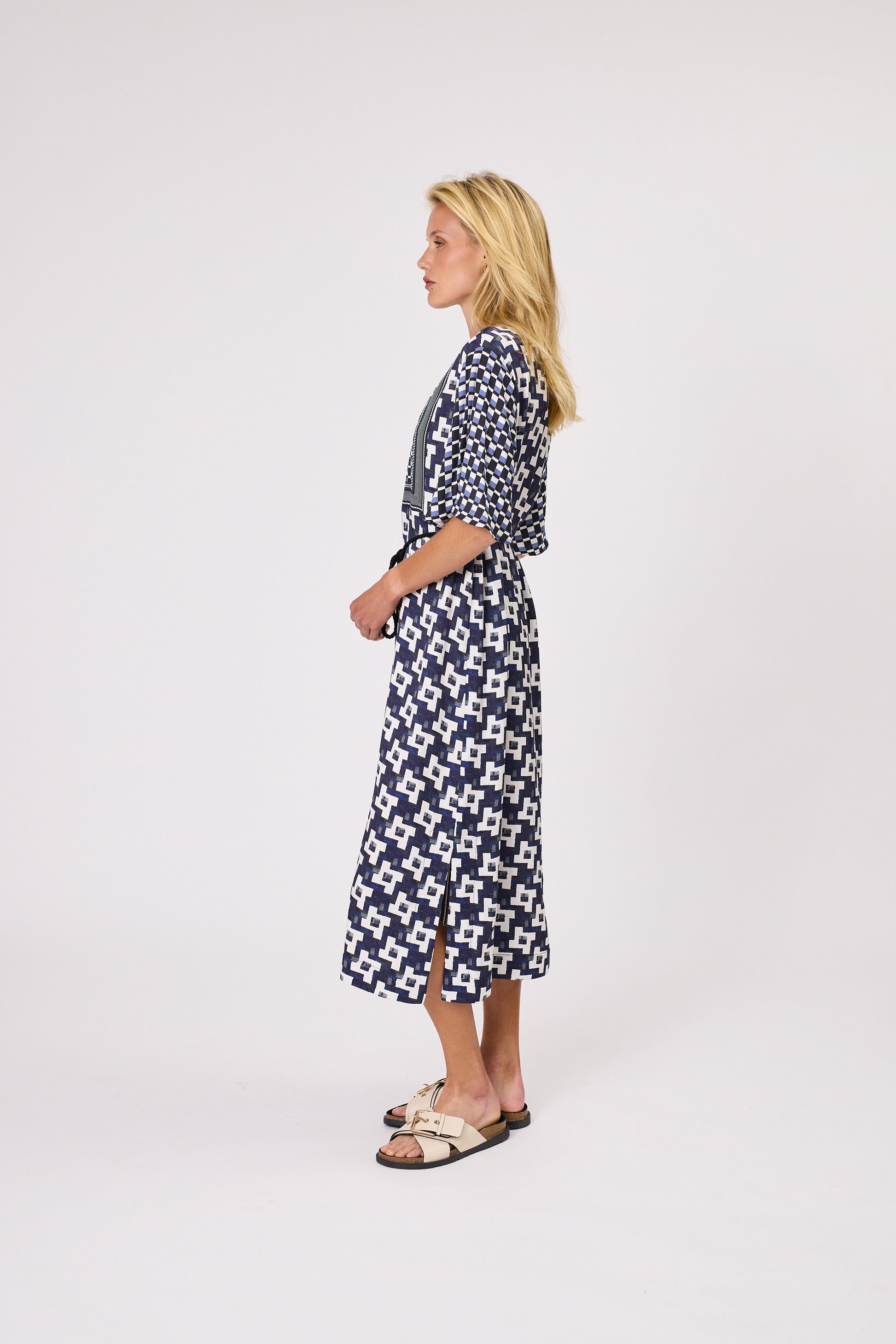 Allover Cortez print comfy dress. Set in armhole with wide bell sleeves. Round neckline with hook & eye opening at front. Midi length with side splits at hem. A separate rope belt that can be wear with or without it.