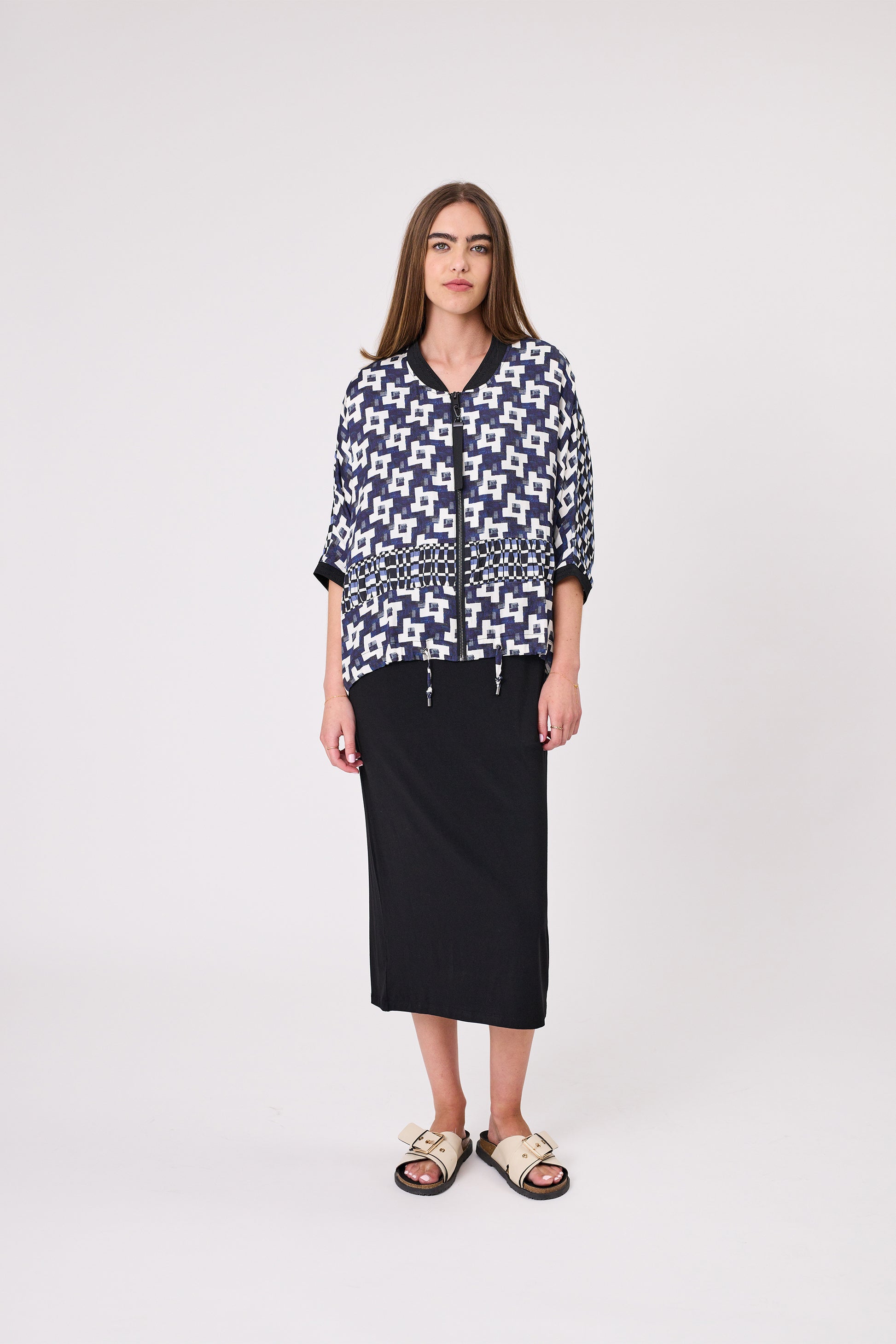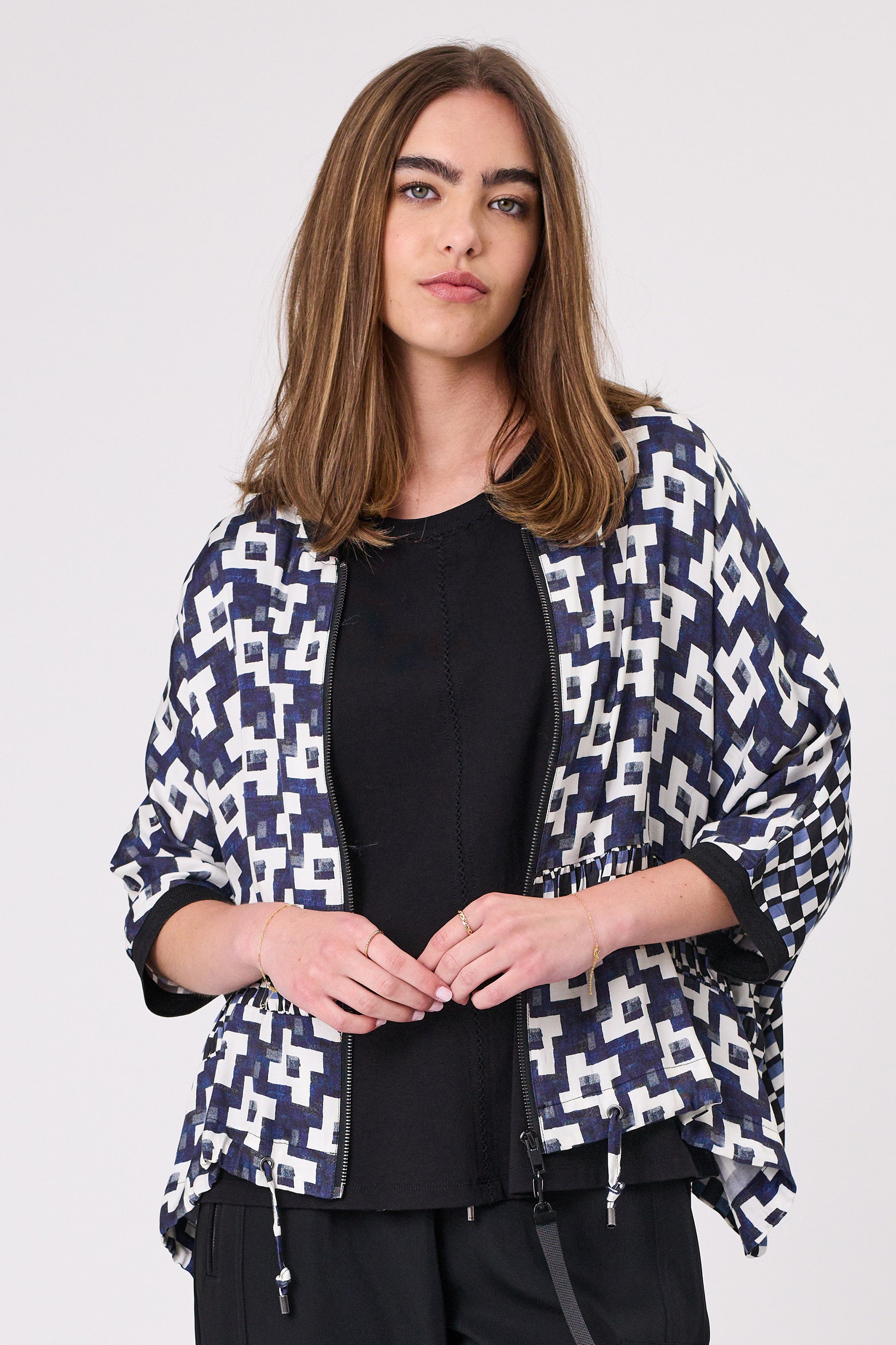 Drop shoulder Cortez print jacket is made of soft viscose fabric. It has ribbed neck and sleeves cuffs. Single ended zipper front opening and gathering at waist. Hem is finished with adjustable ties.