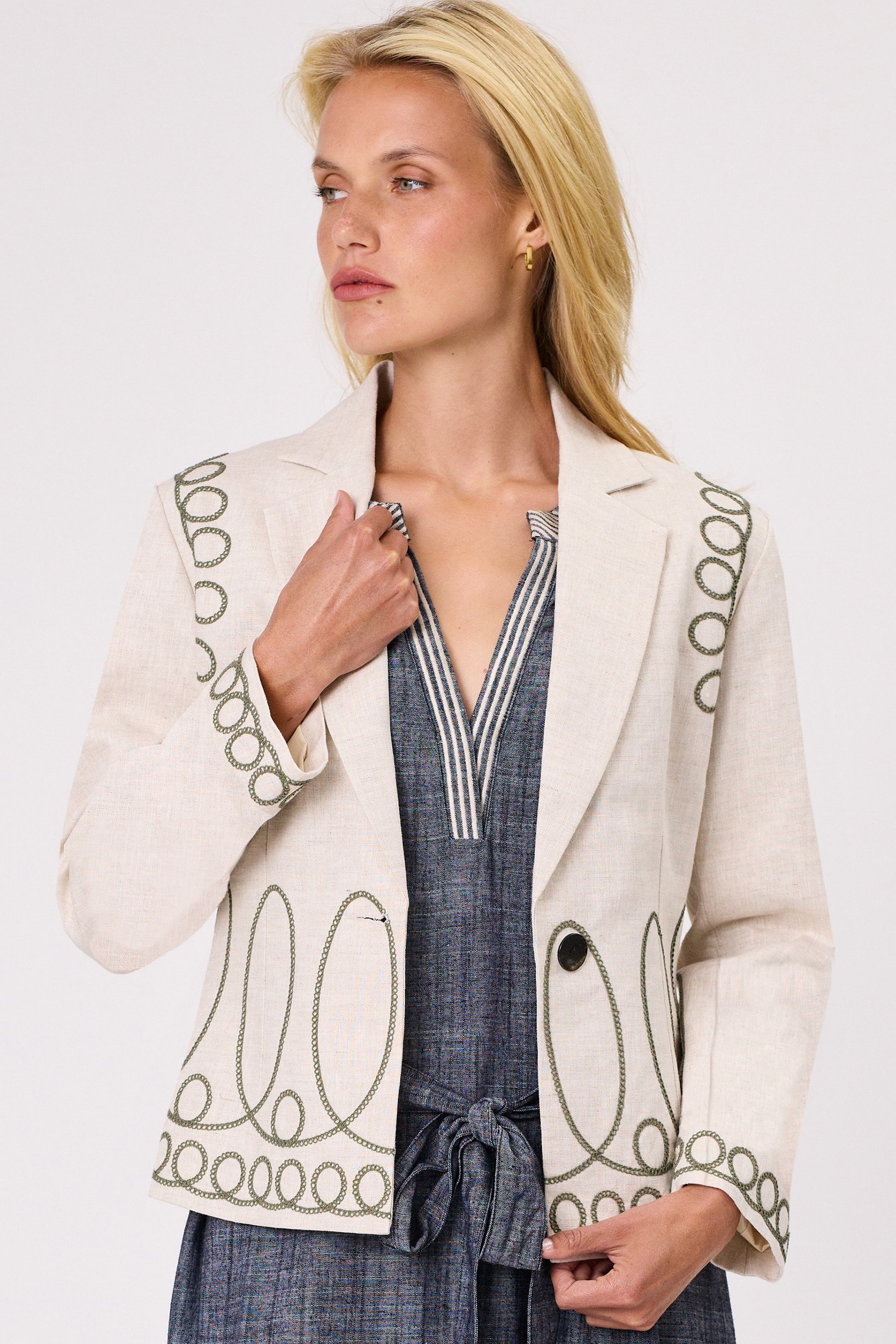 Long sleeves linen jacket. Fully Cotton lined. Embroidery around armhole, front,hem and sleeves. Lapel collar with button front opening .