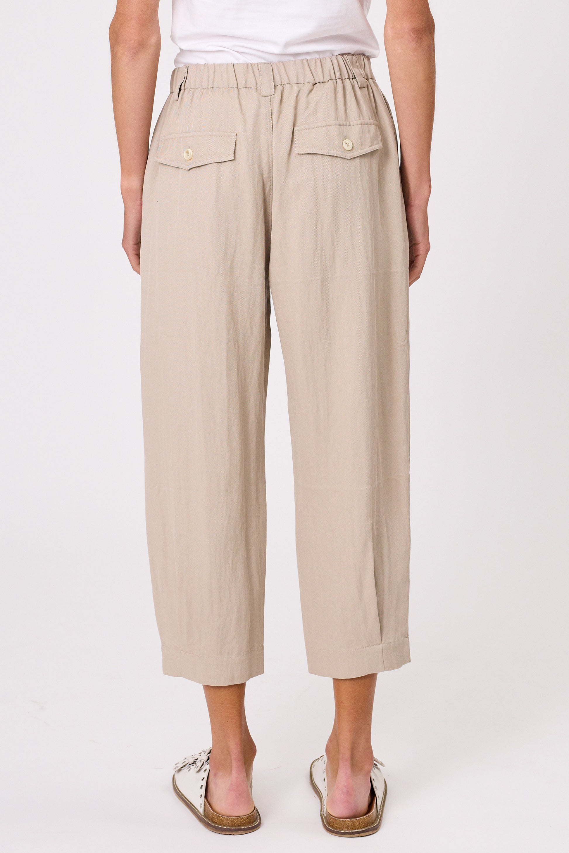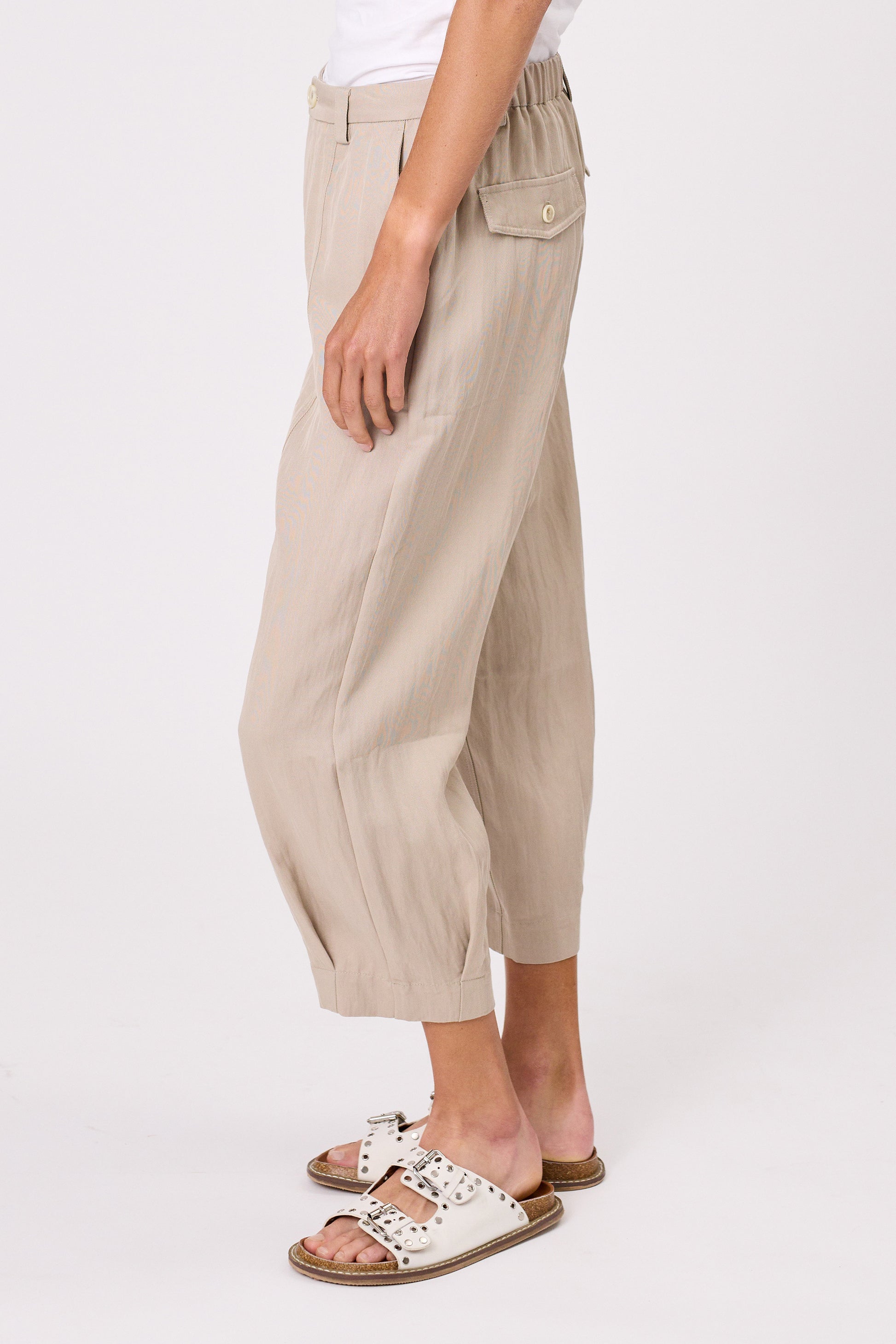 High rise,cropped pant with button and zipper front opening. Elasticated back waistband. Two front pockets and mock back pockets with flaps. Belt loops at waistband.
