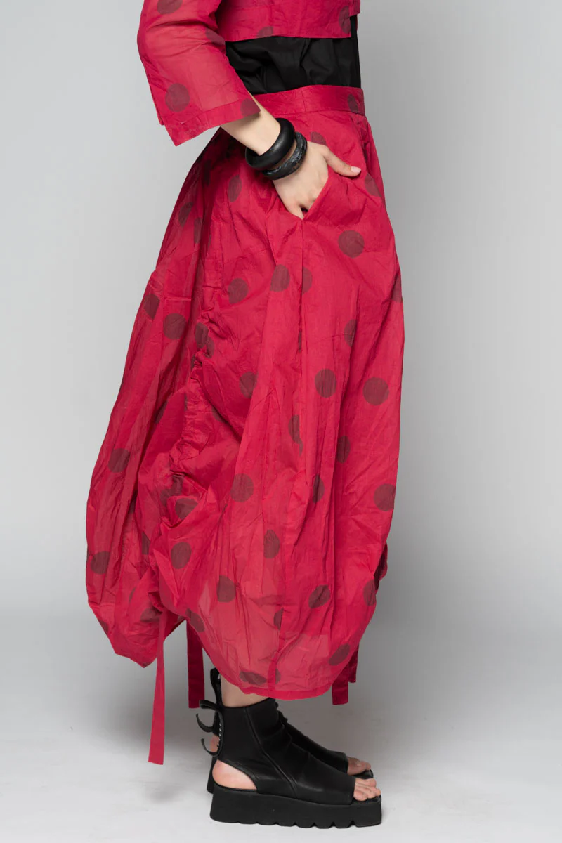 Air-light and a little theatrical, the Dotto Gather Skirt lets you play with shape. Crisp cotton organdy (dotted with our soft jacquard spots) floats over a voile lining, while ruched draw-ties run through the front and back panels. Cinch them for a sculptural bubble, loosen for an easy A-line—each pull changes the length, volume and mood. A smooth waistband keeps it neat at the waist; pockets make it practical. Crush the organdy gently in your hands for a lived-in crinkle that travels beautifully.