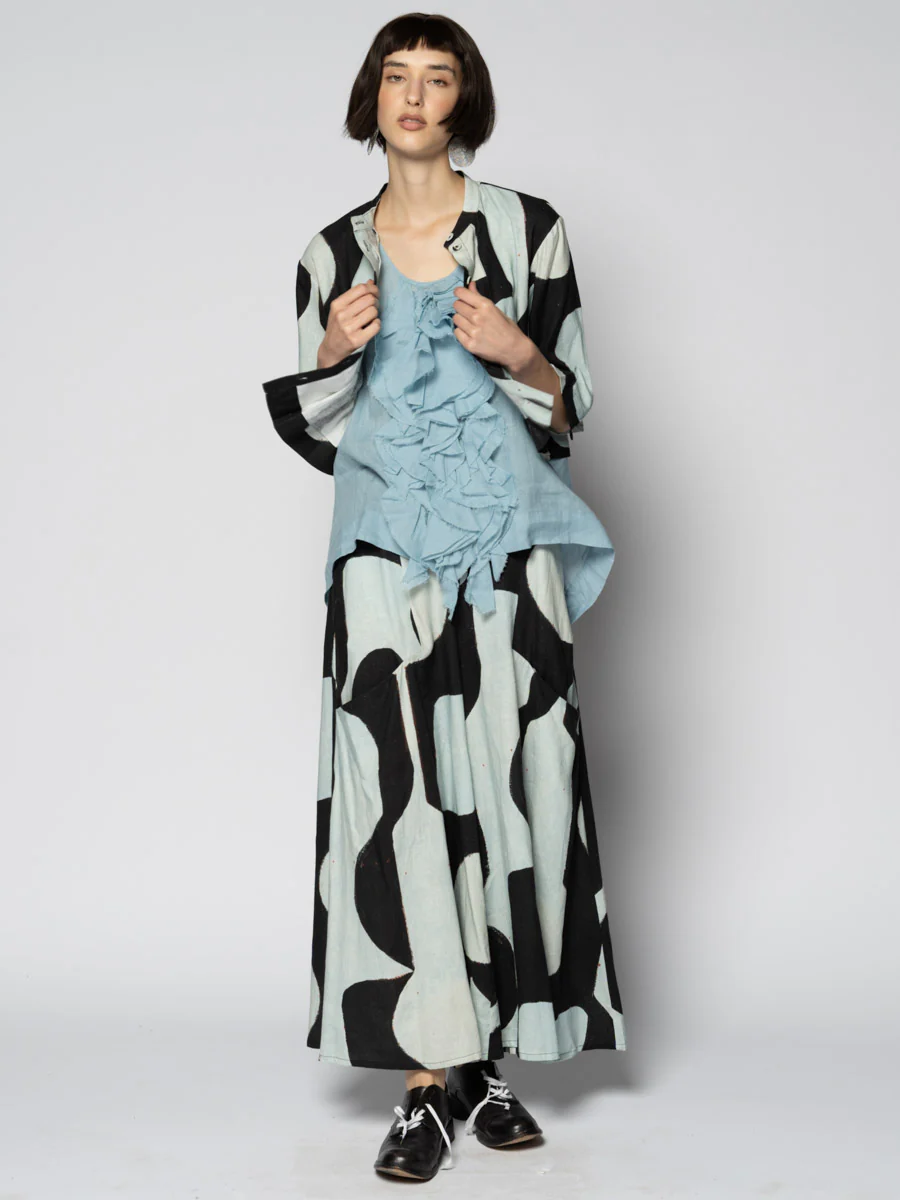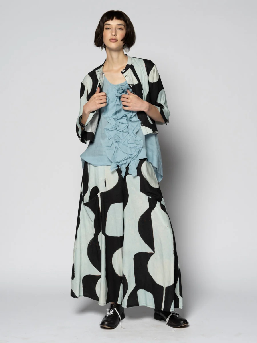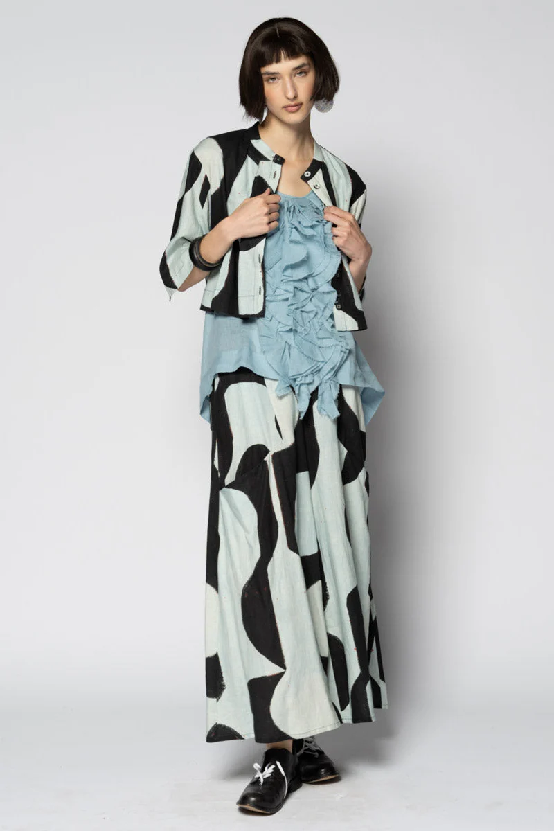 An art piece you can wear. The Kakure Short Jacket is cut in a comfortable linen–viscose blend and printed with Sally’s softly drawn “vessels”—organic forms that honour the quiet beauty of holding and sharing. Fresh and light for spring, Kakure brings gentle structure to soft layers. Wear it buttoned as a neat top or open as an easy jacket—the cropped proportion sits beautifully over dresses and high-waist pants.