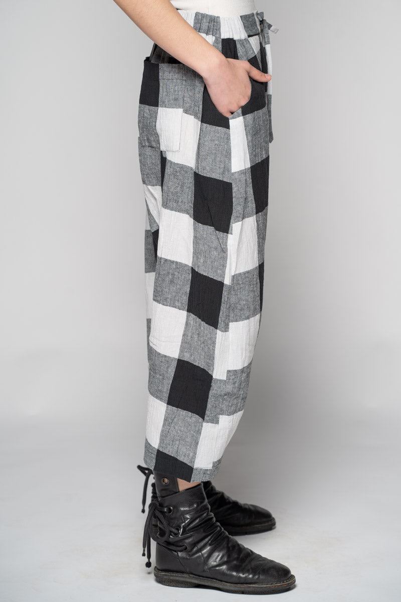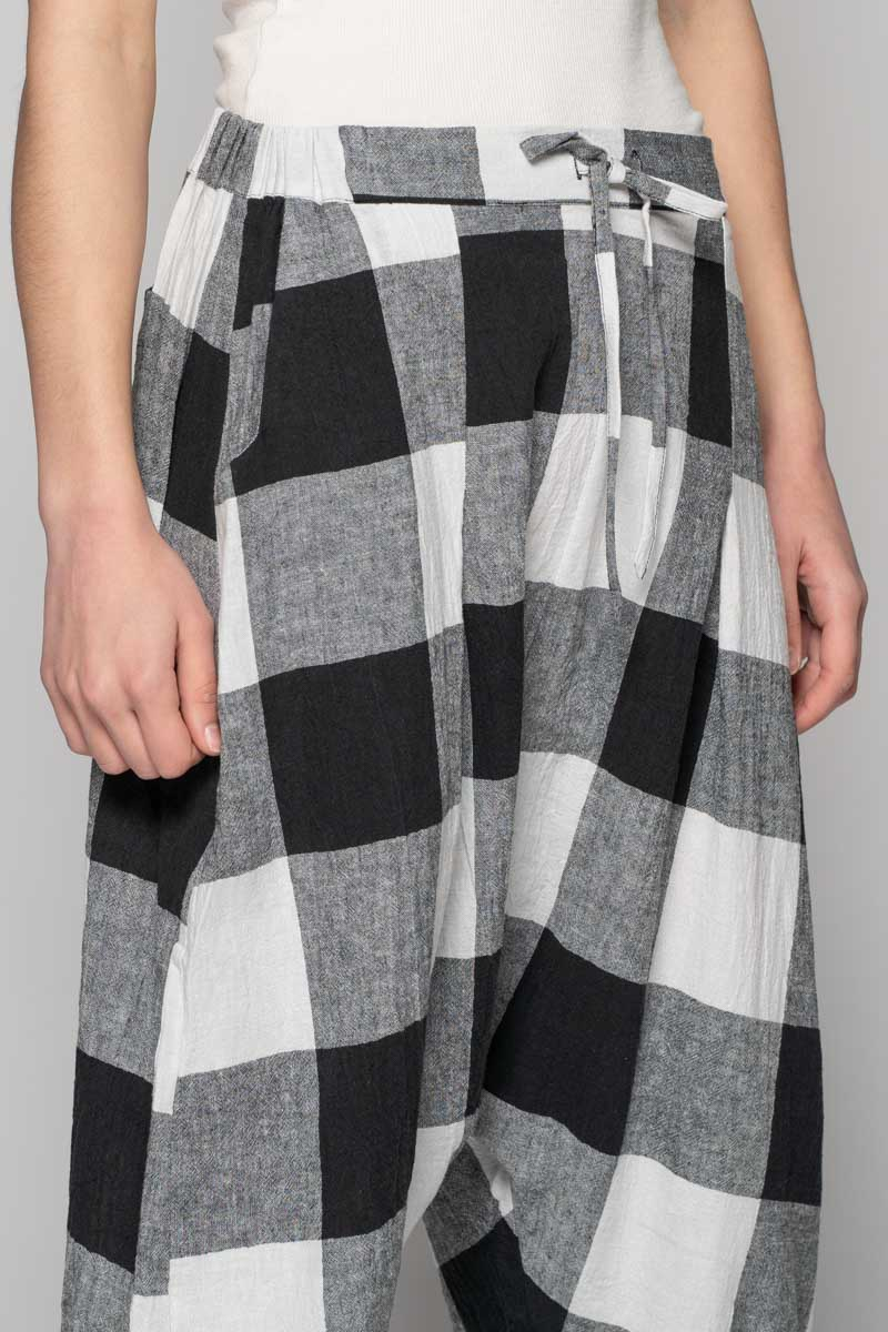 Easy, artful, and endlessly wearable—the Okina Pants lean into comfort without losing shape. Cut in our soft check linen, they fall from a gently structured waistband into relaxed pleats, then taper to a cropped ankle for a flattering balance of volume and line. The considered drop-crotch moves with you, while the breathable cloth keeps things cool and effortless from spring through high summer. Slip them on and let the texture do the talking.