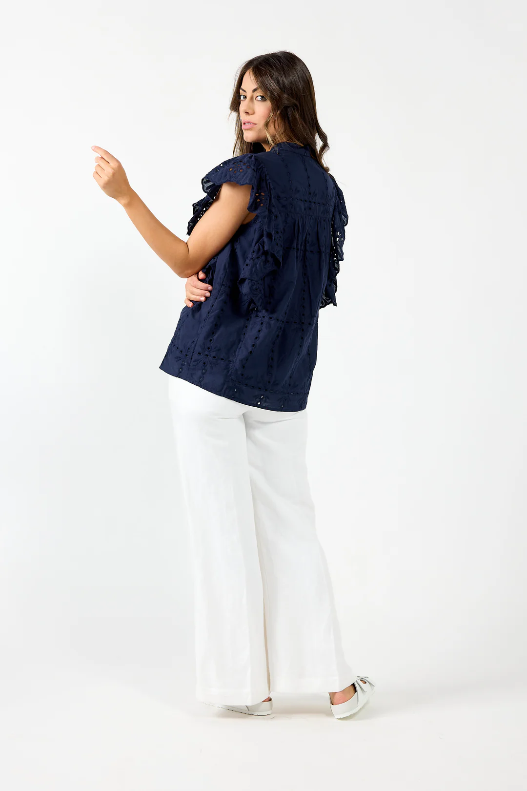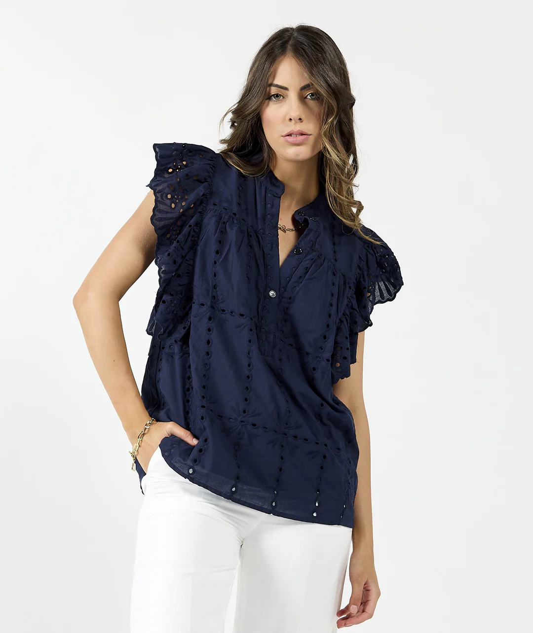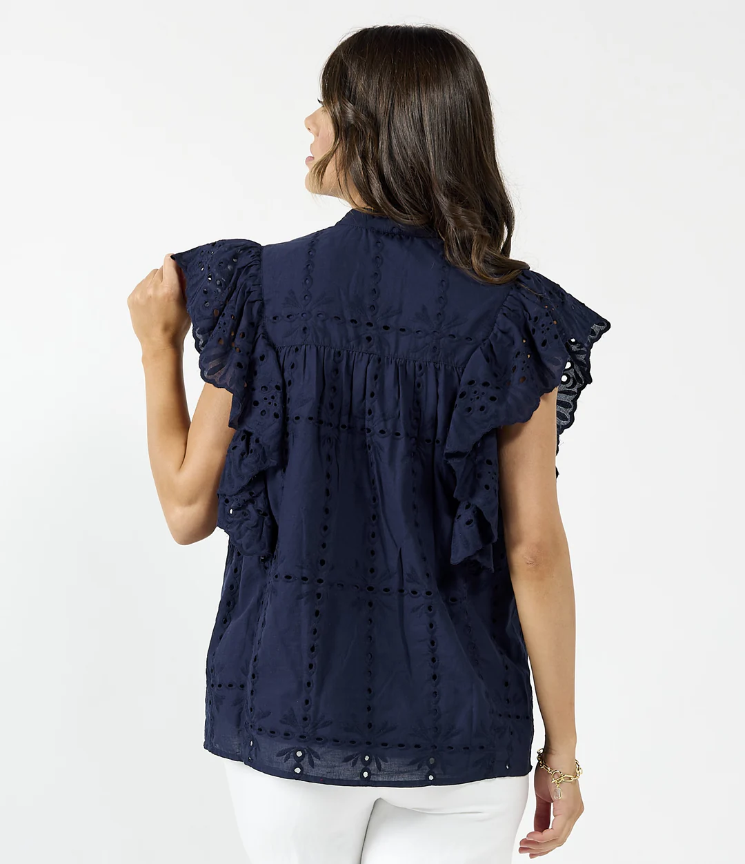 Elevate your summer wardrobe with the must-have "Cards Top" by Drama the Label. This elegant piece features delicate Embroidery Anglaise, a stylish Chinese Collar, a half-placket Button front, and Sleeveless design with a cascading Frill that gracefully covers the top of your arms. Fully lined for comfort and quality. Pair this top with Drama Shorts or Pants for a chic and sophisticated look.