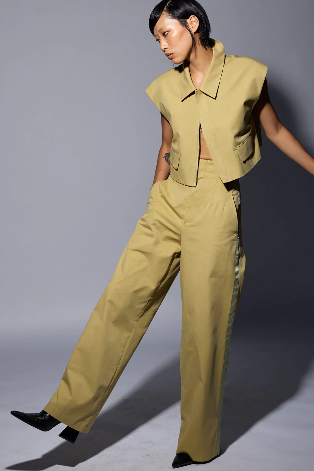 Introducing our Alarm Pant, designed in a lightweight tencel-cotton blend fabric and tailored with a high rise fit. These wide leg pants feature a zip fastening, grosgrain detail down the side and side pockets, combining modern styling with utilitarian flair. Create the perfect fashionable set by pairing the Alarm Pant with the Unco Vest.