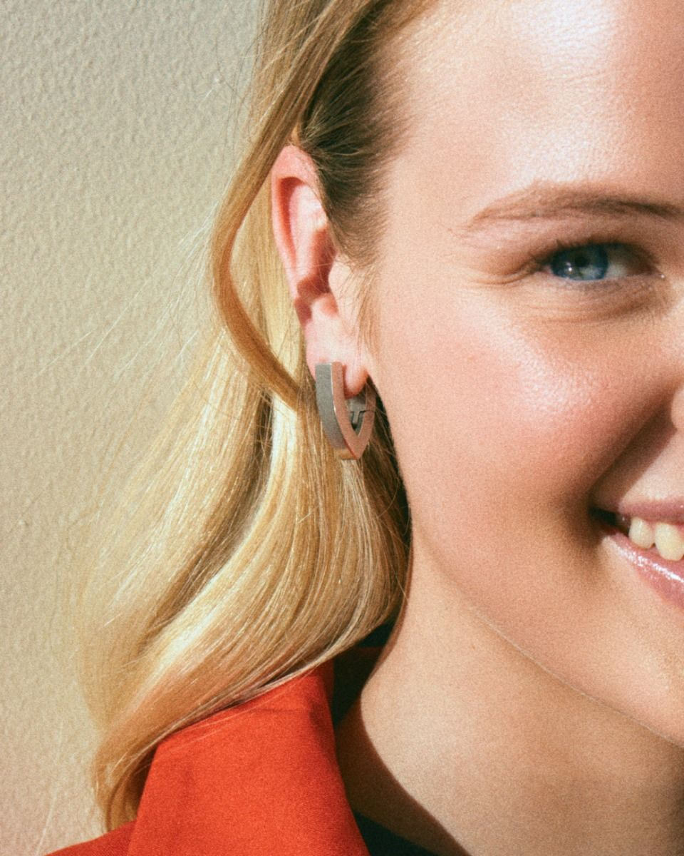 Valley is a small line with plenty of attitude, offering a beautiful design that is both soft and sharp at the same time. Seen here in larger hoops in shiny stainless steel that close around the earlobe. A striking and cool detail for both everyday and festive occasions.