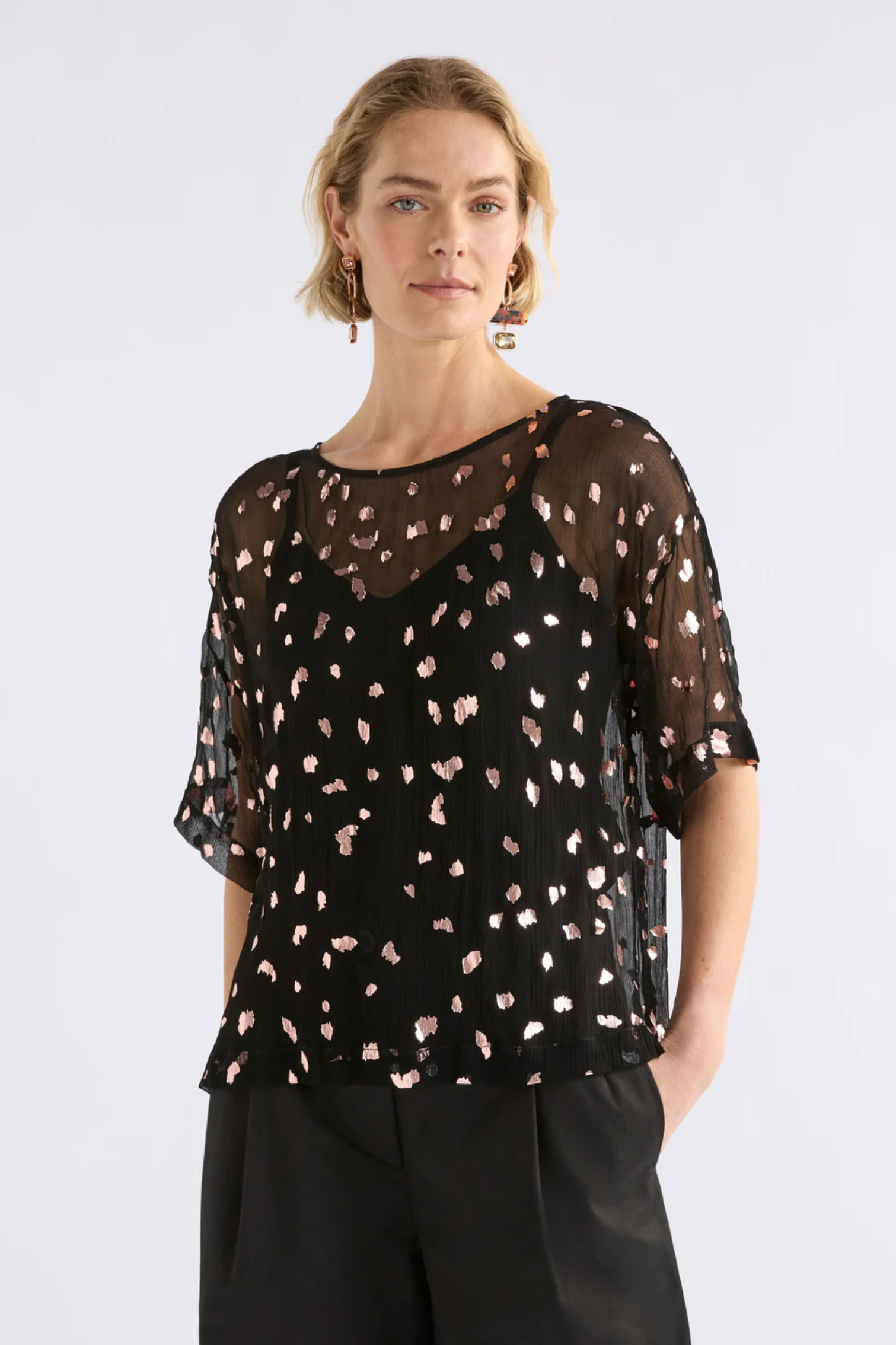The Artii Top is a statement evening style crafted from a sheer crinkle chiffon with a glistening speckle foil print. Crafted from a responsibly sourced viscose with a silk-like feel and floaty drape. This round neck top has dropped shoulders and relaxed wide sleeves. Style over a black cami or bralette and pair with statement metallic jewels for a complete evening look.