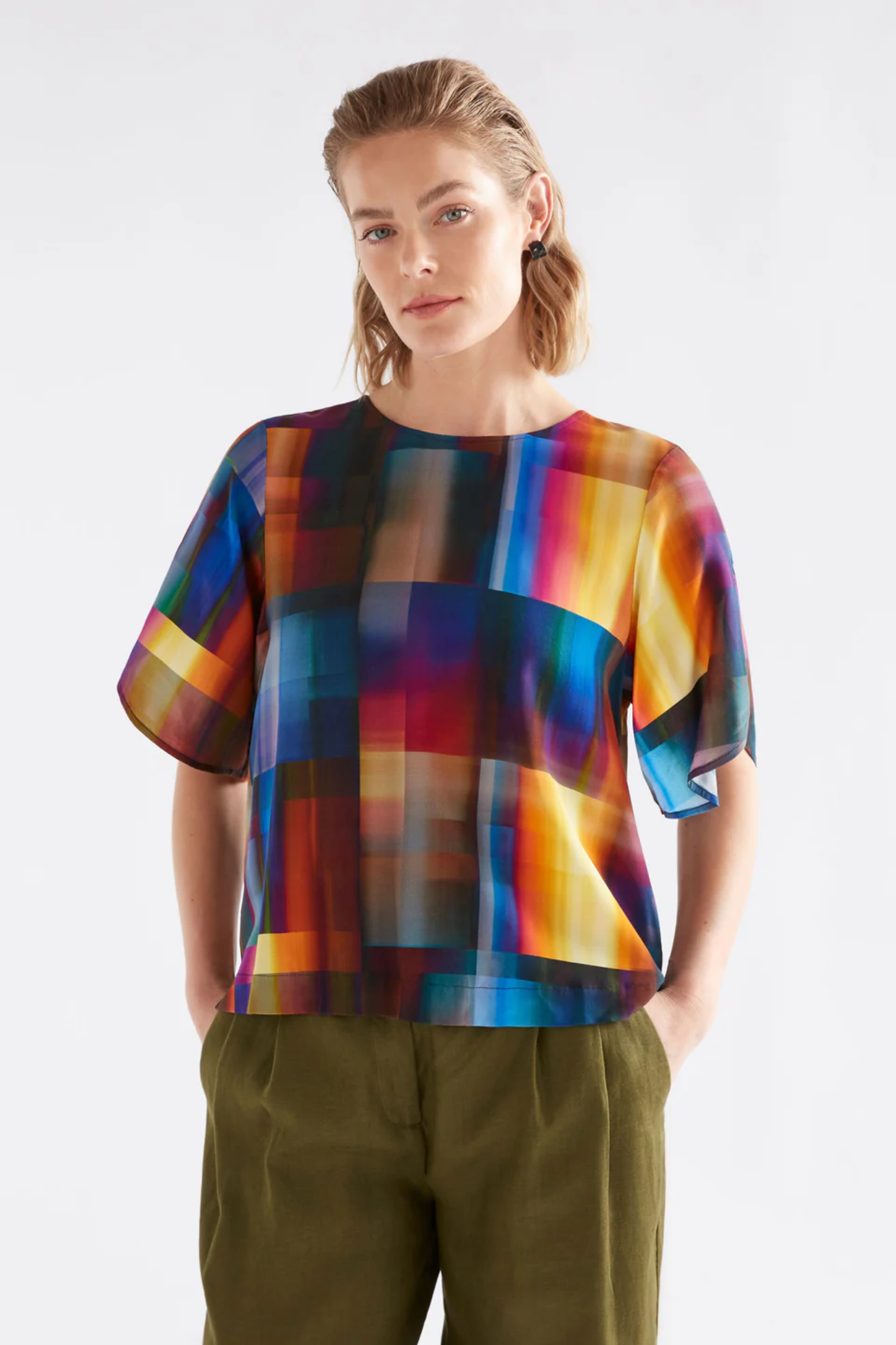 The Byde Top is a classic silhouette with thoughtful design details. Printed in the vibrant Ekko Print, this top features short raglan, tulip sleeves that elongate and flatter the arm, while providing coverage. The simple crew neckline and centre back neck placket with press stud closure a provide a clean silhouette for the print to take centre stage. Crafted from a silky soft ECOVERO™ viscose blend that is floaty and lightweight with a matte sheen. A regular fit bust flows into a slightly relaxed A-line hem. Pair with tailored pants for desk-to-dinner outfitting or wear tucked into the Jopa Pant for evening styling.