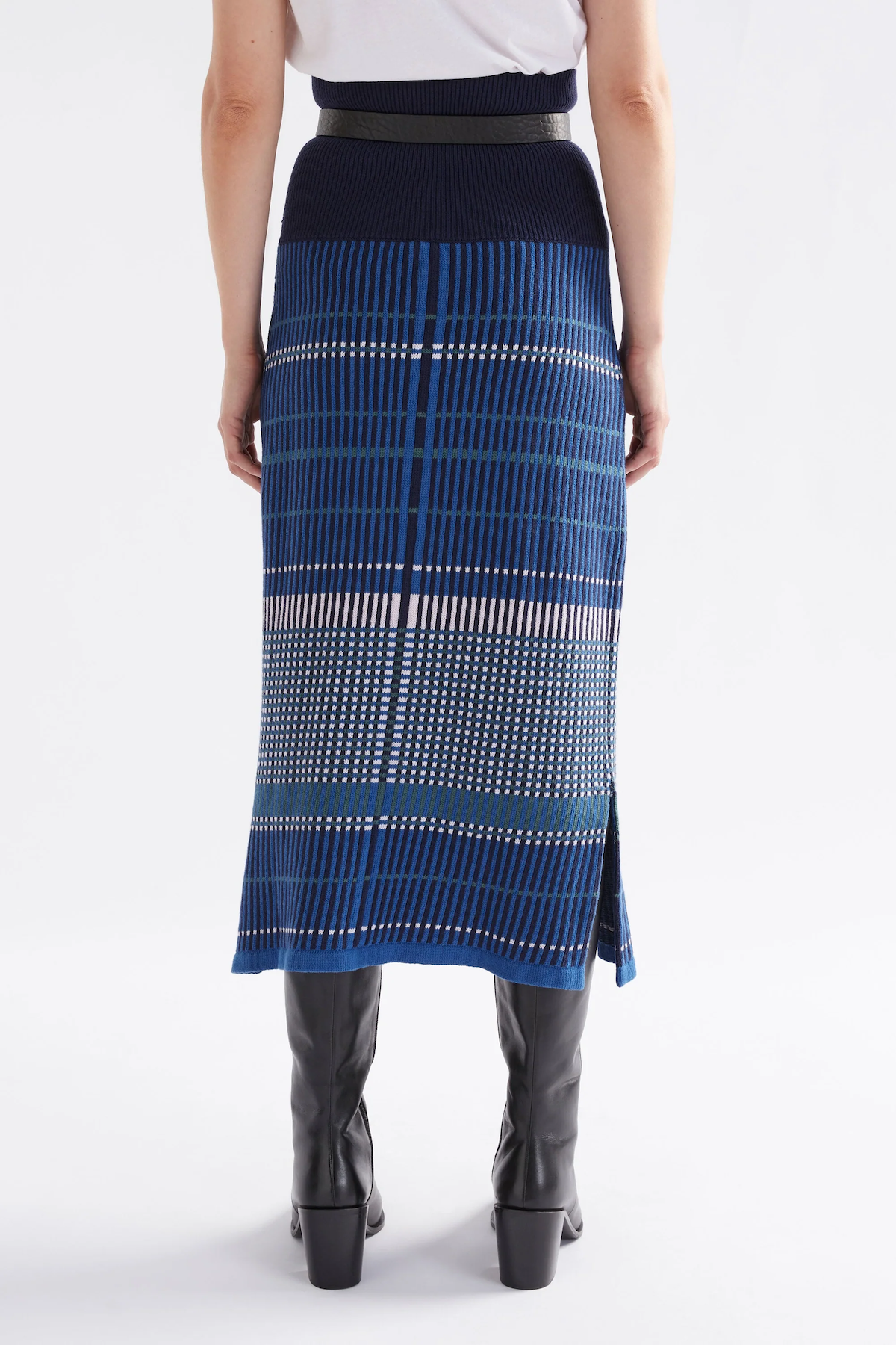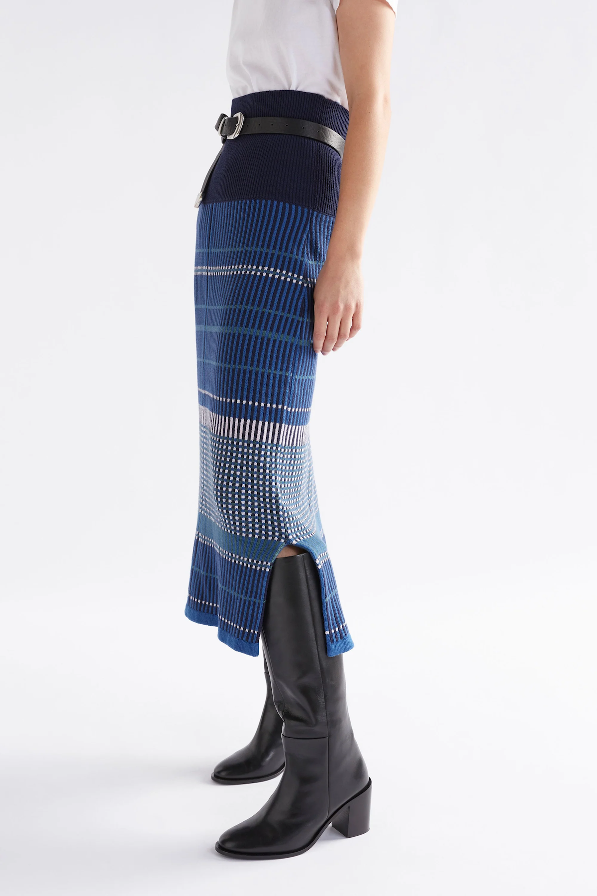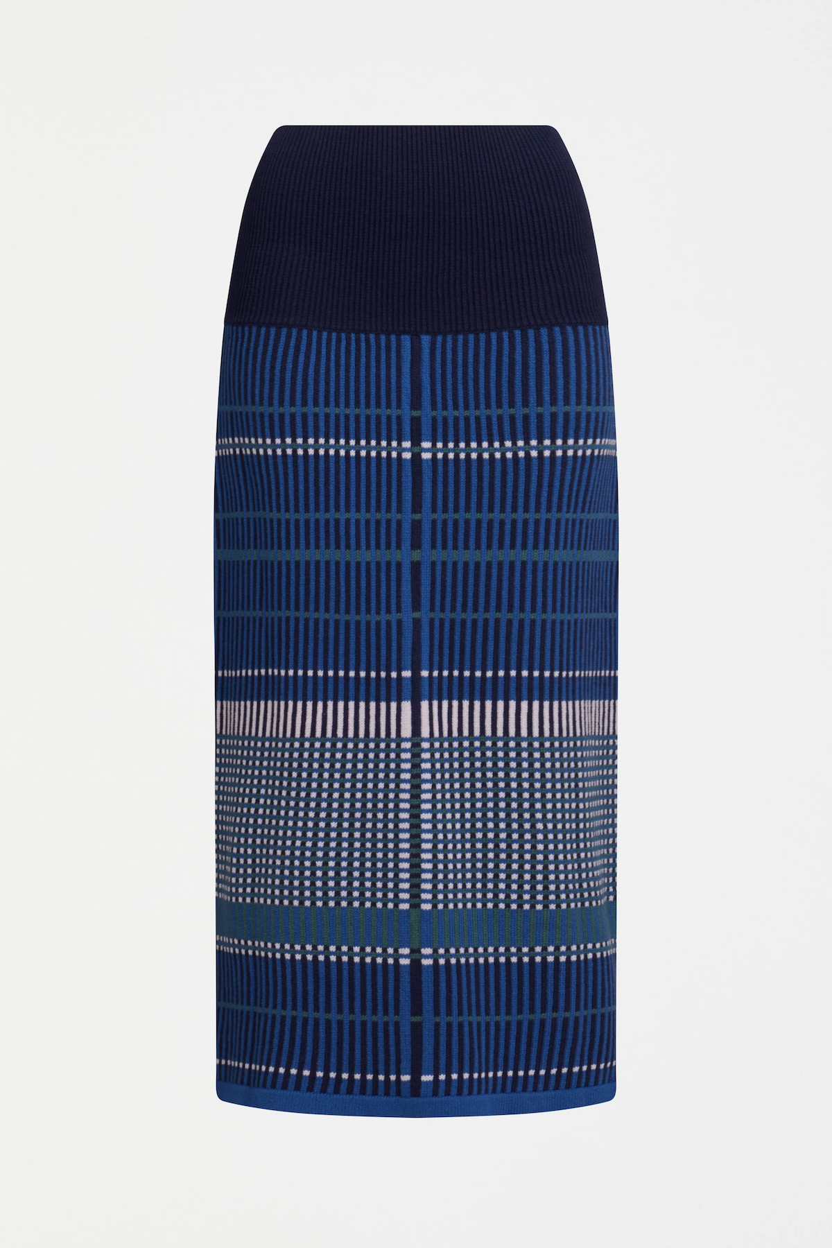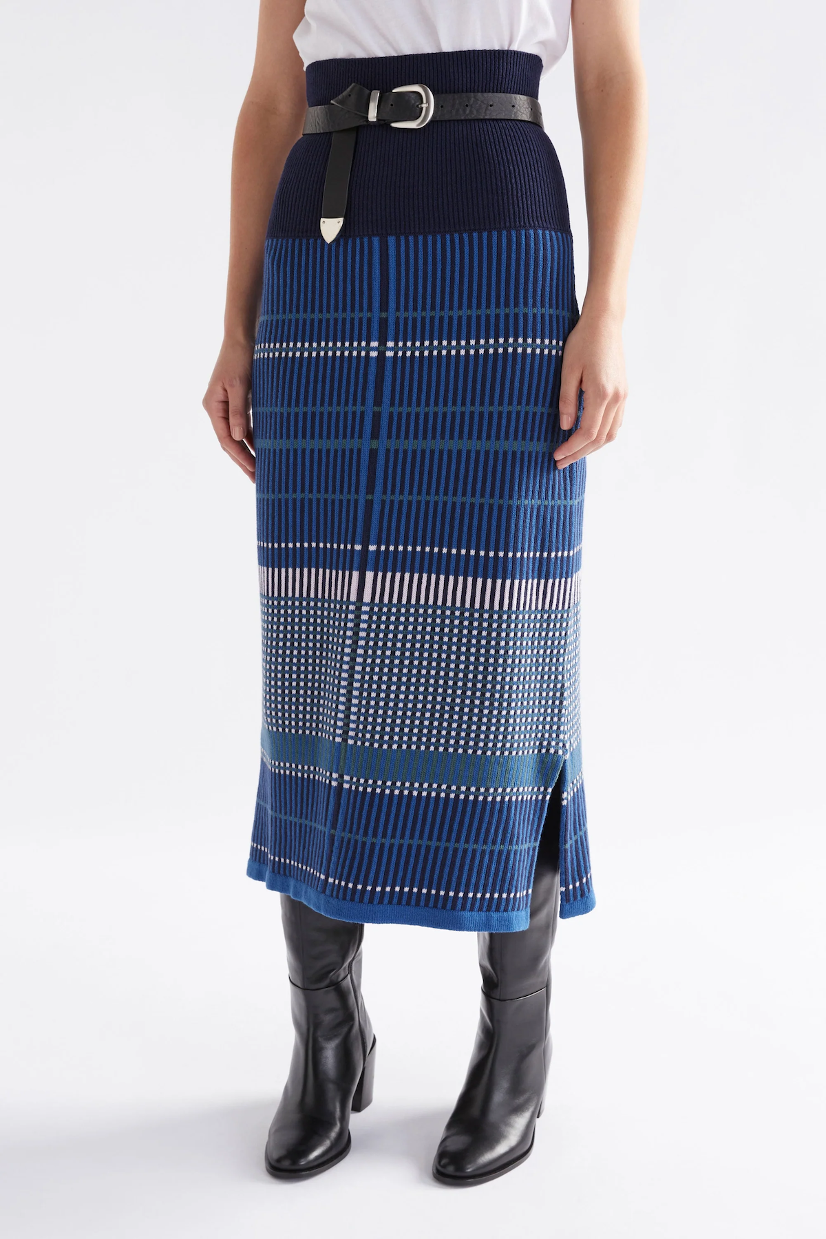 It's back! And better than ever. Our Cila skirt is a tonal knit crafted from 100% organic cotton and offers softness, warmth, and endless styling potential. This straight-cut skirt features a tonal blue check design, a wide ribbed waistband that can be worn extended or folded, and subtle side splits at the hem for ease of movement. Style it as a co-ord with the Cila Knit Jumper and knee-high boots for chilly days, or keep it casual with a classic white tee for those unpredictable autumn moments.