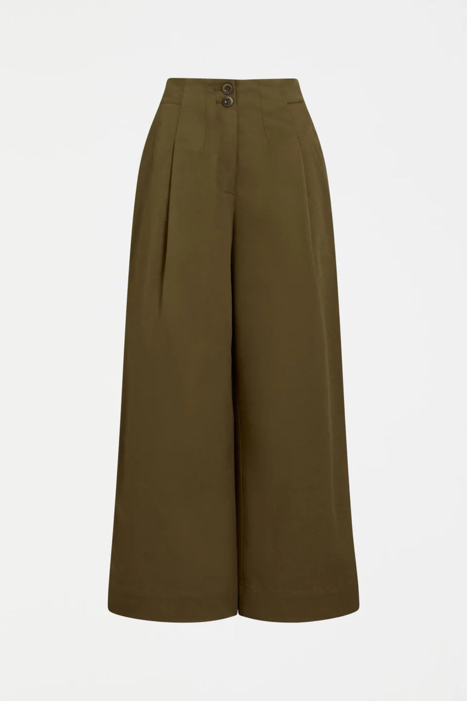 Crafted from a blend of organic cotton, TENCEL™ Lyocell and elastane for a balance of structure, softness, and stretch. The Ellem Pant has a high-rise waist and wide straight-leg silhouette, in a medium weight, twill textured fabrication. The touch of elastane ensures a comfortable fit and helps to maintain its shape. Front pleats flatter the figure while adding extra comfort. These full length pants, feature a wide waistband with double button closure and back darks for a flattering tailored fit. The perfect desk-to-dinner pant
