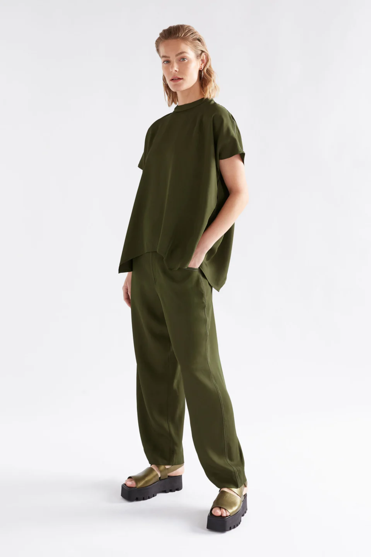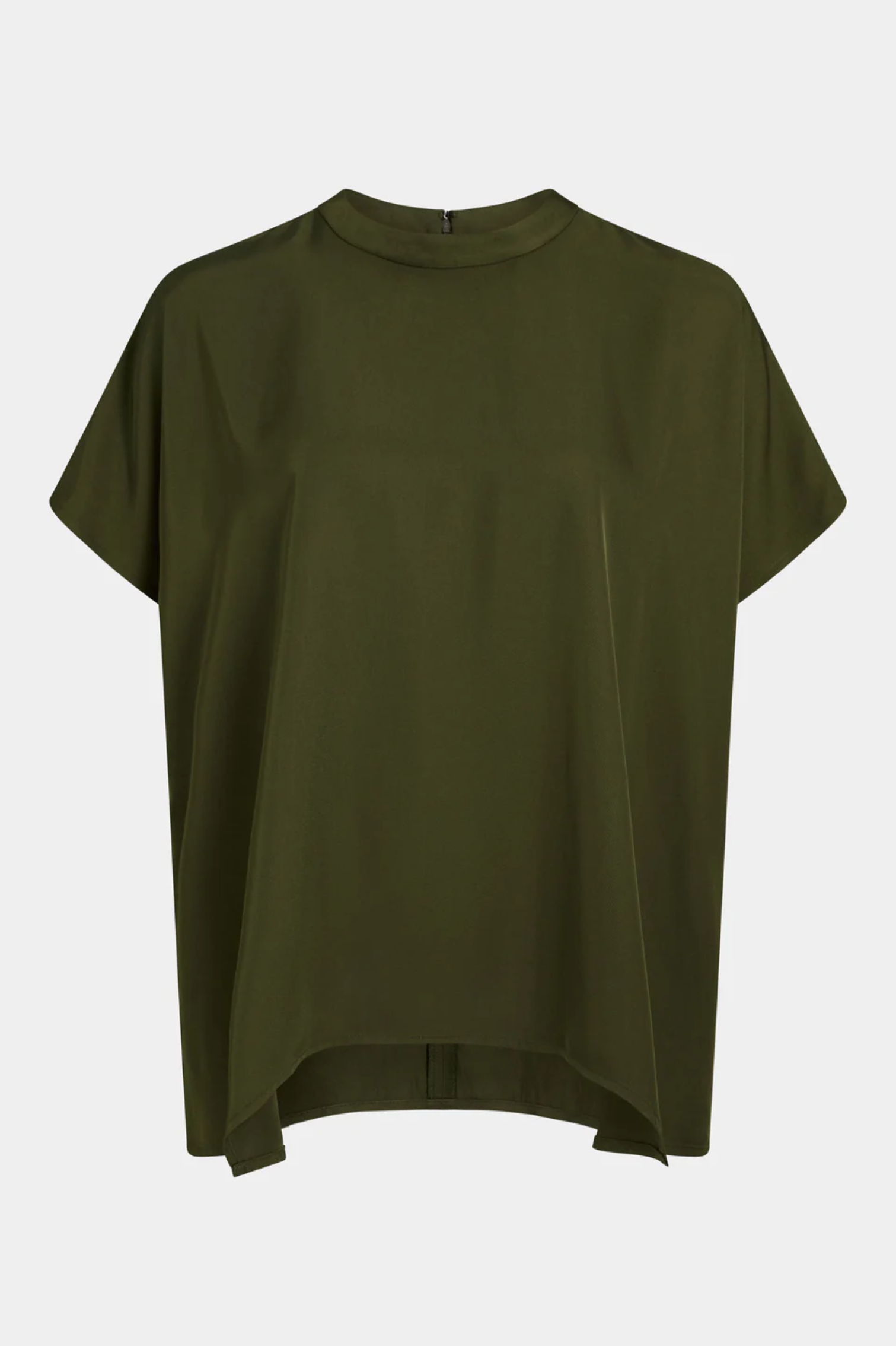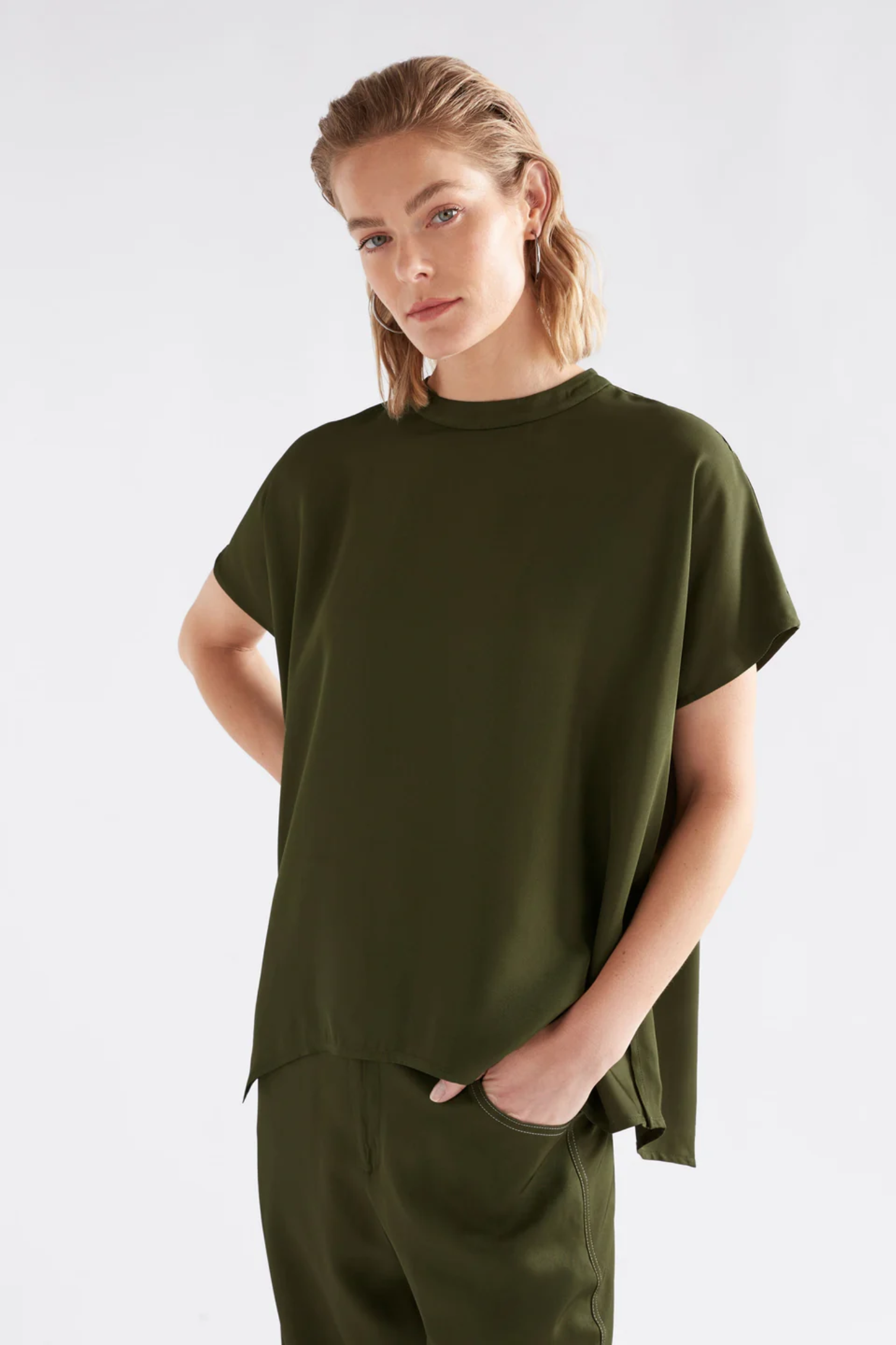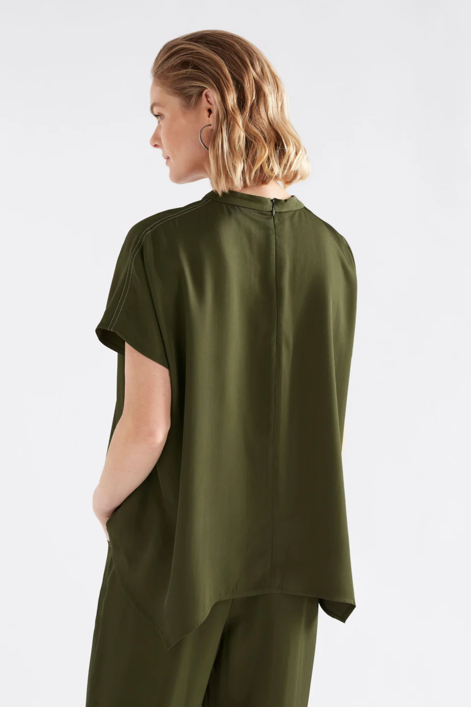 The Hullu Top encapsules relaxed sophistication with its easy, loose silhouette combined with its high, round neckline and contrast topstitch detailing that adds structure and definition to this modern shape. Crafted from a luxuriously, fluid NAIA™ acetate that offers a cool, structured, silk-like softness, subtle sheen and excellent drape and breathability. Featuring a subtle high-low, handkerchief hemline and short batwing sleeves, this piece looks great with the matching Hullu Pant or the Slinki Skirt for day-to-evening ensembles