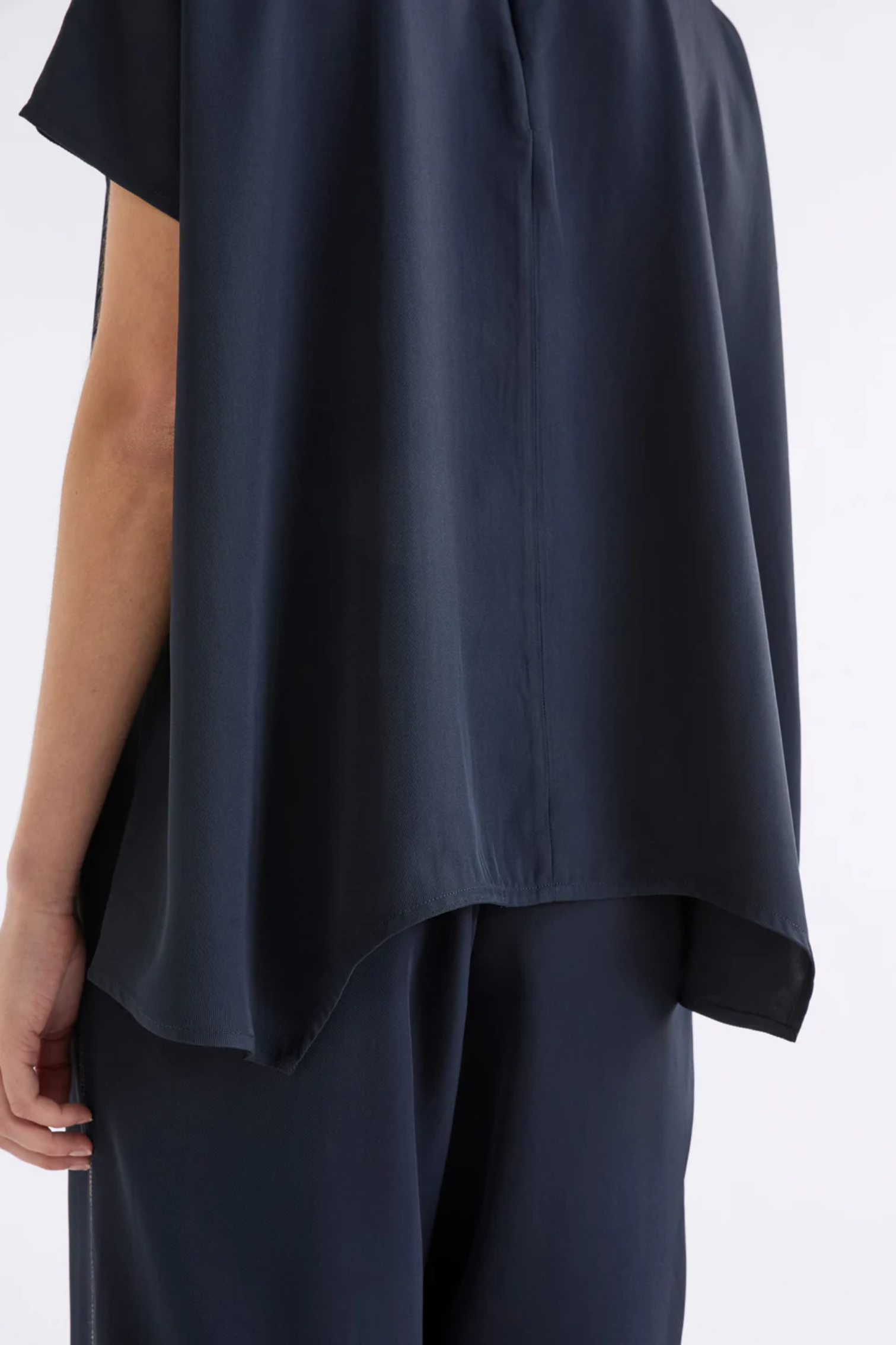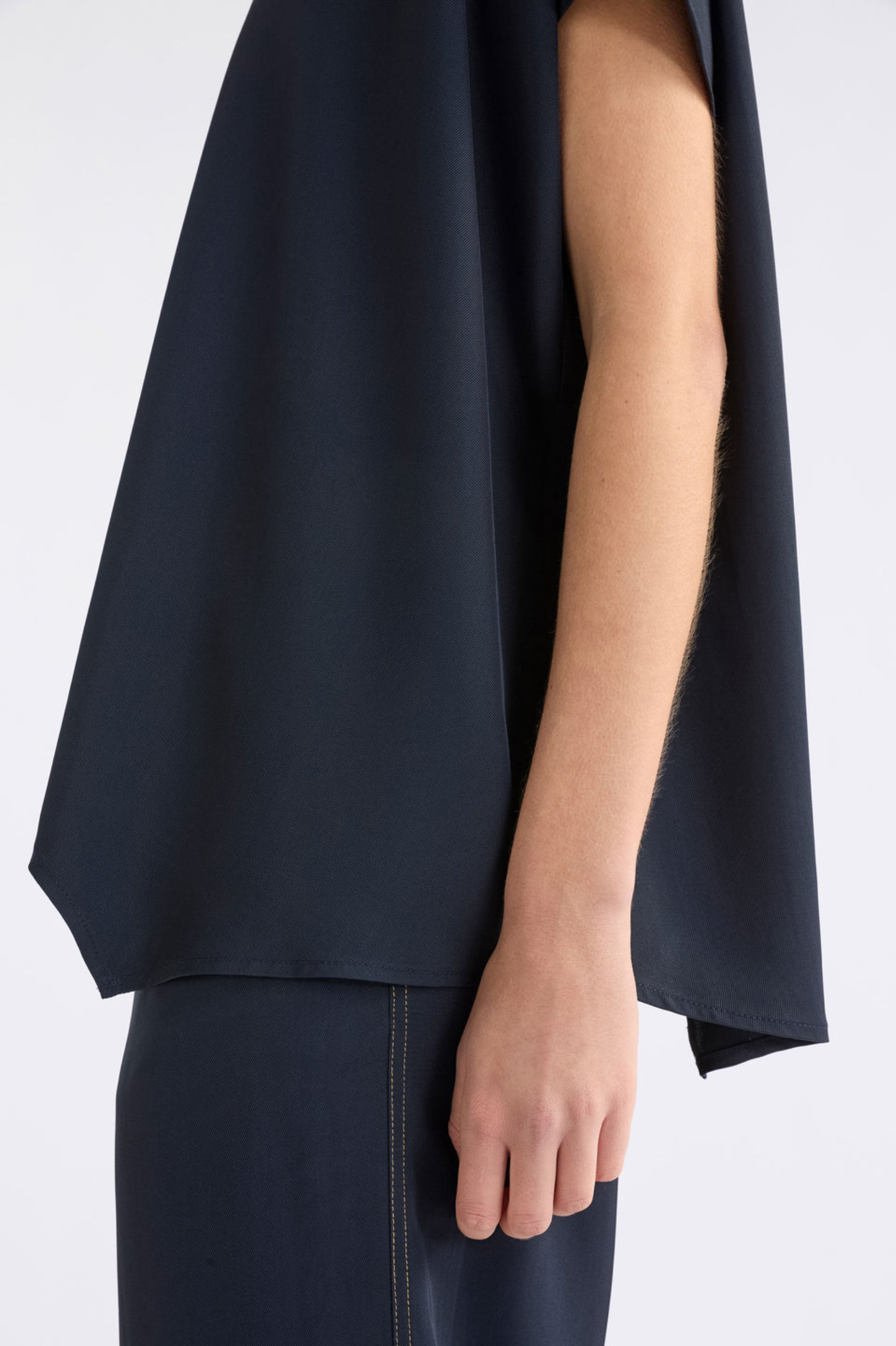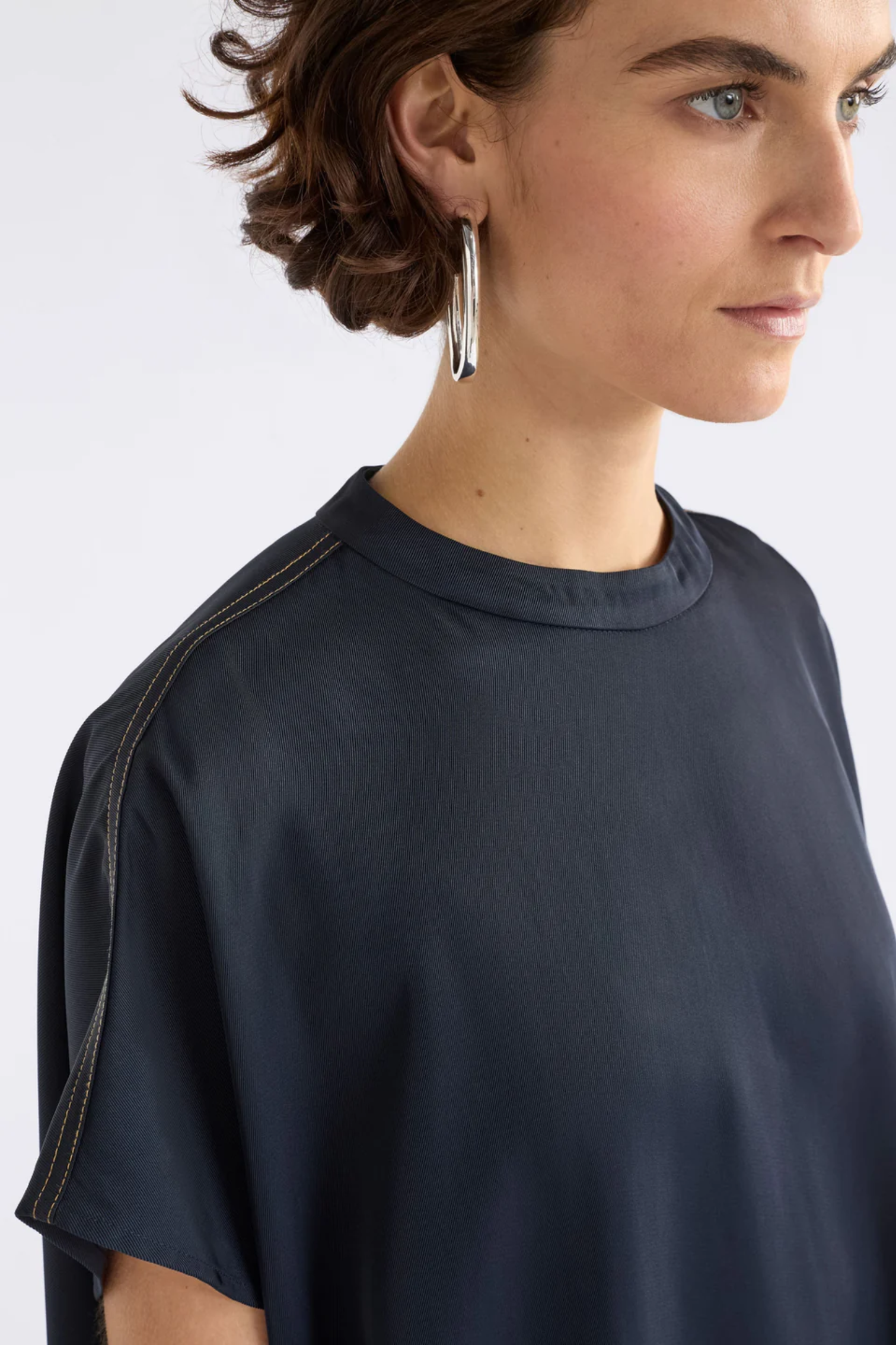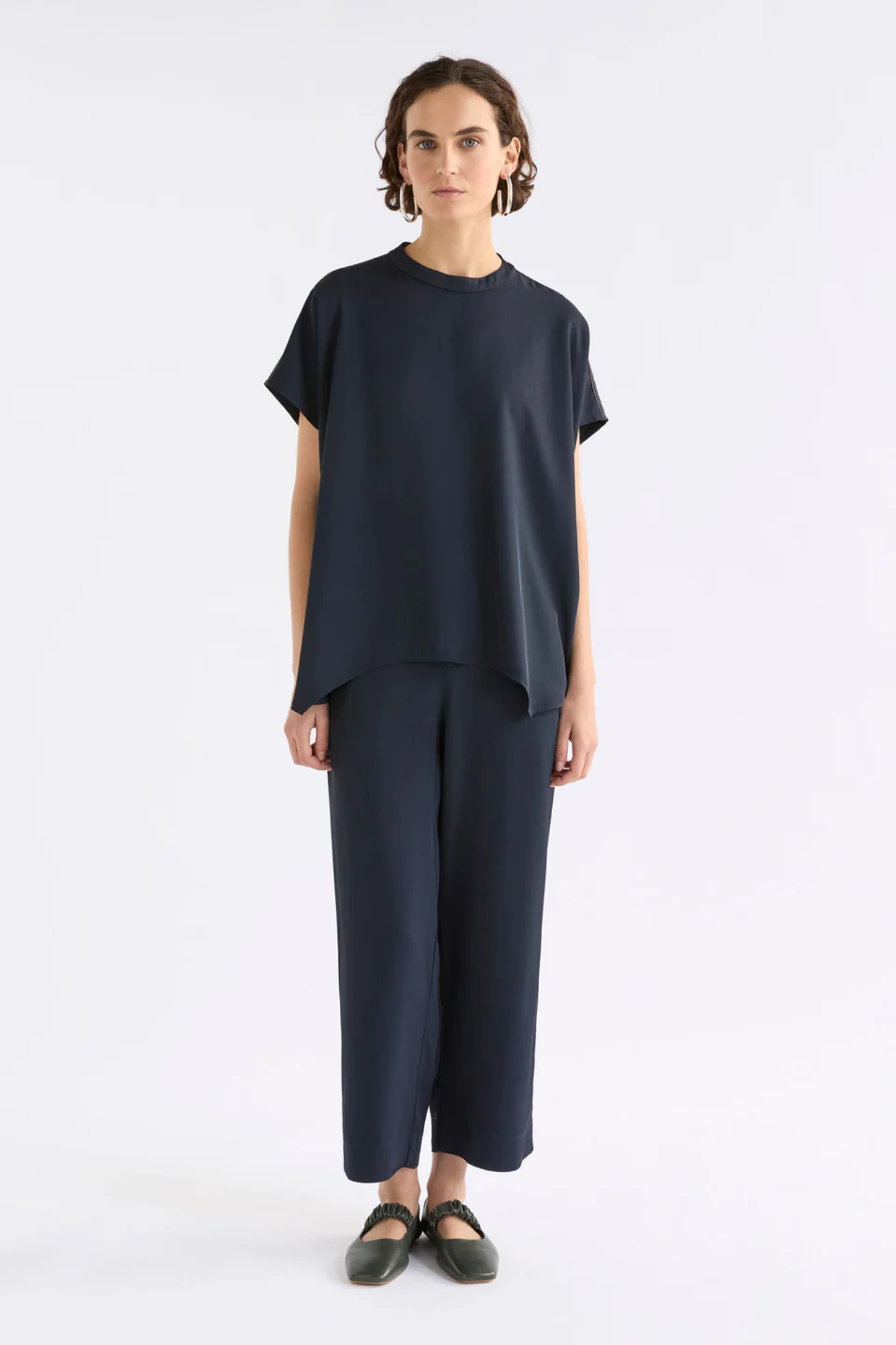 The Hullu Top encapsules relaxed sophistication with its easy, loose silhouette combined with its high, round neckline and contrast topstitch detailing that adds structure and definition to this modern shape. Crafted from a luxuriously, fluid NAIA™ acetate that offers a cool, structured, silk-like softness, subtle sheen and excellent drape and breathability. Featuring a subtle high-low, handkerchief hemline and short batwing sleeves, this piece looks great with the matching Hullu Pant or the Slinki Skirt for day-to-evening ensembles