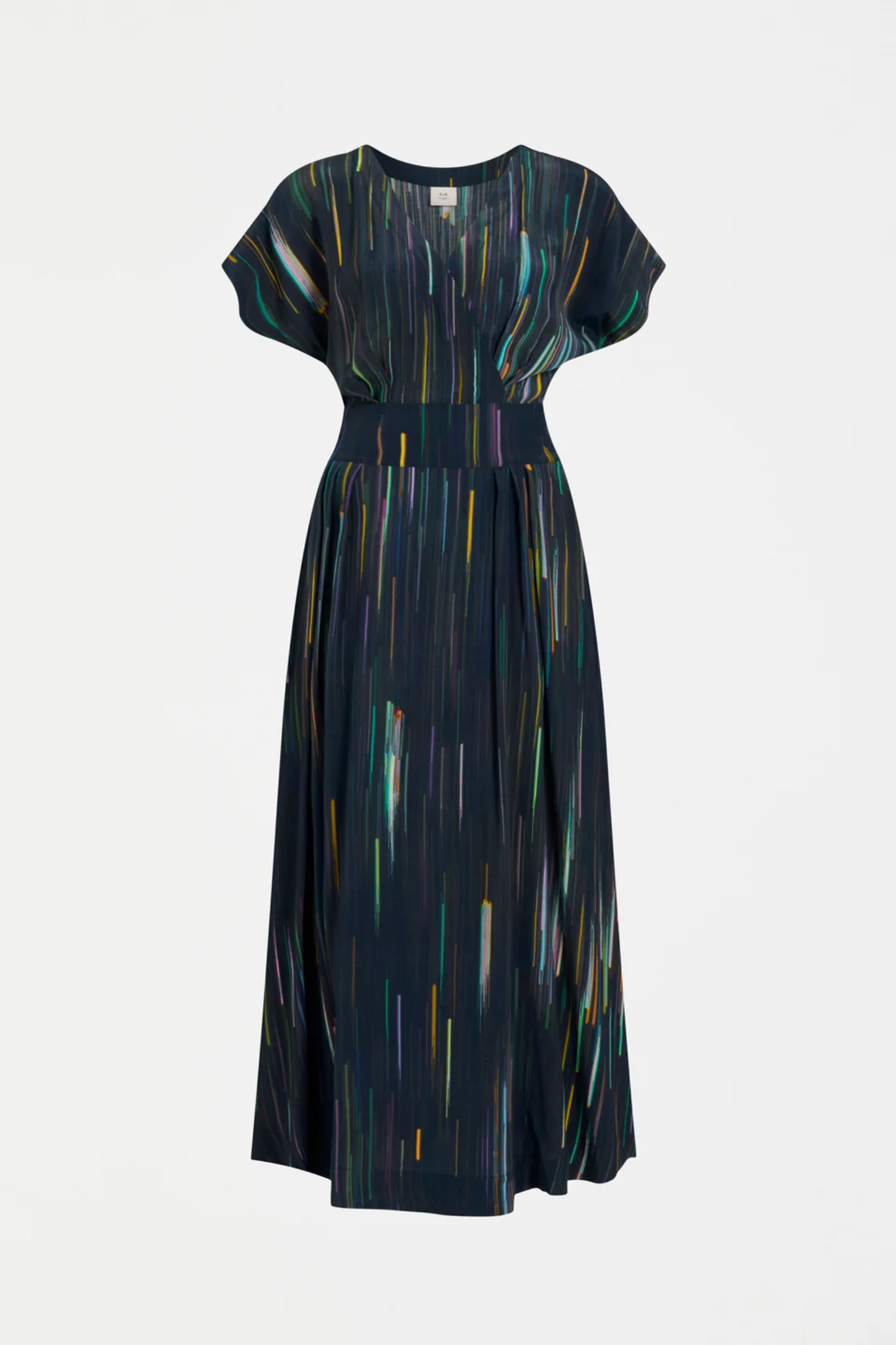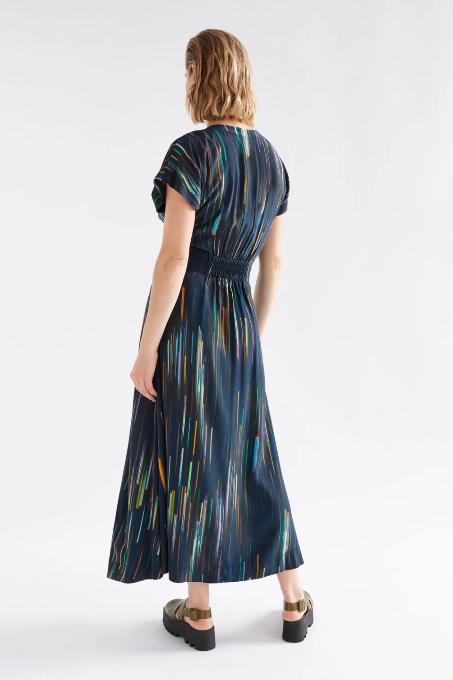 The Kayra Dress is the perfect occasion piece, showcasing the striking and sophisticated Alinea Print of abstracted light streaks on a classic navy background. Featuring a crossover V-neck, batwing sleeves, wide fitted waistband with elastic at the back for comfort and front tucks under the bust adding ease. The midi to long length A-skirt is gently gathered for added volume. Pair with the Jyrti Platform sandal and Rymi Drop Earring for an evening look