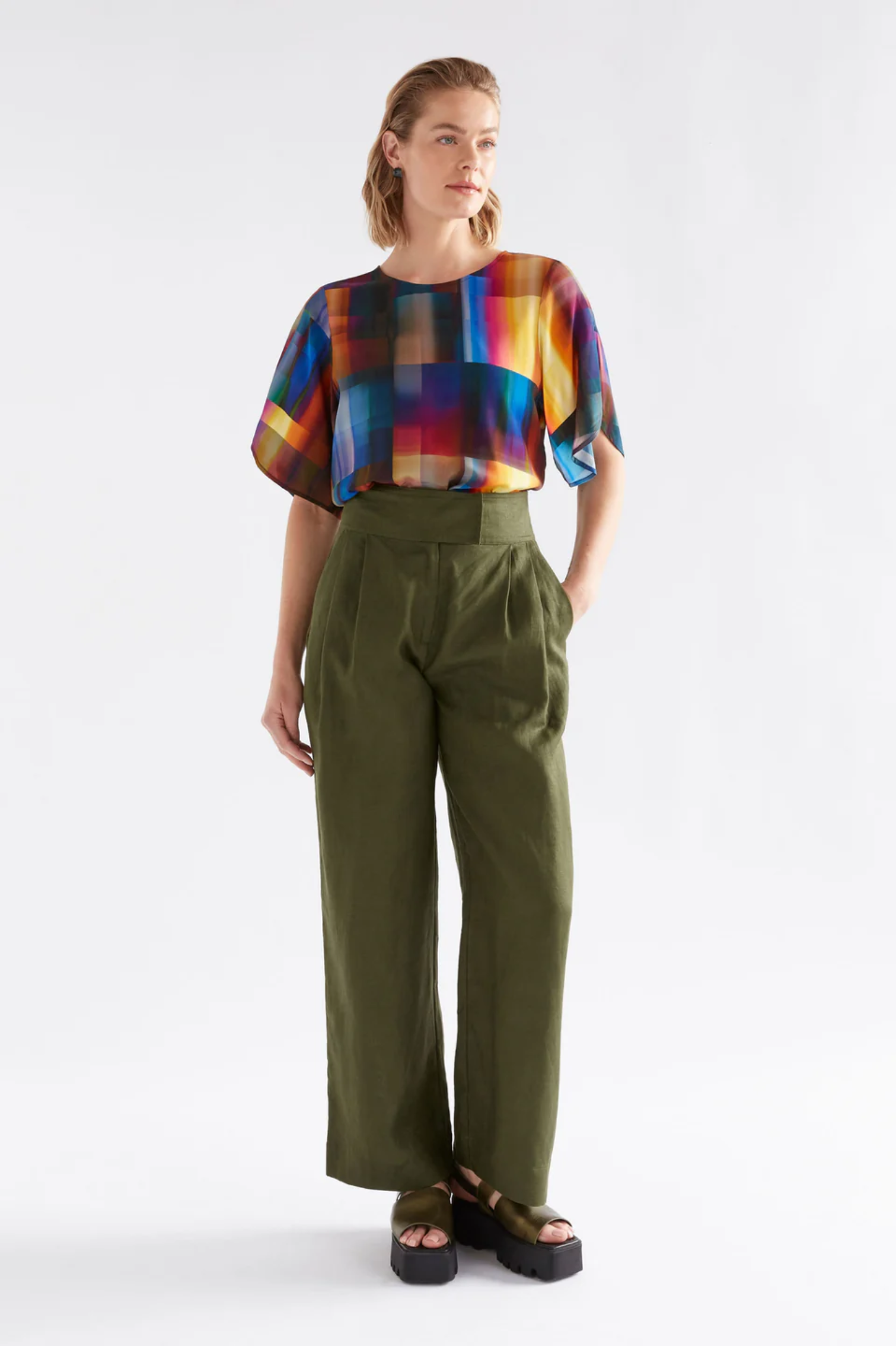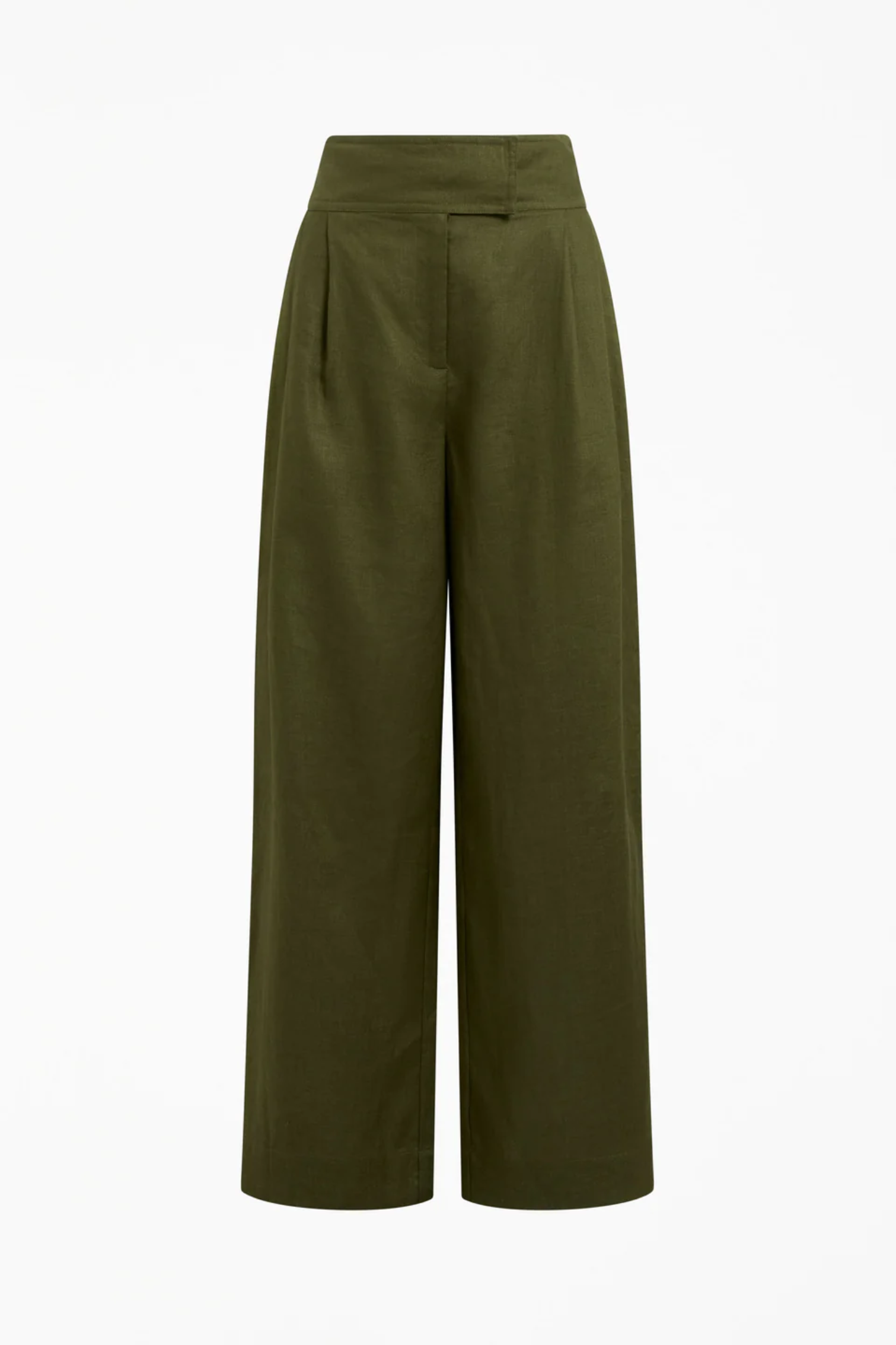The Lejer Pant features a high-rise waist with a straight leg silhouette and statement wide waistband. Crafted from a lightweight French linen that is breathable and softens with wear. Featuring a regular fit throughout, these full leg pants are finished with front pleats, angled front side seam pockets and back welt pockets. Style with more fitted tops for balanced proportions or with flowing blouses and tops tucked in for work-to-weekend outfitting.