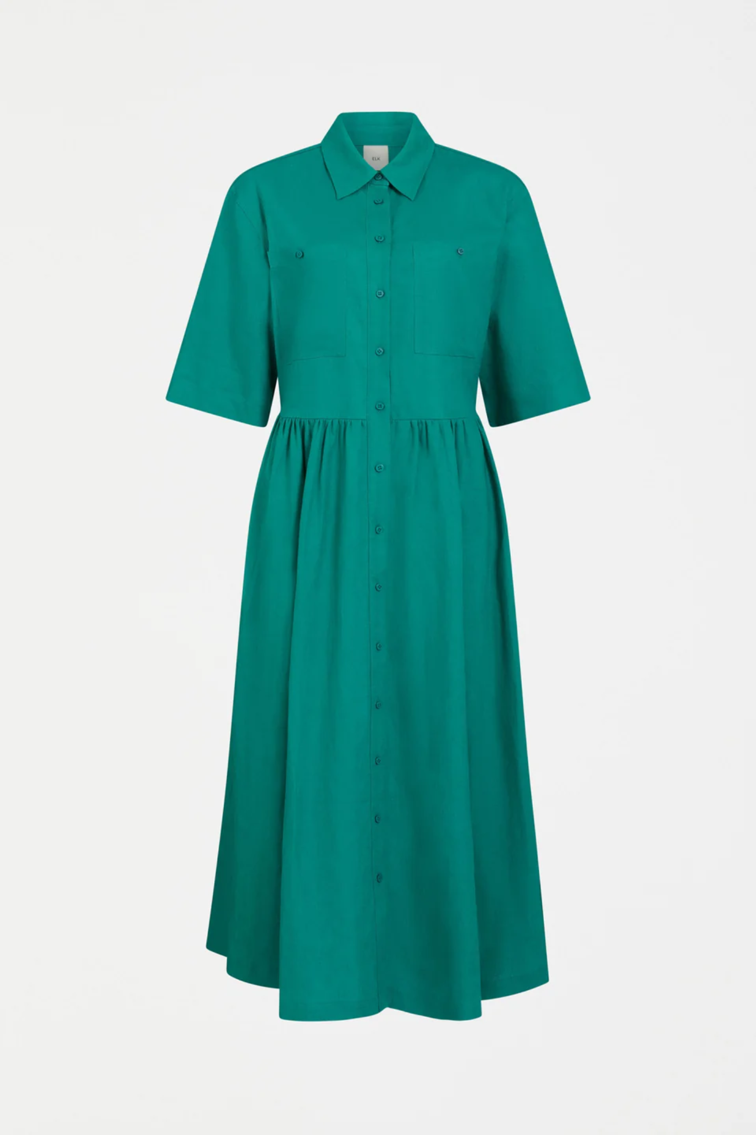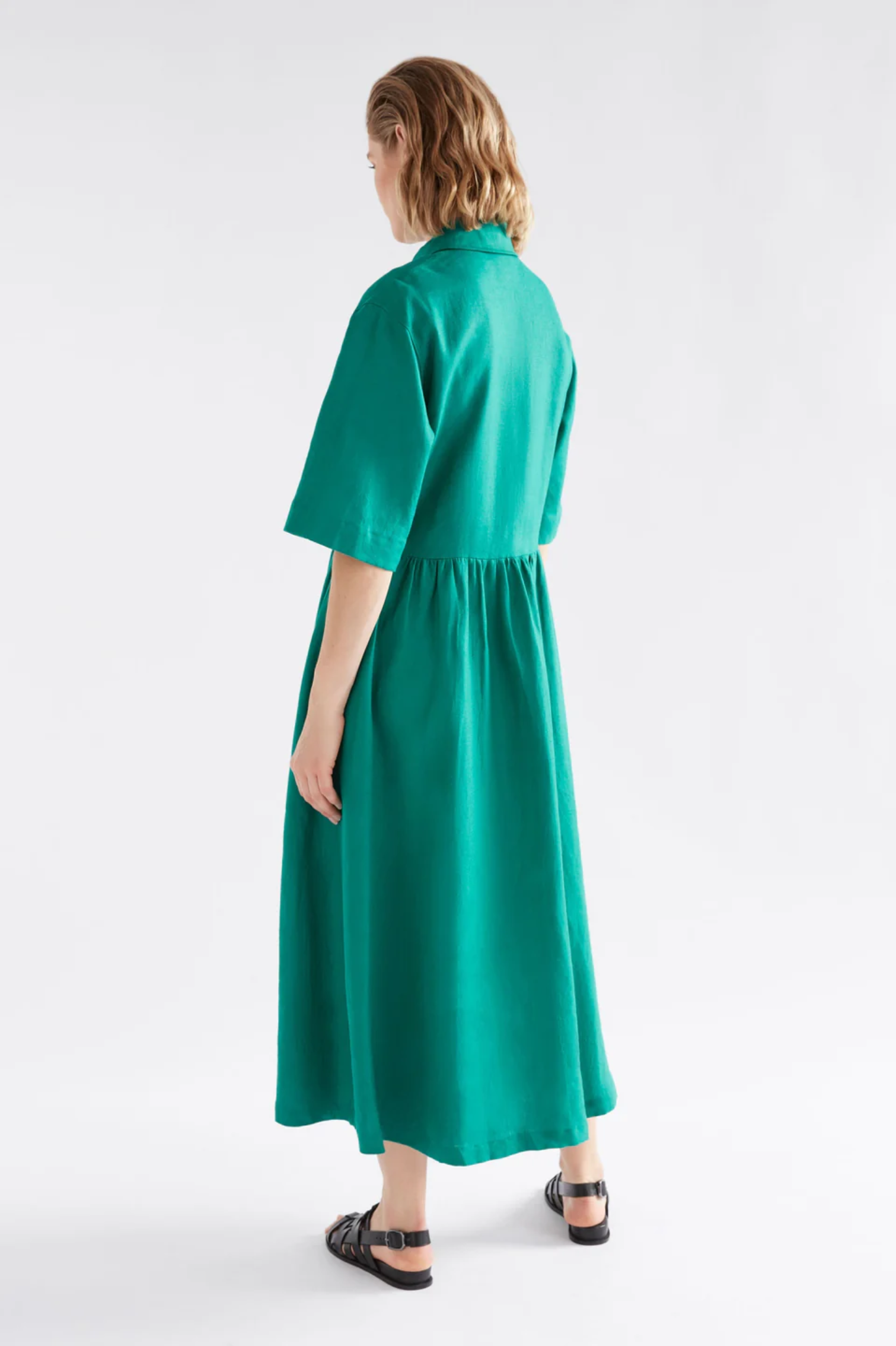 The Llinen Light Dress redefines relaxed elegance in 100% French linen. This shirt dress features a button through design and collar, flowing into A-line silhouette with a gathered skirt. A mid to long length dress with flattering elbow length sleeves and two chest patch pockets. French linen is durable and slightly textured and will soften with wear. Your new go-to-spring-summer piece. Style with our Jyrti Platform sandal or Ostt Sandal