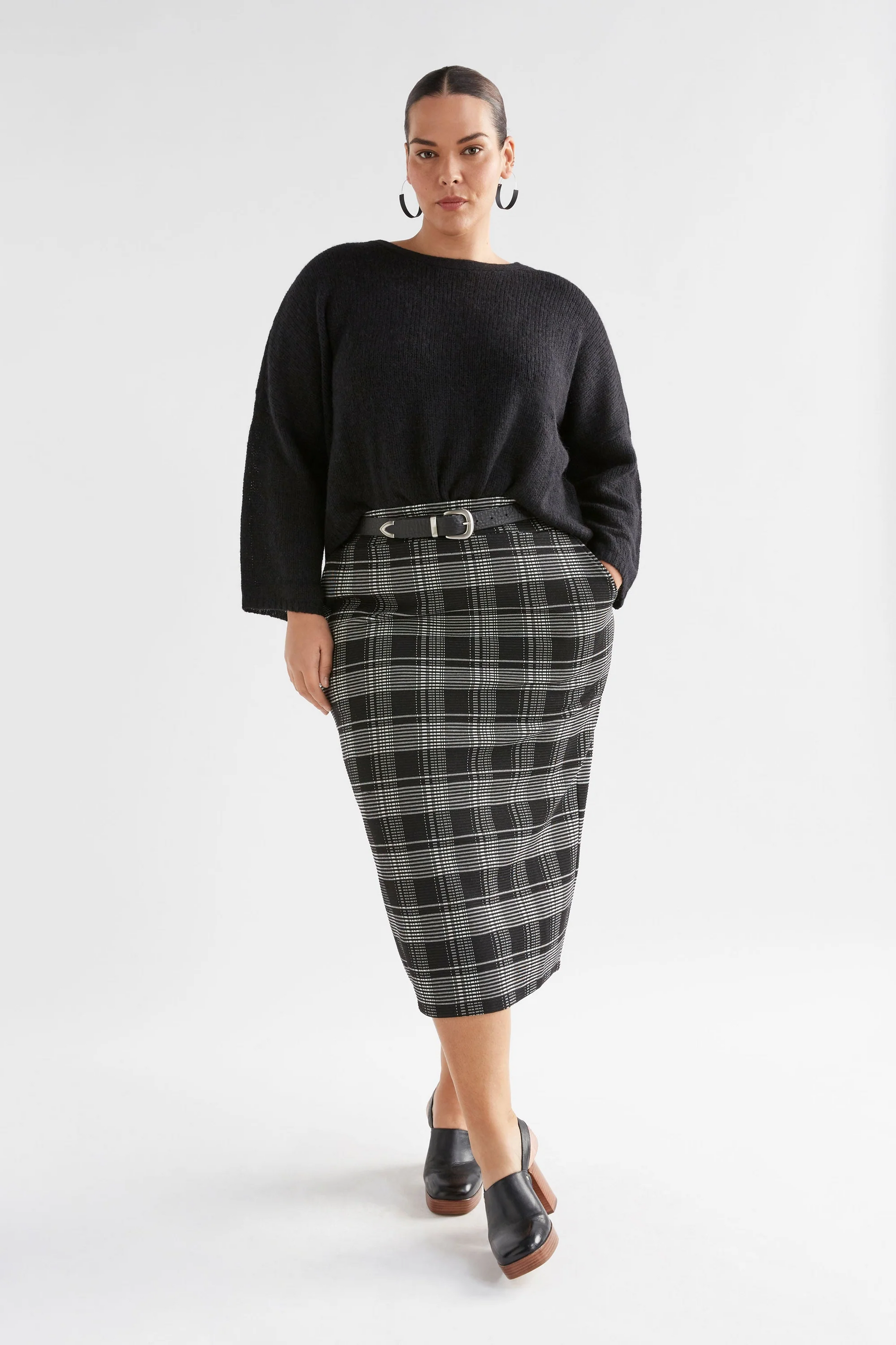 Timeless hues and textured jacquard knit come together to create the Mairea Skirt. This longer-line, black-and-white check skirt is crafted from premium ottoman double-knit fabric with just the right amount of stretch for comfort and ease. Designed with a back split for movement and front pockets for practicality, it features an encased elastic waistband for a flattering, easy fit. Complete the look by pairing with the matching Mairea T-shirt for a cohesive, head-to-toe ensemble, or layer with the Musse Sweater for added tactility.
