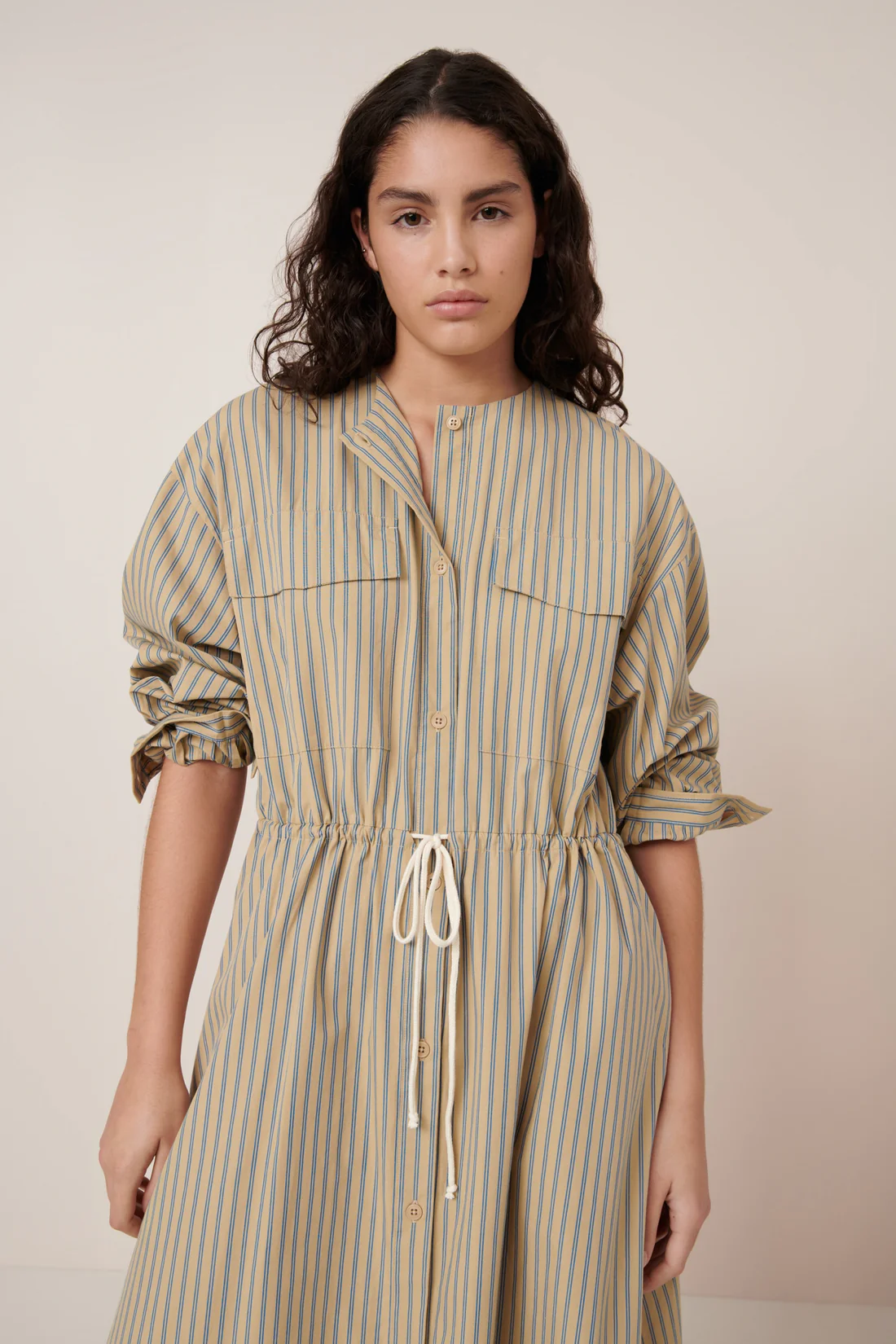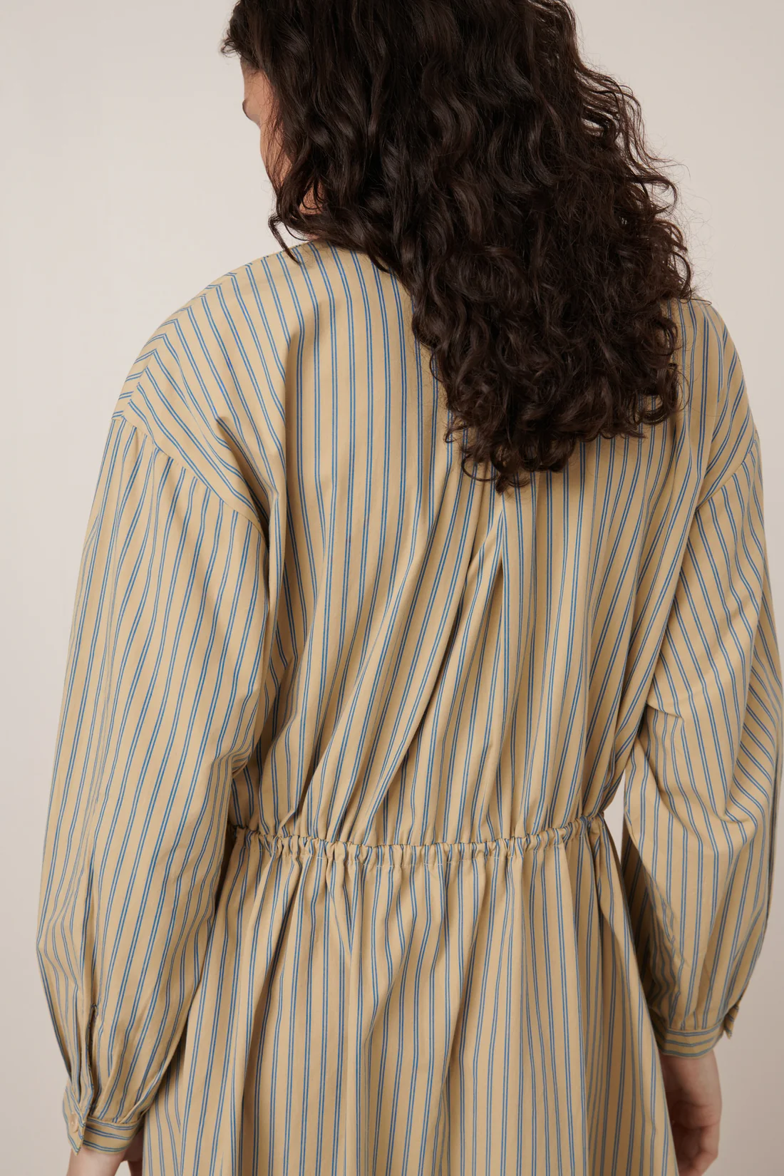 Defined by its utilitarian detailing, the Array Dress features oversized front pockets, a back pleat, and a slightly dropped waist. Designed for an oversized fit, it has a functional waist drawcord for versatile styling. Finished with side seam pockets and fastened with nut buttons through the front, this dress is craft from our double pinstripe organic cotton poplin shirting.