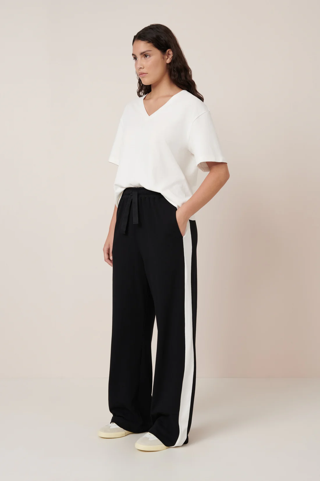 A casual trackpant style detailed with an exaggerated contrast stripe, inspired by vintage tuxedo trousers. The Contrast Trackpants have a straight leg with a relaxed, high-rise fit. Made from heavy-weight organic cotton jersey, they have a comfortable elastic waistband, a functional drawcord and inseam pockets.