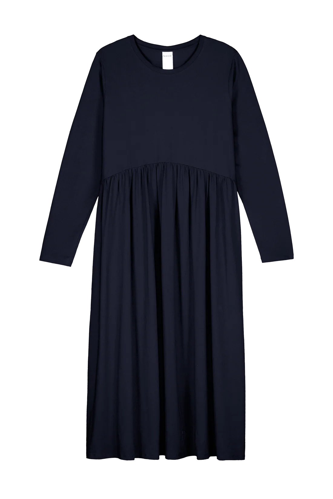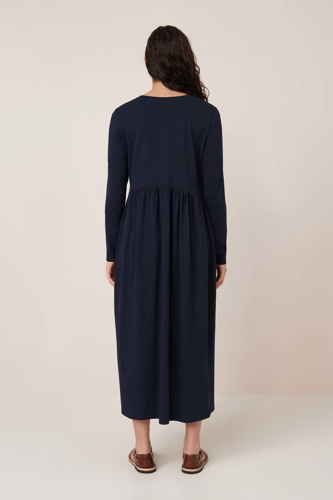 The Long Sleeve Gather Dress is a simple yet elegant dress, relaxed through the body with close-fitting long sleeves. It features a curved, gathered waist that adds fullness and is crafted from mid-weight organic cotton jersey.