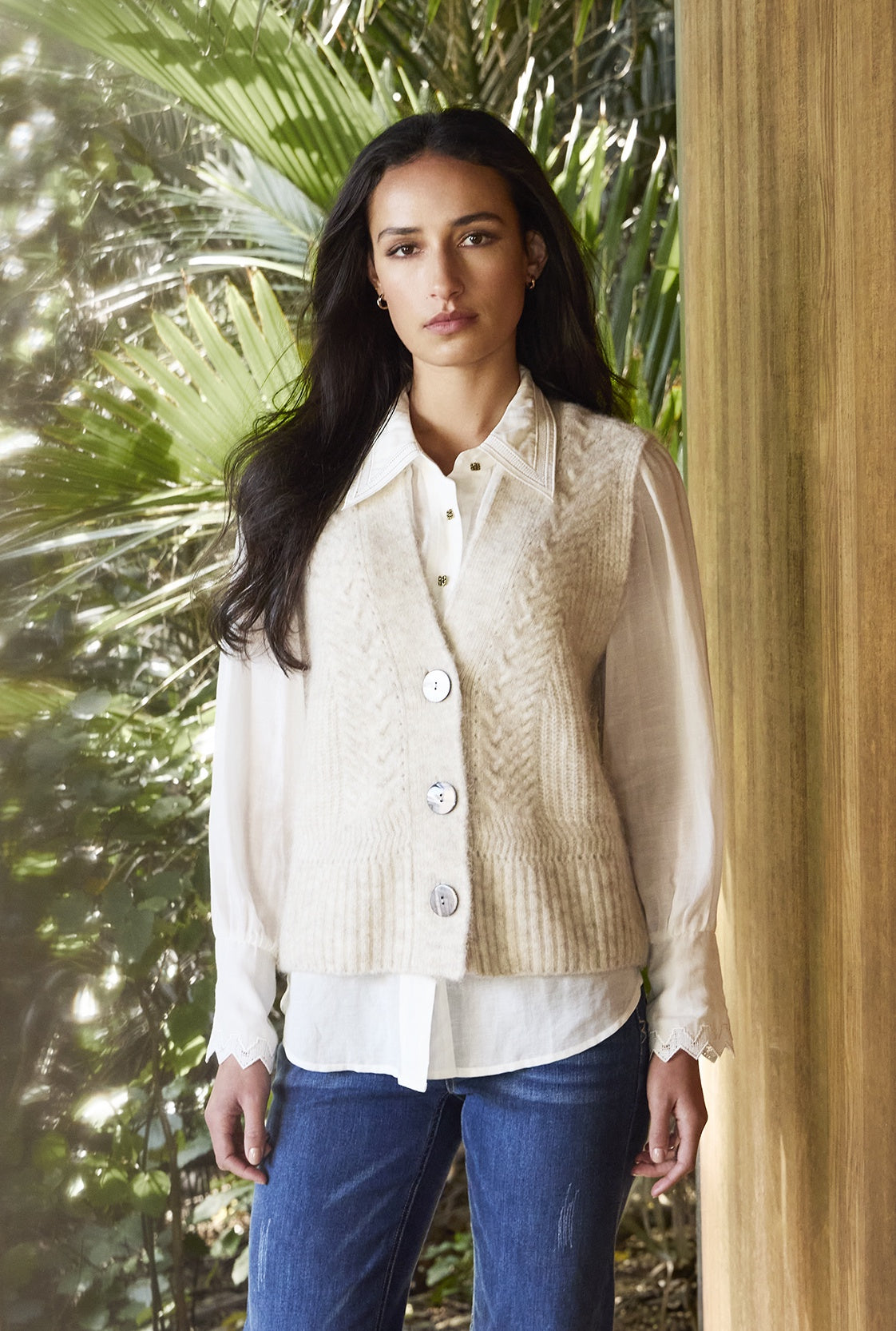 Elevate your style with the Brand Vest, crafted from a soft wool and mohair blend. This knitted vest showcases intricate detailing and is adorned with smoke shell buttons, perfect for layering this season.