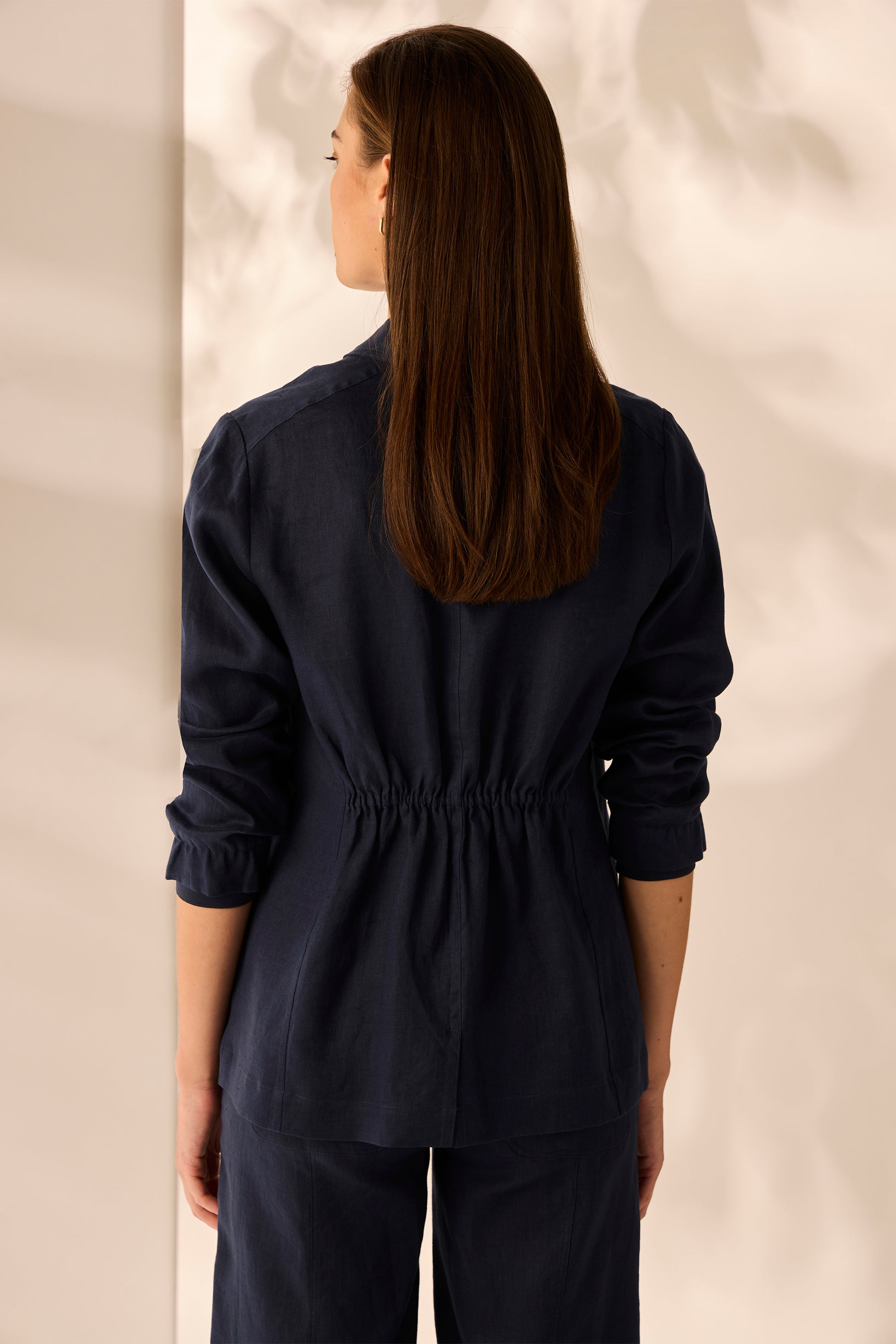 The Hayden Jacket is a smart-casual staple, crafted from breathable linen and designed for effortless style. Featuring refined pin-tuck detailing at the front, ribbed cuffs, and an elasticated back waist, it offers a flattering silhouette with a relaxed, modern feel—perfect for layering through the seasons.