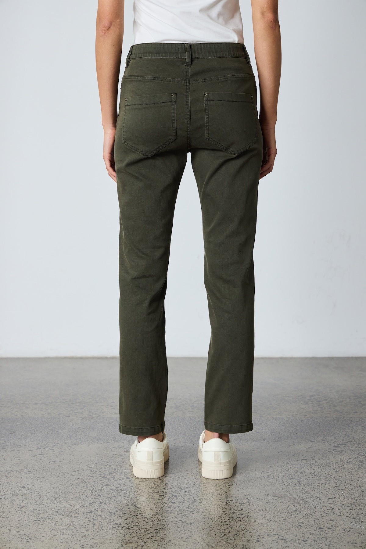 A five-pocket mid-rise jean in a super stretchy denim featuring contrast embroidered stitching around pocket openings and our signature stretch waist construction for superior fit and comfort. 7/8 length, straight leg fit.