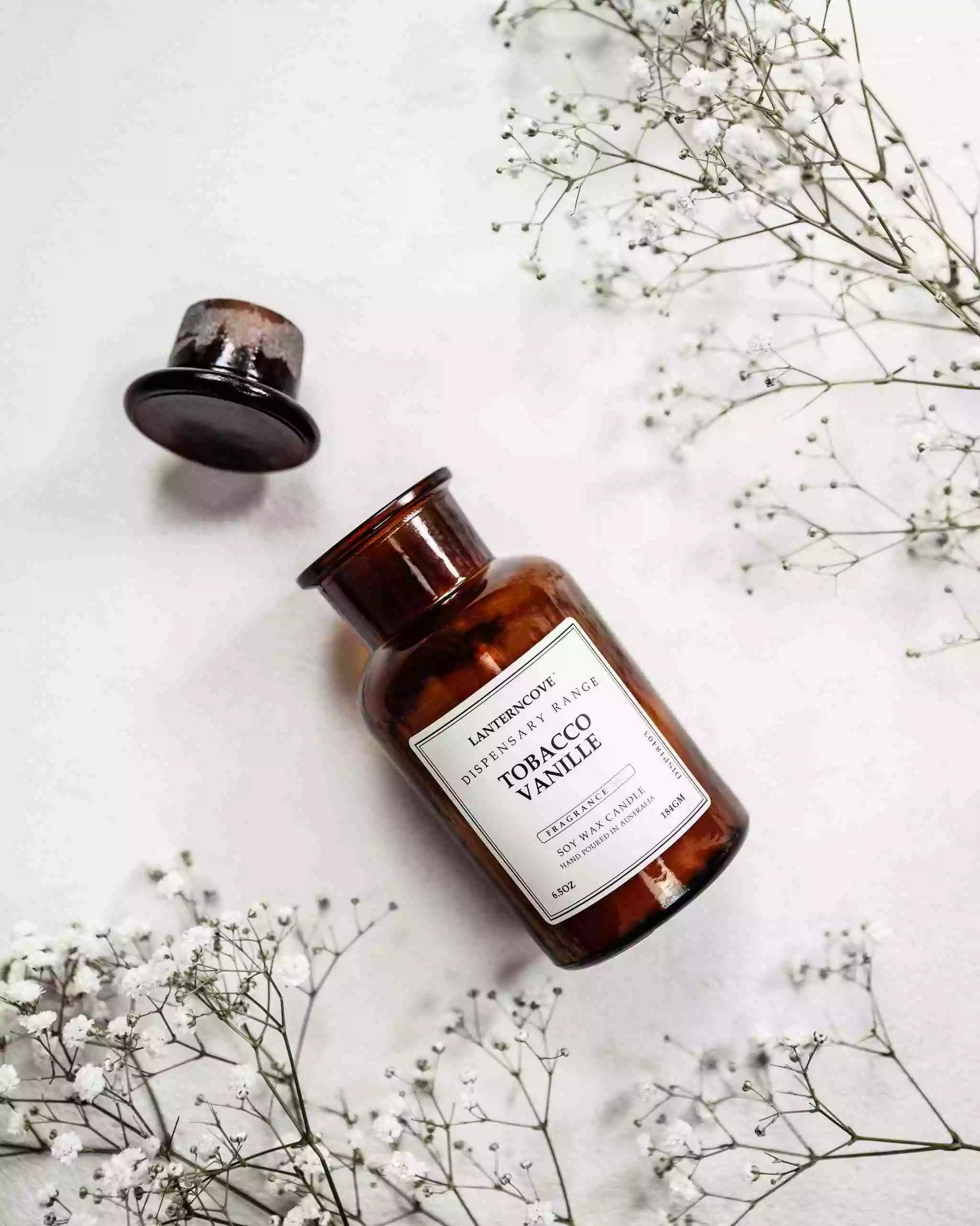 Hand-poured right here in Australia, this 6.5oz (184g) brown glass candle has been filled with our rich, creamy soy wax and combined with the pleasantly warm fragrance notes of Tobacco + Vanilla .